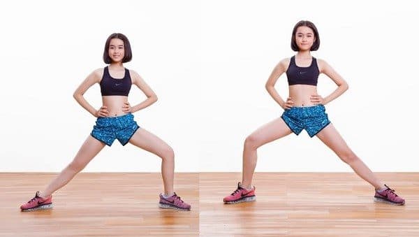 Bước 1: Đứng 2 chân rộng bằng vai, chân trái khụy, mũi chân hướng sang trái, bước rộng chân phải sang ngang, mũi chân hướng về bên phải, hai tay chống hông, hướng mặt về phía trước. Bạn sẽ thấy cơ ở 2 đùi sau, lưng được kéo căng.