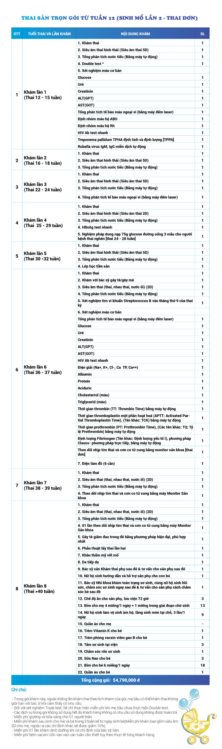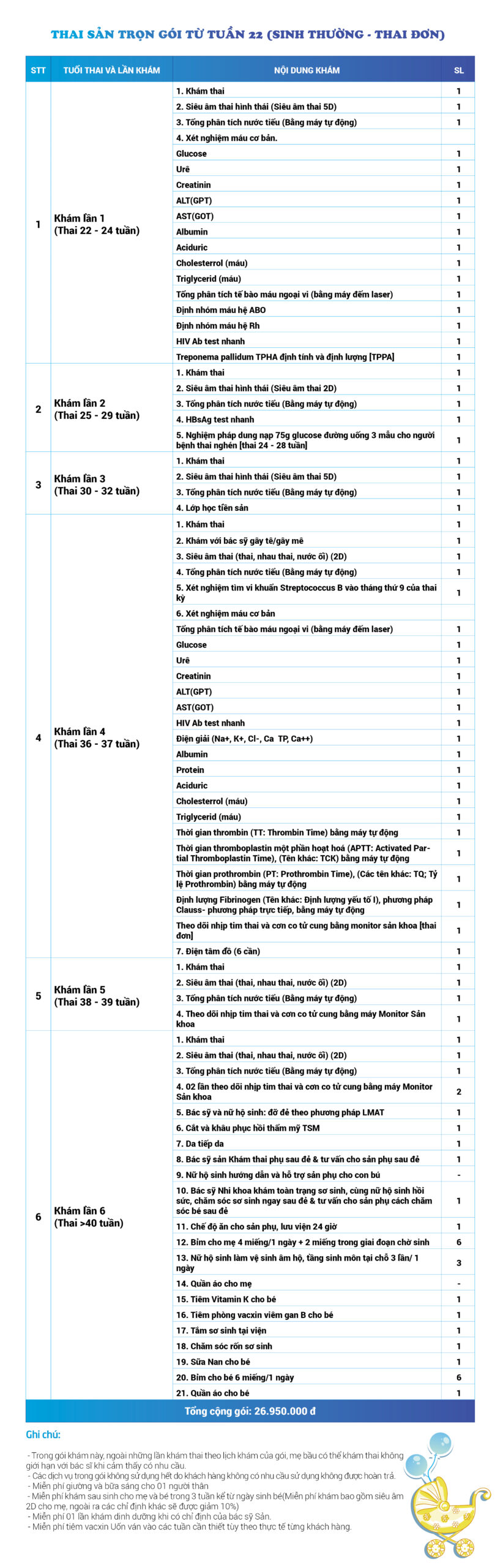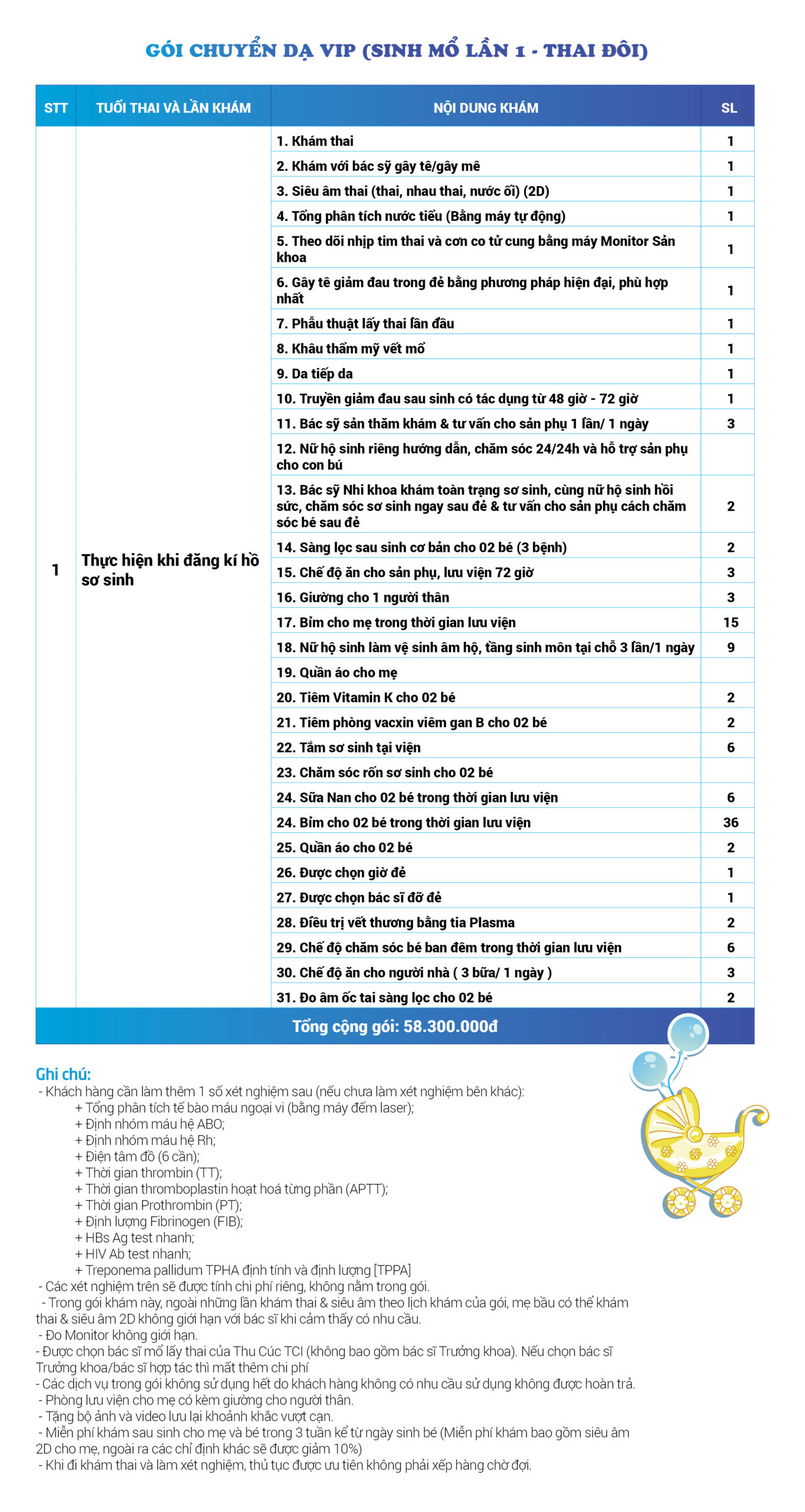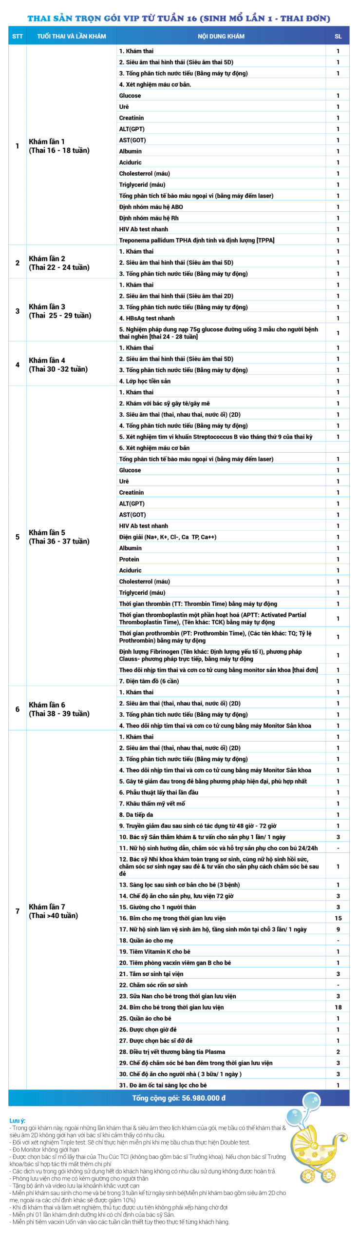 | 26 | Gói Thai sản trọn gói từ tuần 16 (Sinh mổ) - Lần 1 - Thai đơn - Gói Vip | 56.980.000 | 0 |
