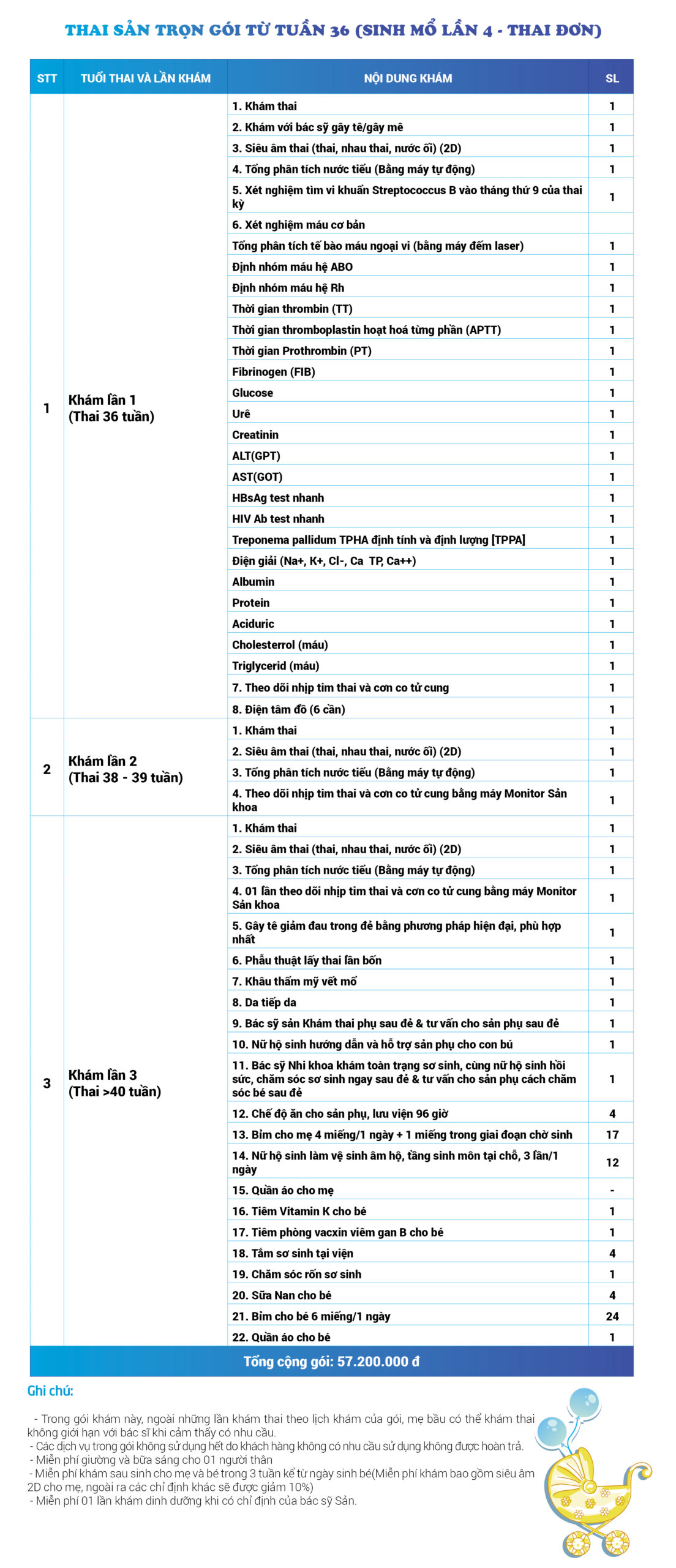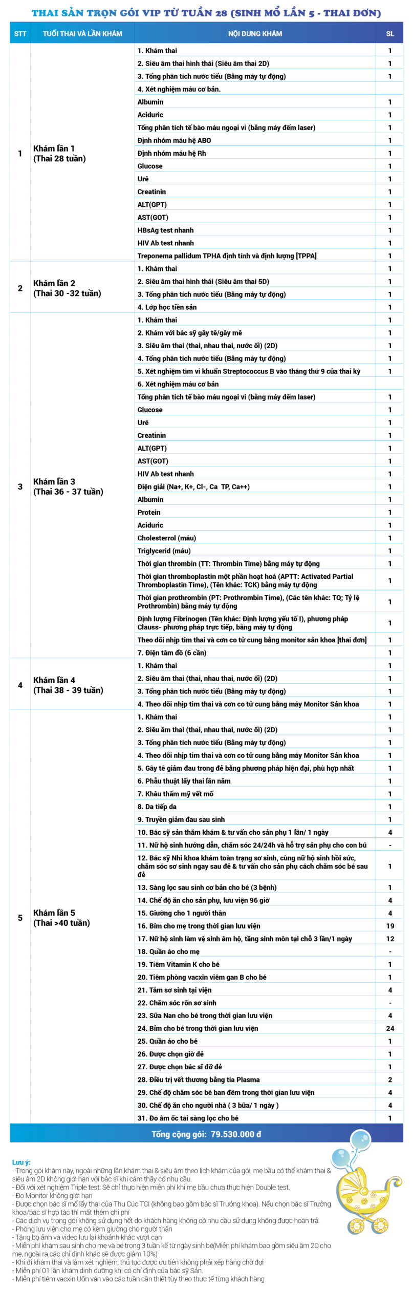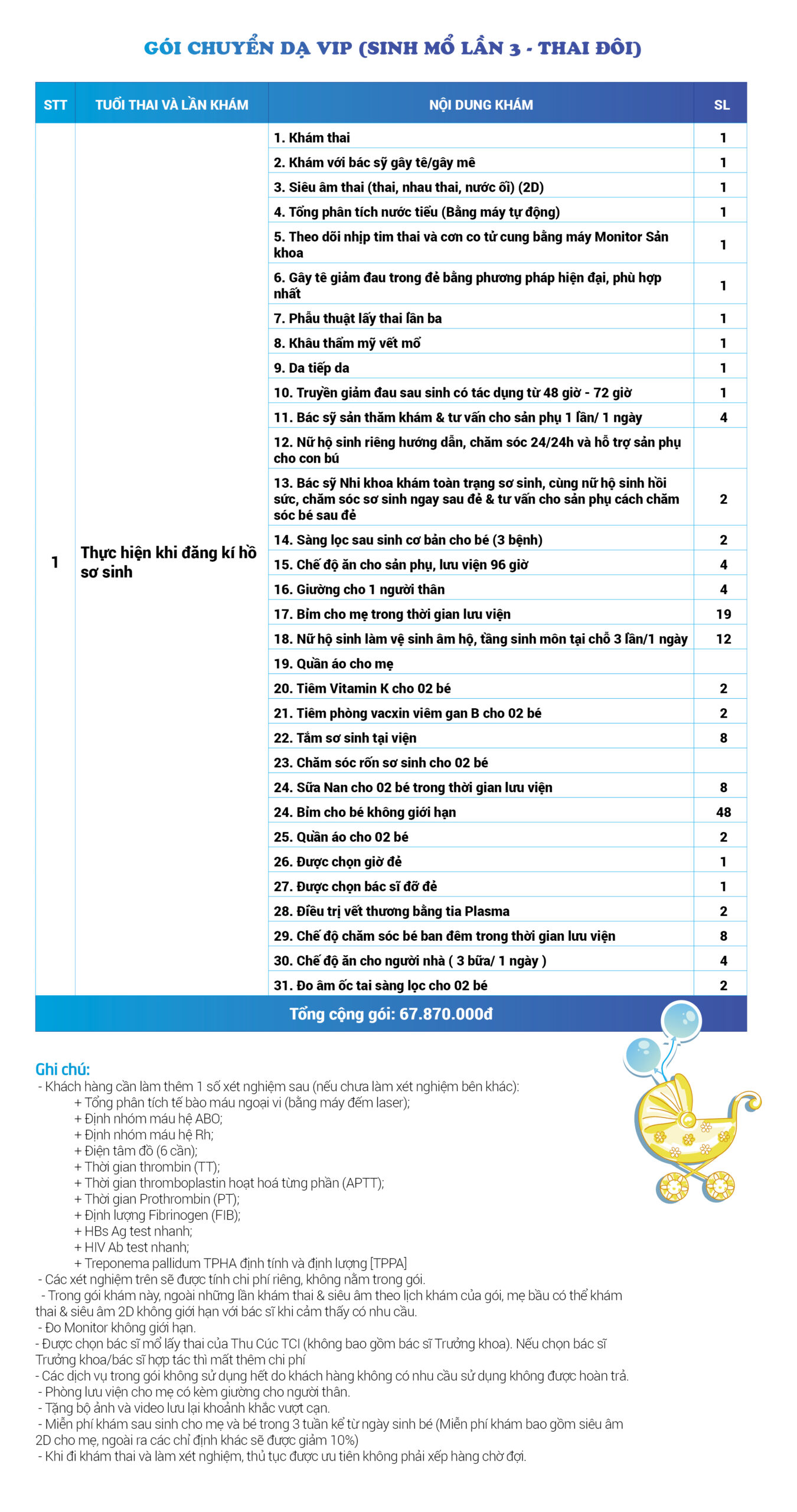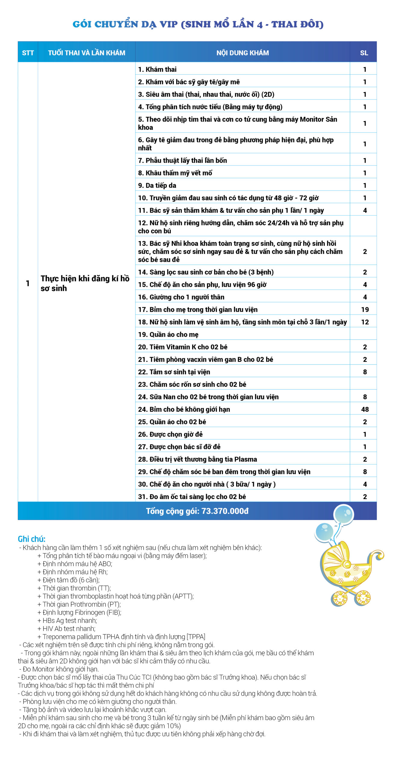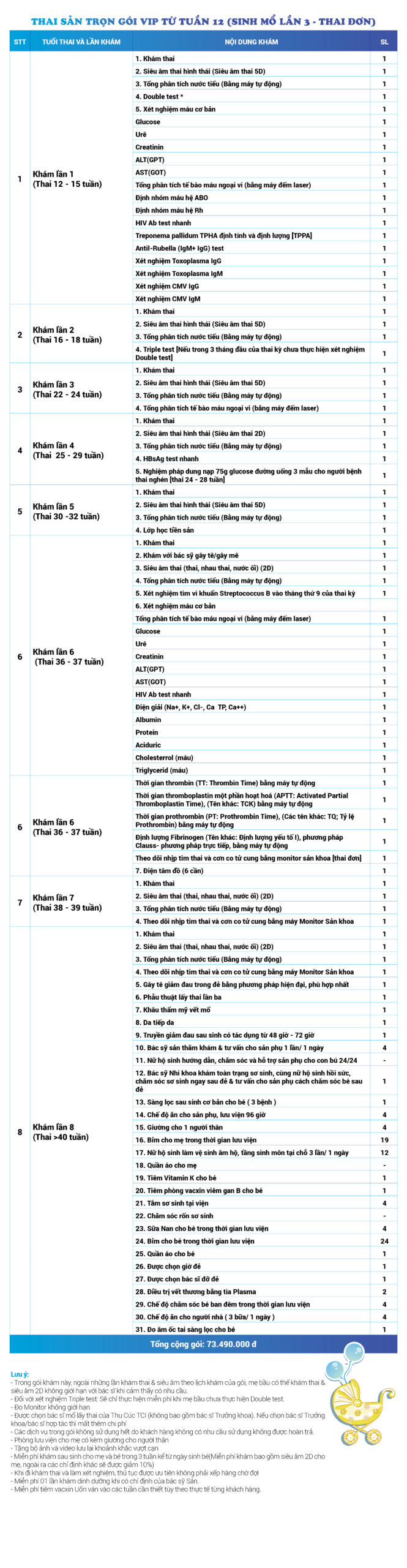 | 34 | Gói Thai sản trọn gói từ tuần 16 (Sinh mổ) - Lần 3 - Thai đôi - Gói Vip | 73.480.000 | 0 |