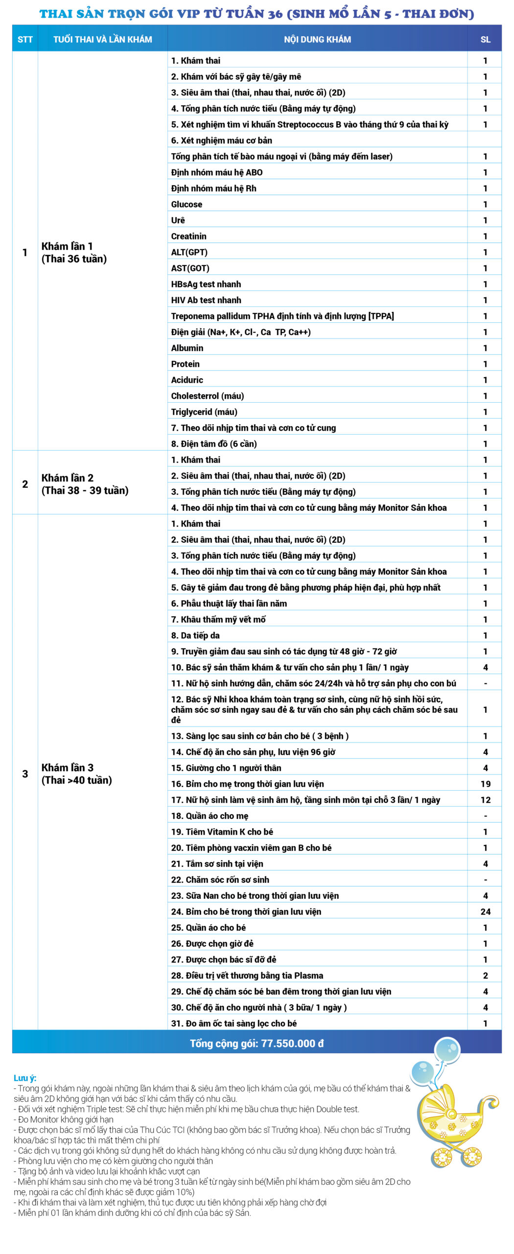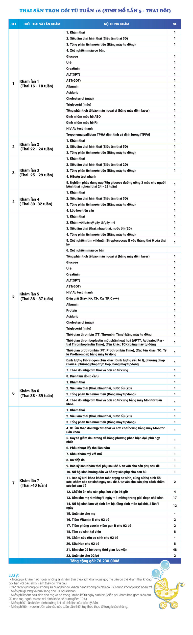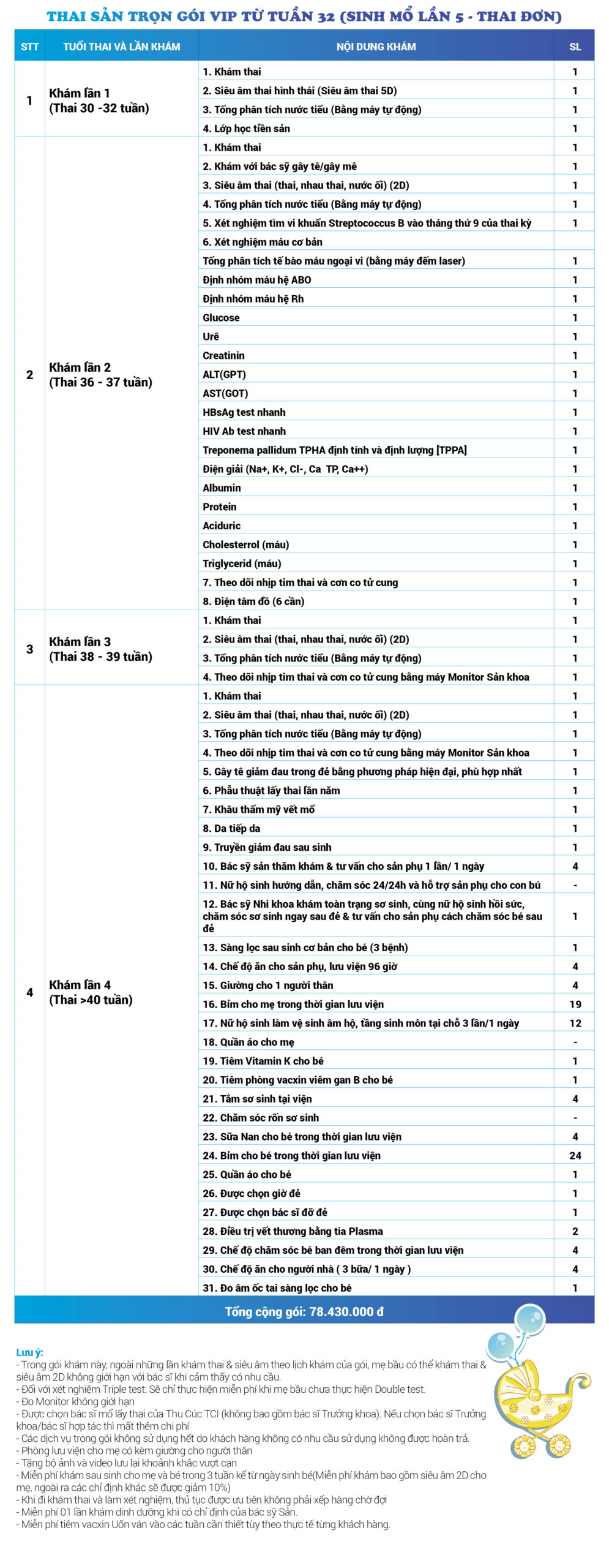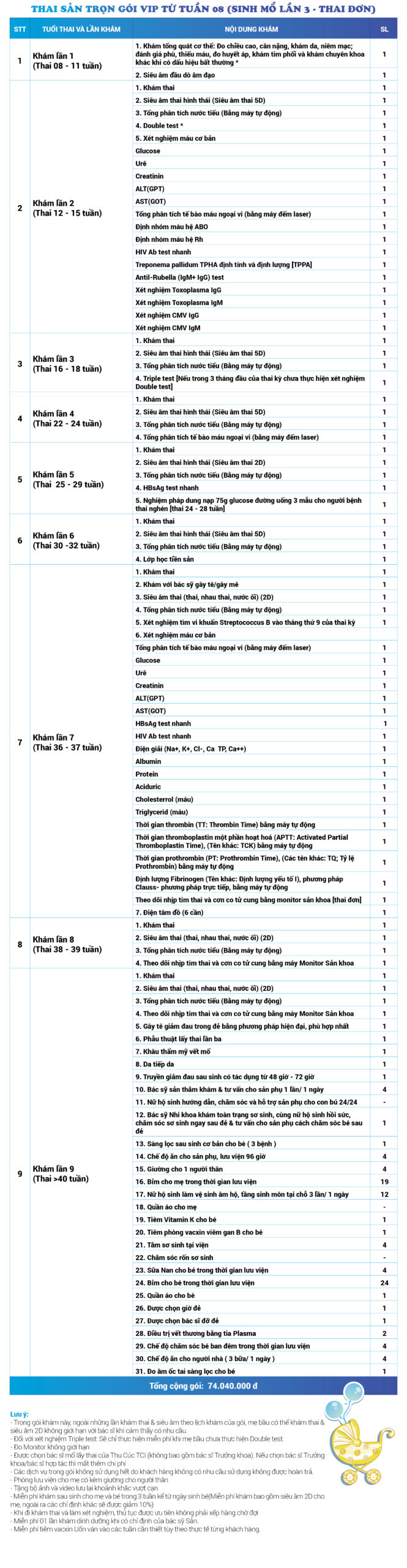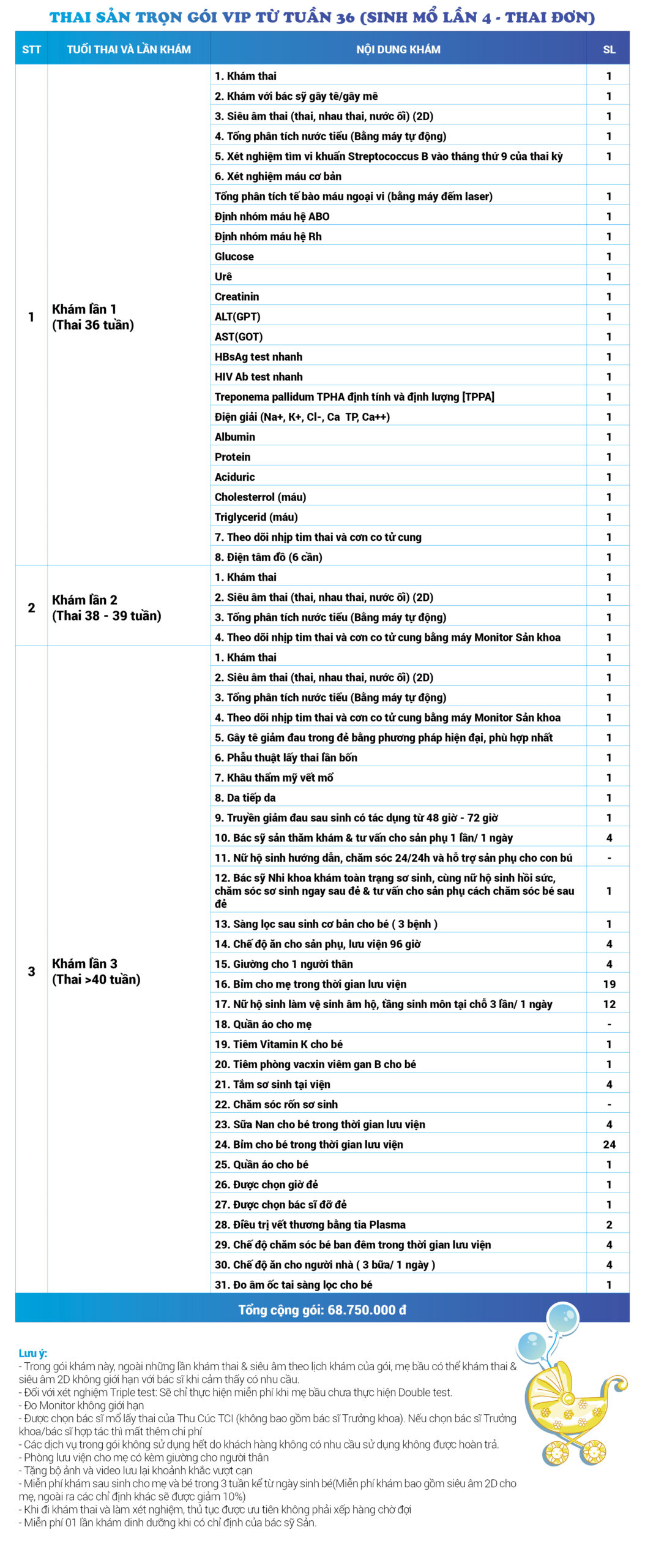 | 34 | Gói Thai sản trọn gói từ tuần 16 (Sinh mổ) - Lần 3 - Thai đôi - Gói Vip | 73.480.000 | 0 |