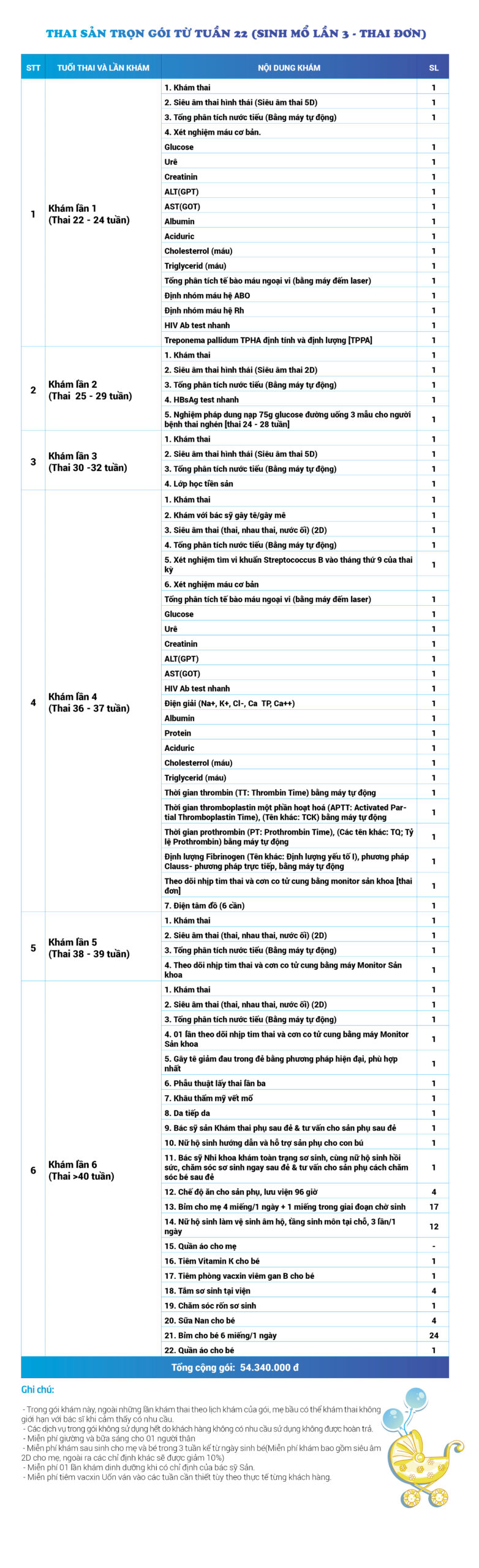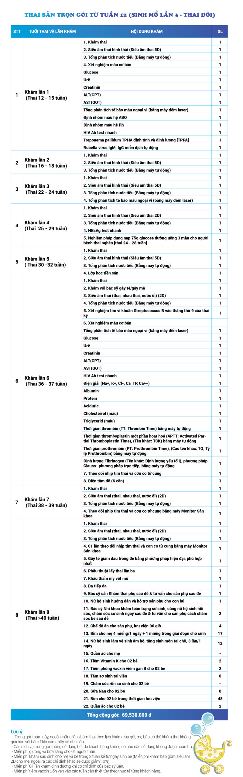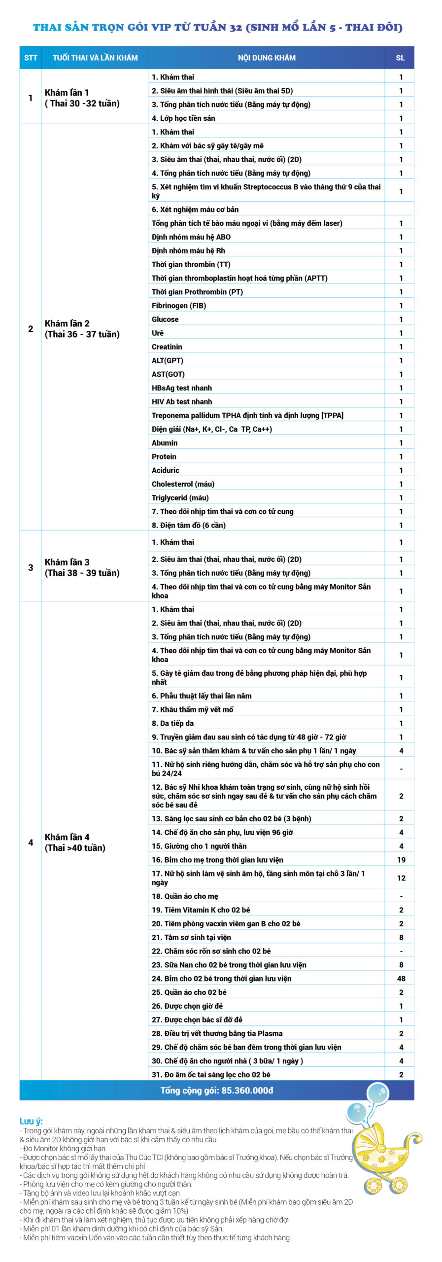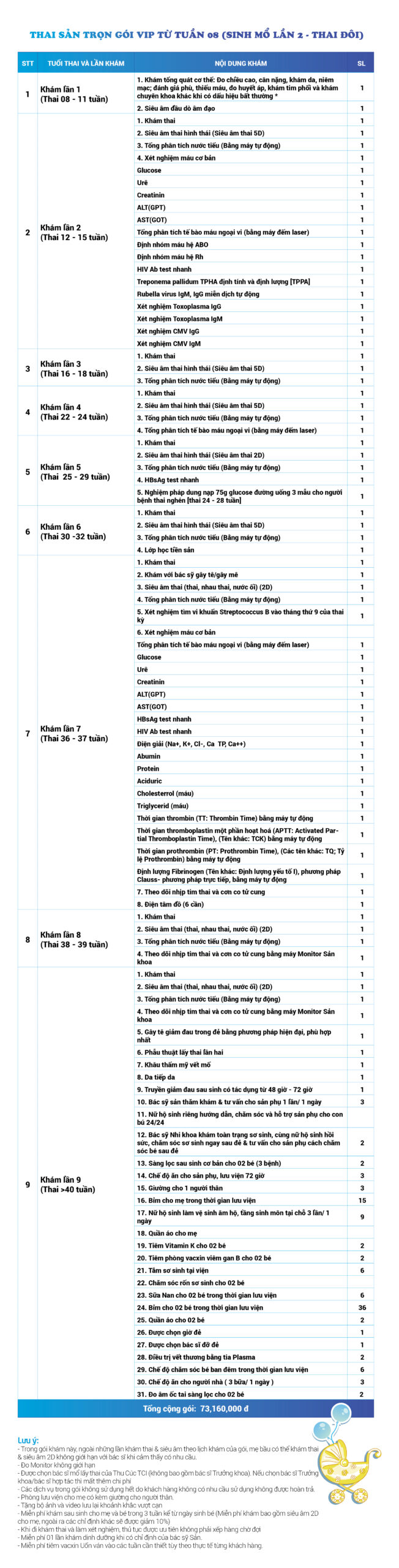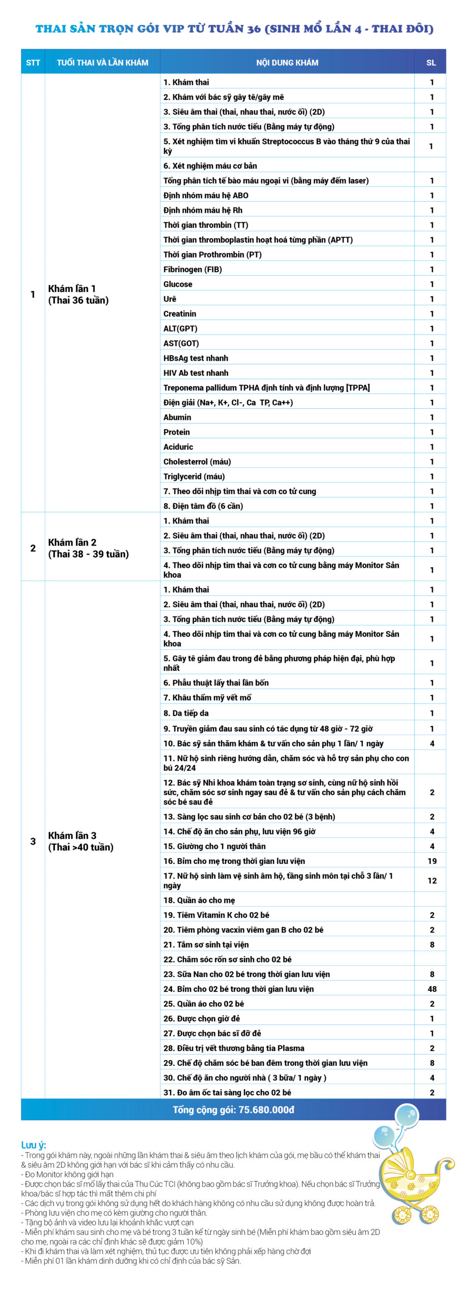 | 34 | Gói Thai sản trọn gói từ tuần 16 (Sinh mổ) - Lần 3 - Thai đôi - Gói Vip | 73.480.000 | 0 |