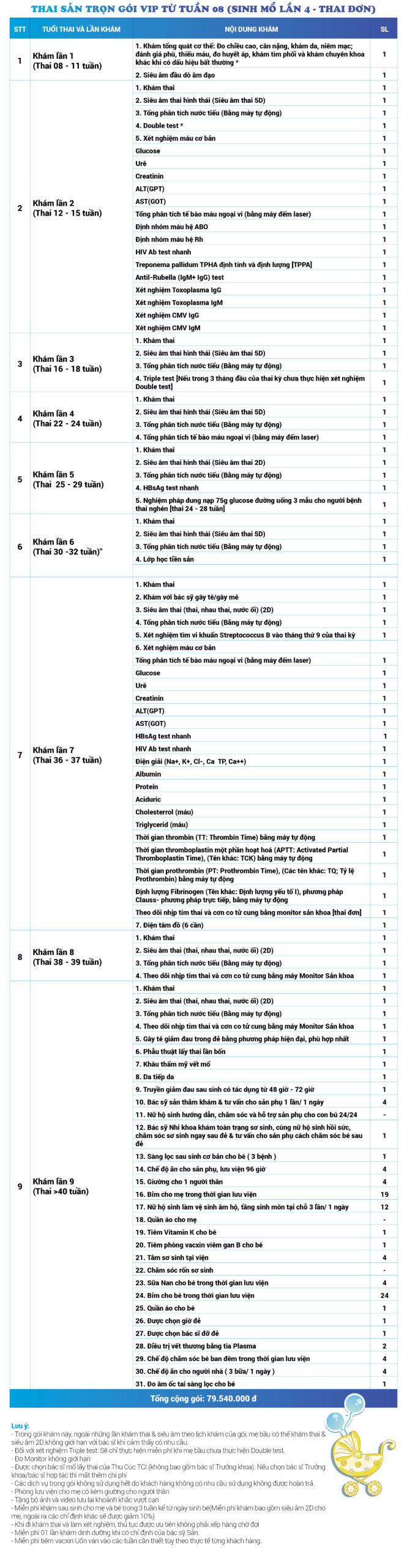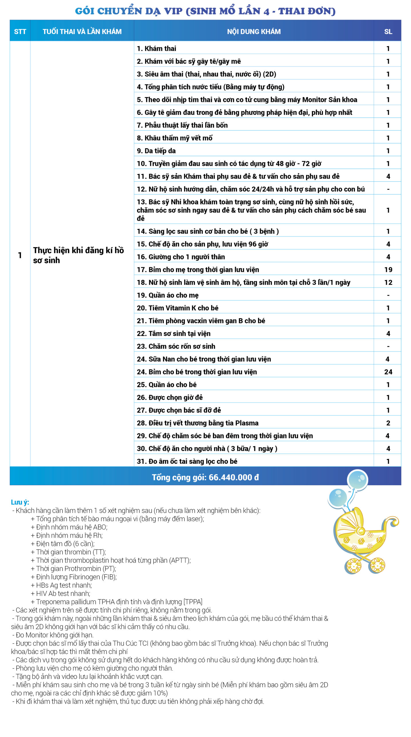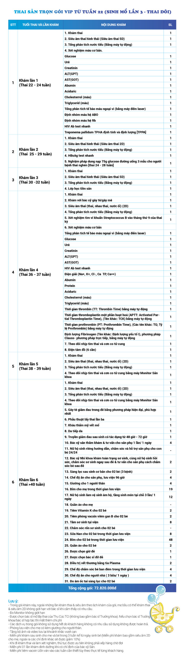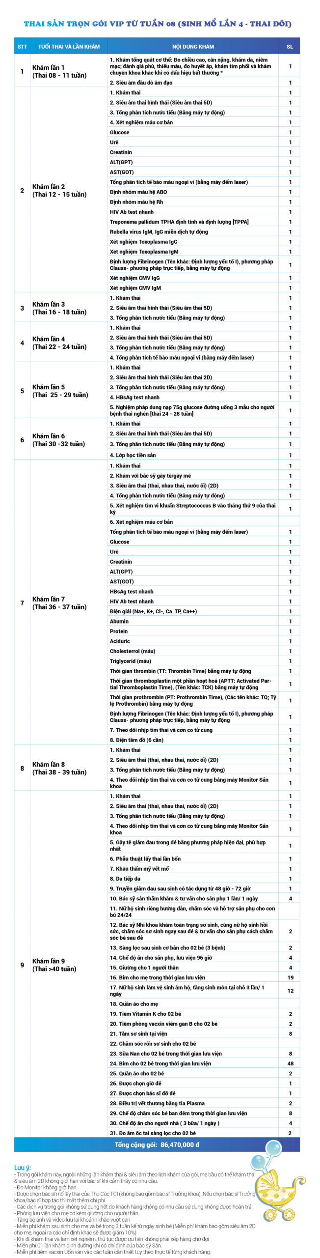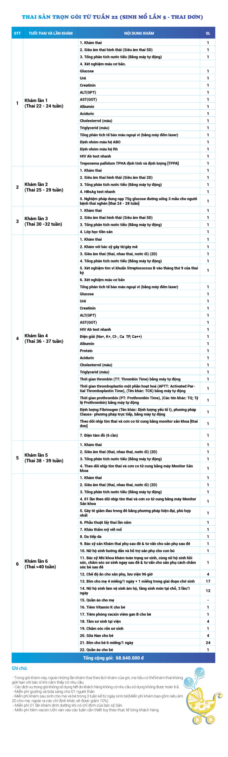 | 34 | Gói Thai sản trọn gói từ tuần 16 (Sinh mổ) - Lần 3 - Thai đôi - Gói Vip | 73.480.000 | 0 |