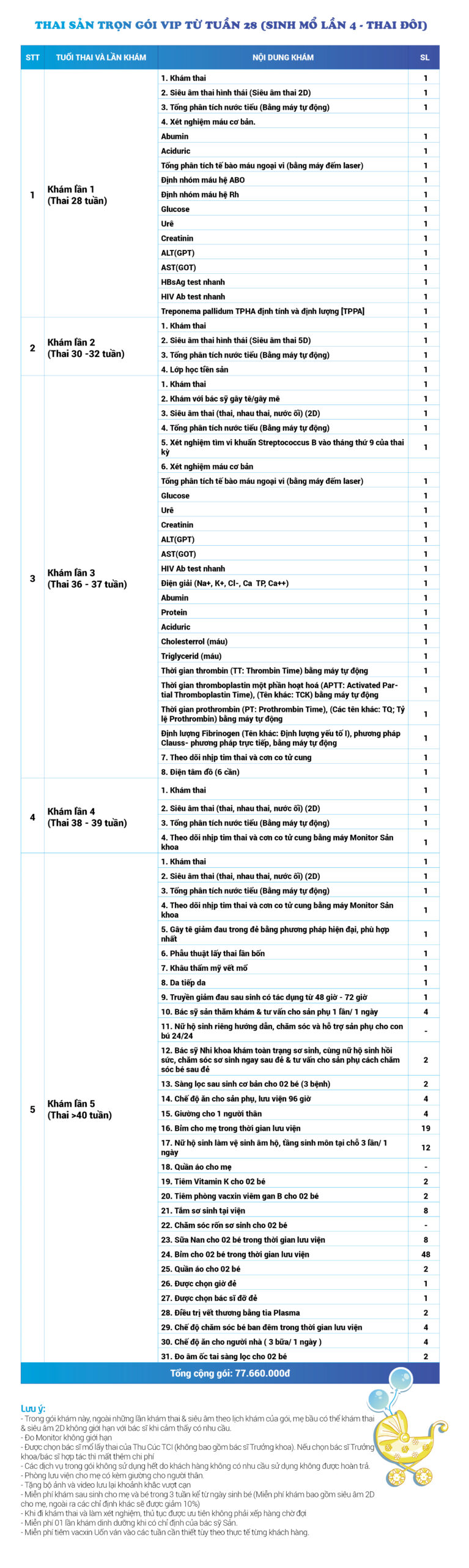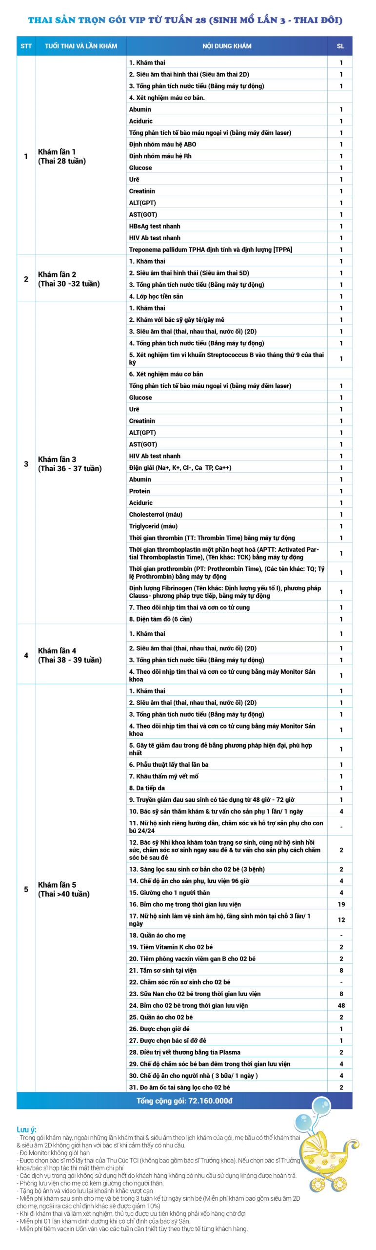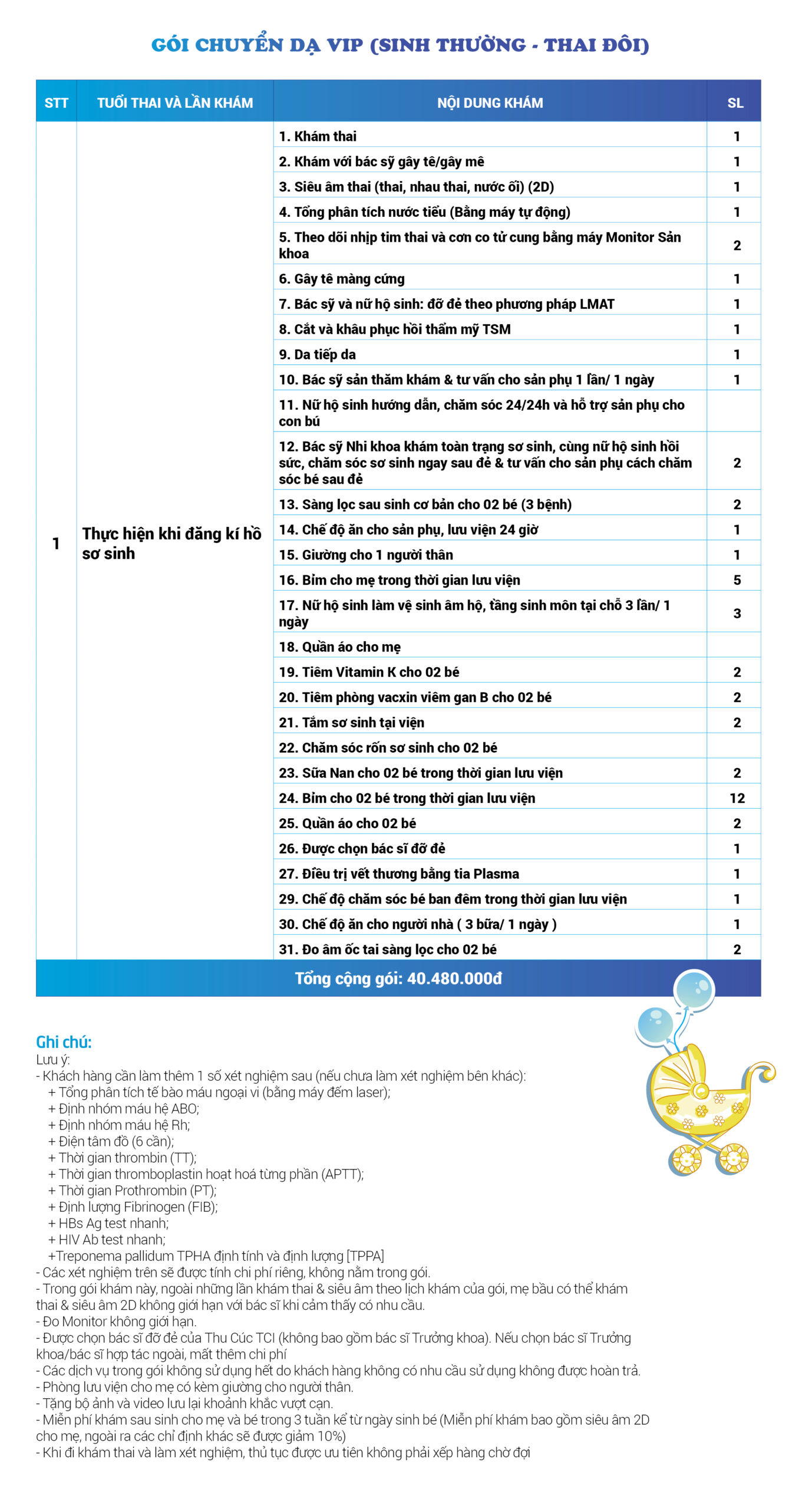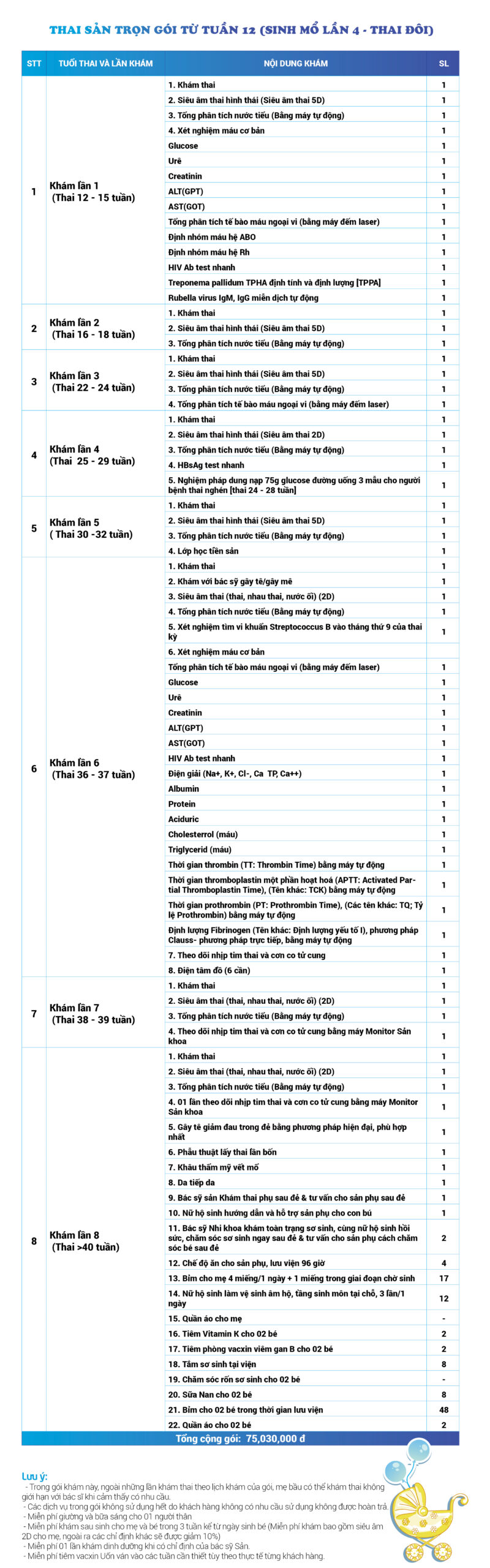 | 34 | Gói Thai sản trọn gói từ tuần 16 (Sinh mổ) - Lần 3 - Thai đôi - Gói Vip | 73.480.000 | 0 |
