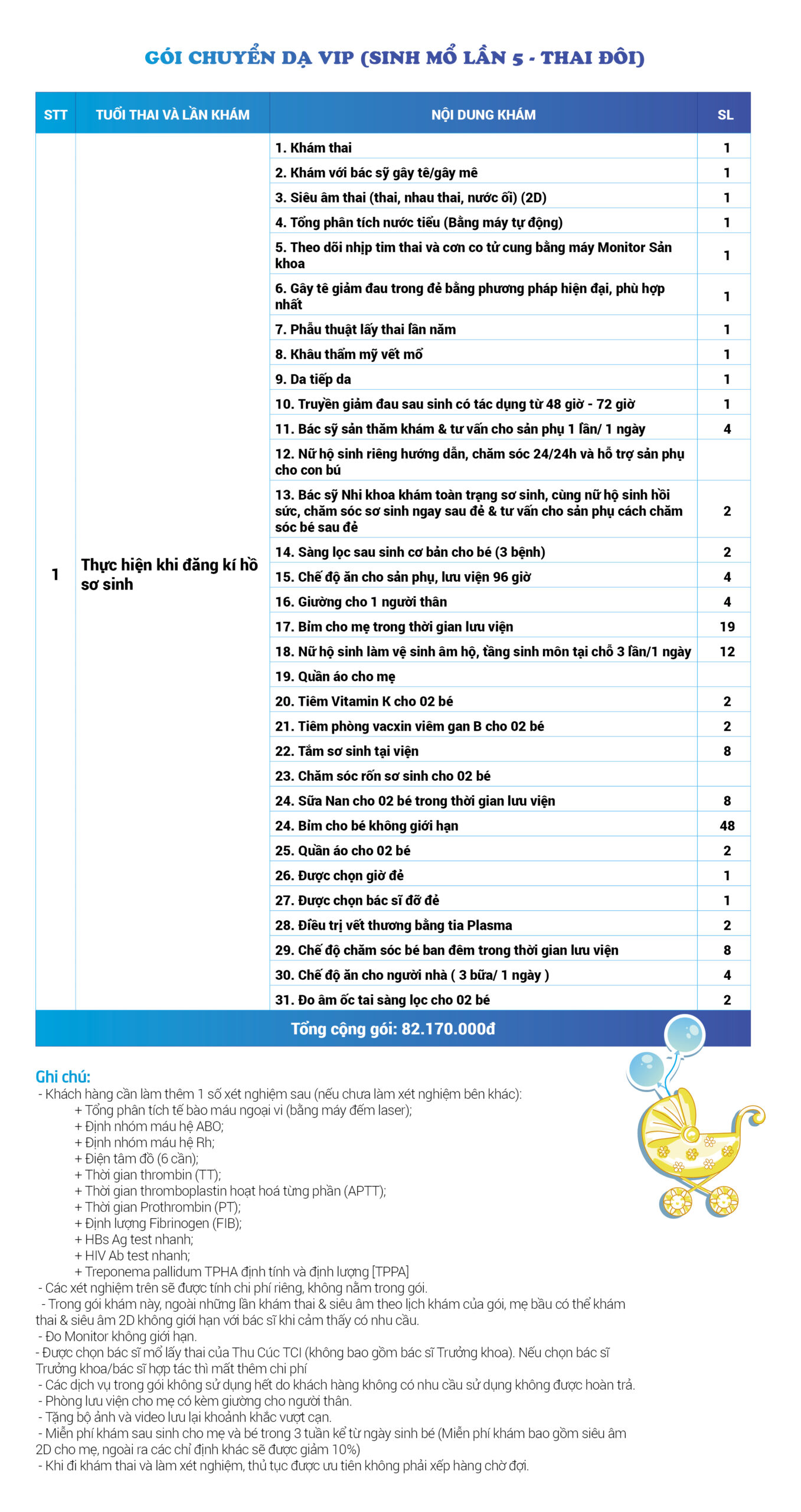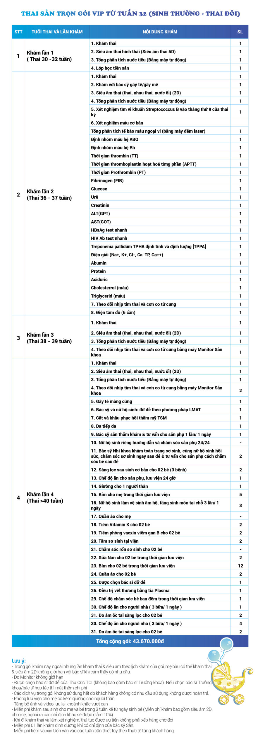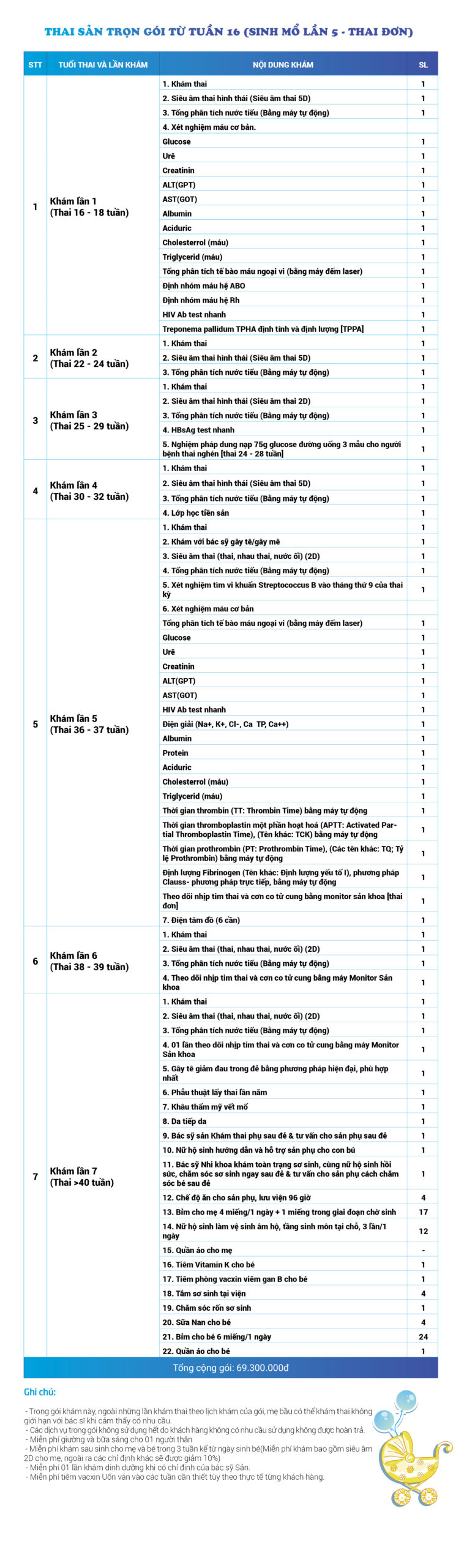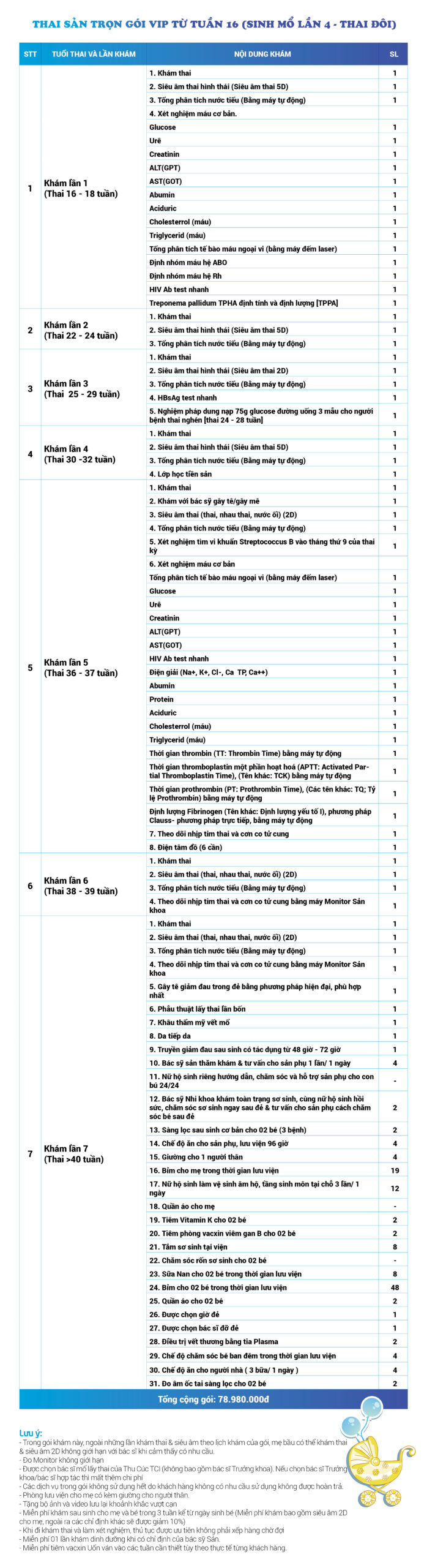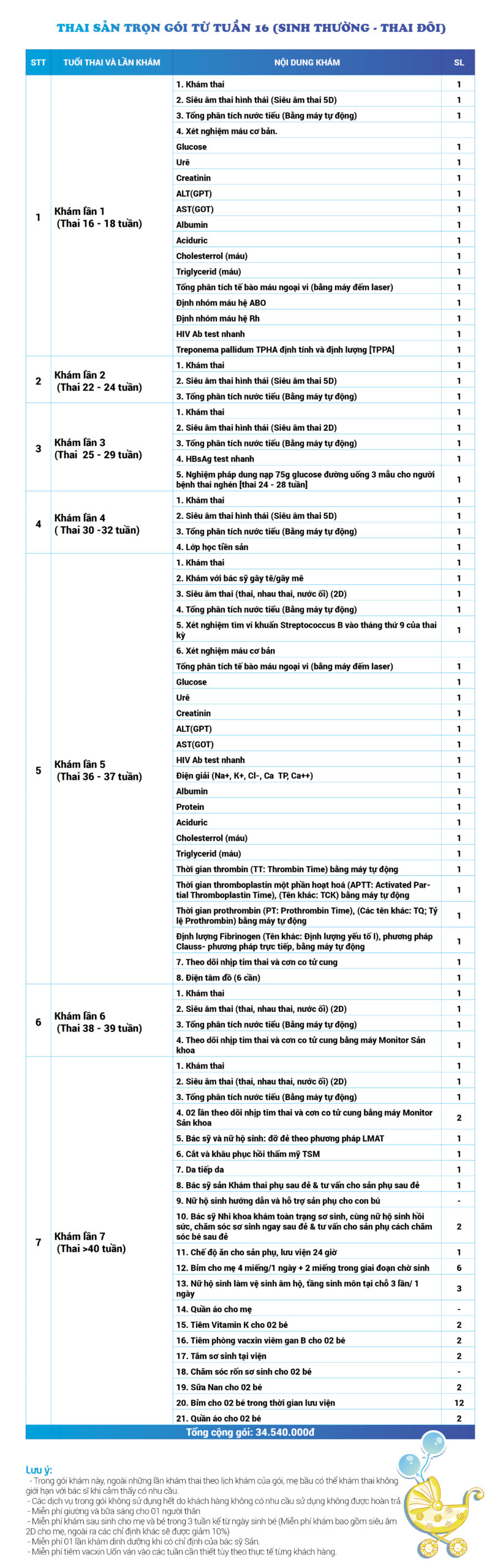 | 34 | Gói Thai sản trọn gói từ tuần 16 (Sinh mổ) - Lần 3 - Thai đôi - Gói Vip | 73.480.000 | 0 |