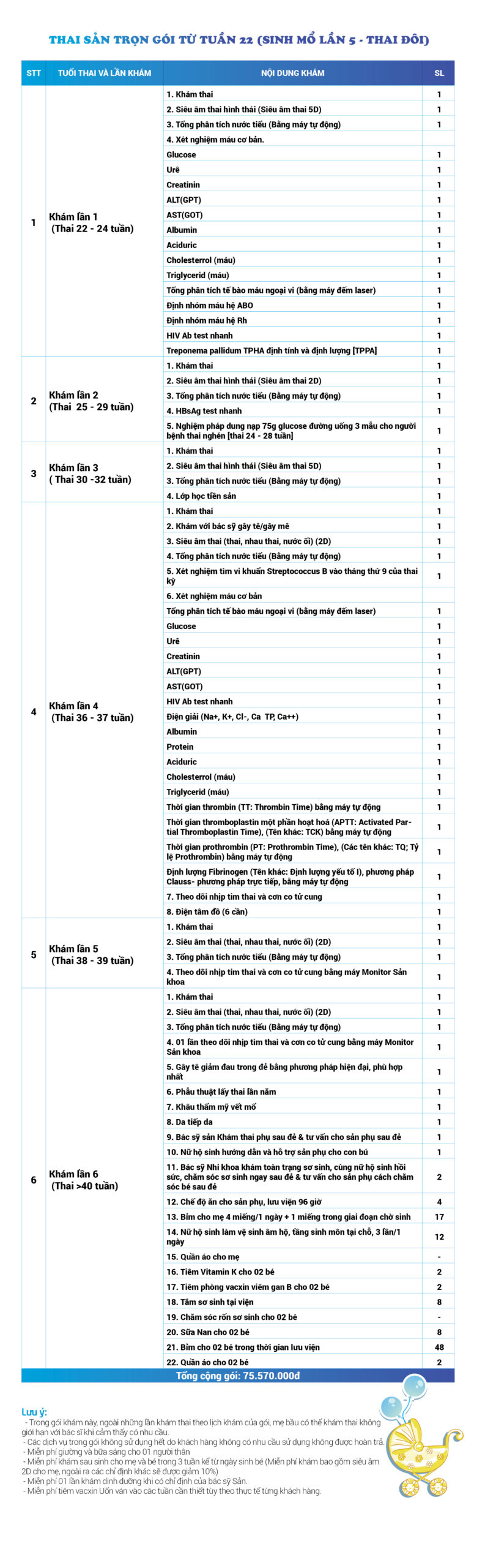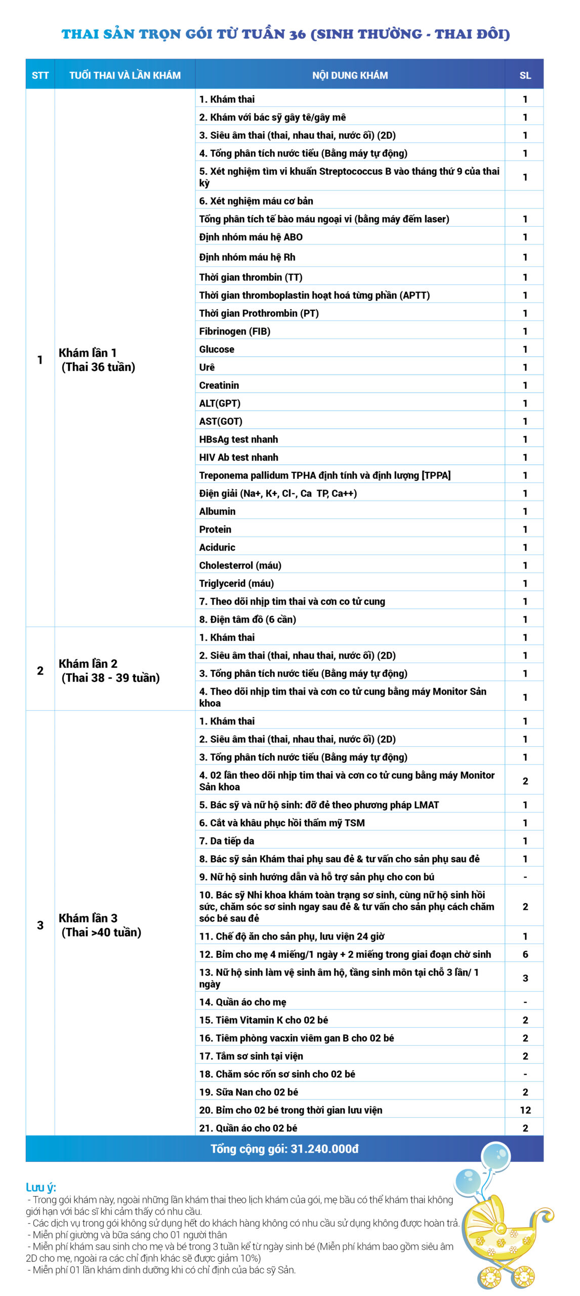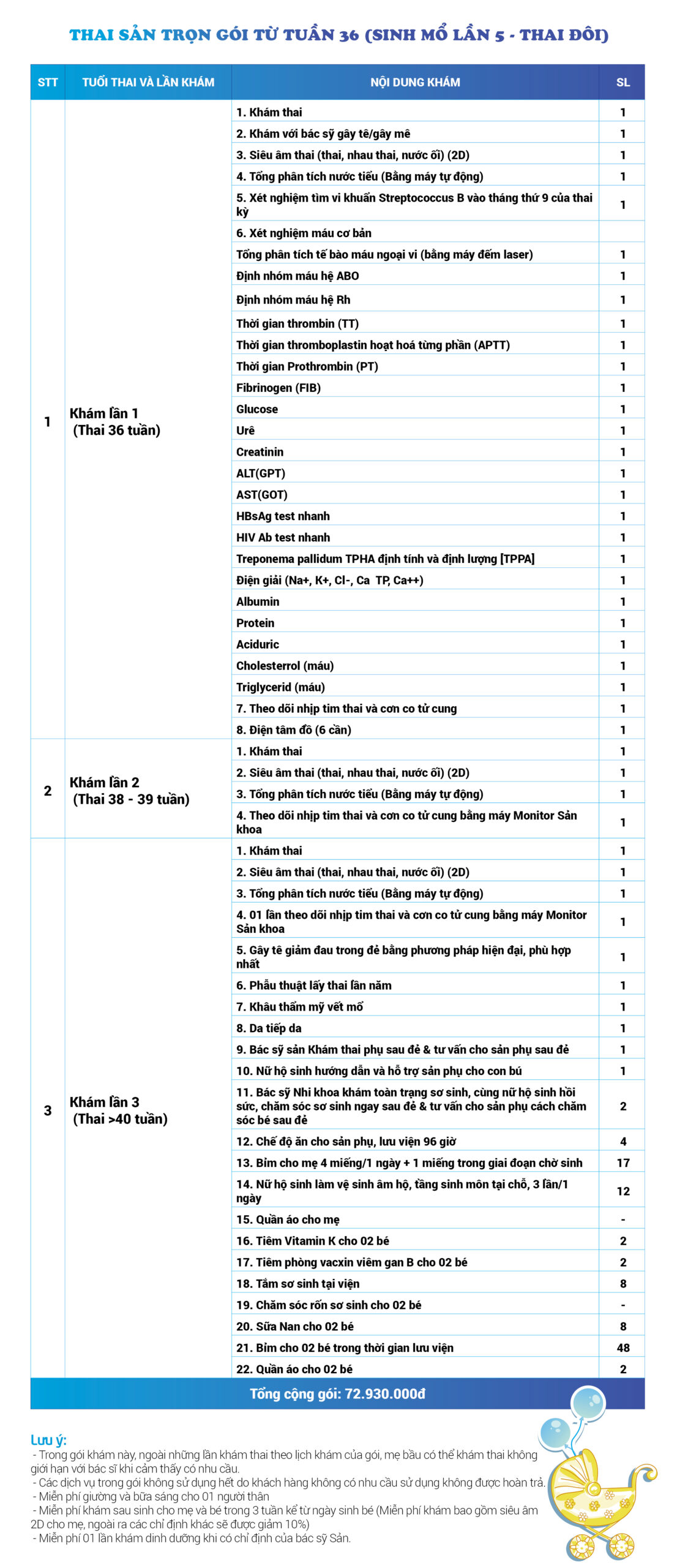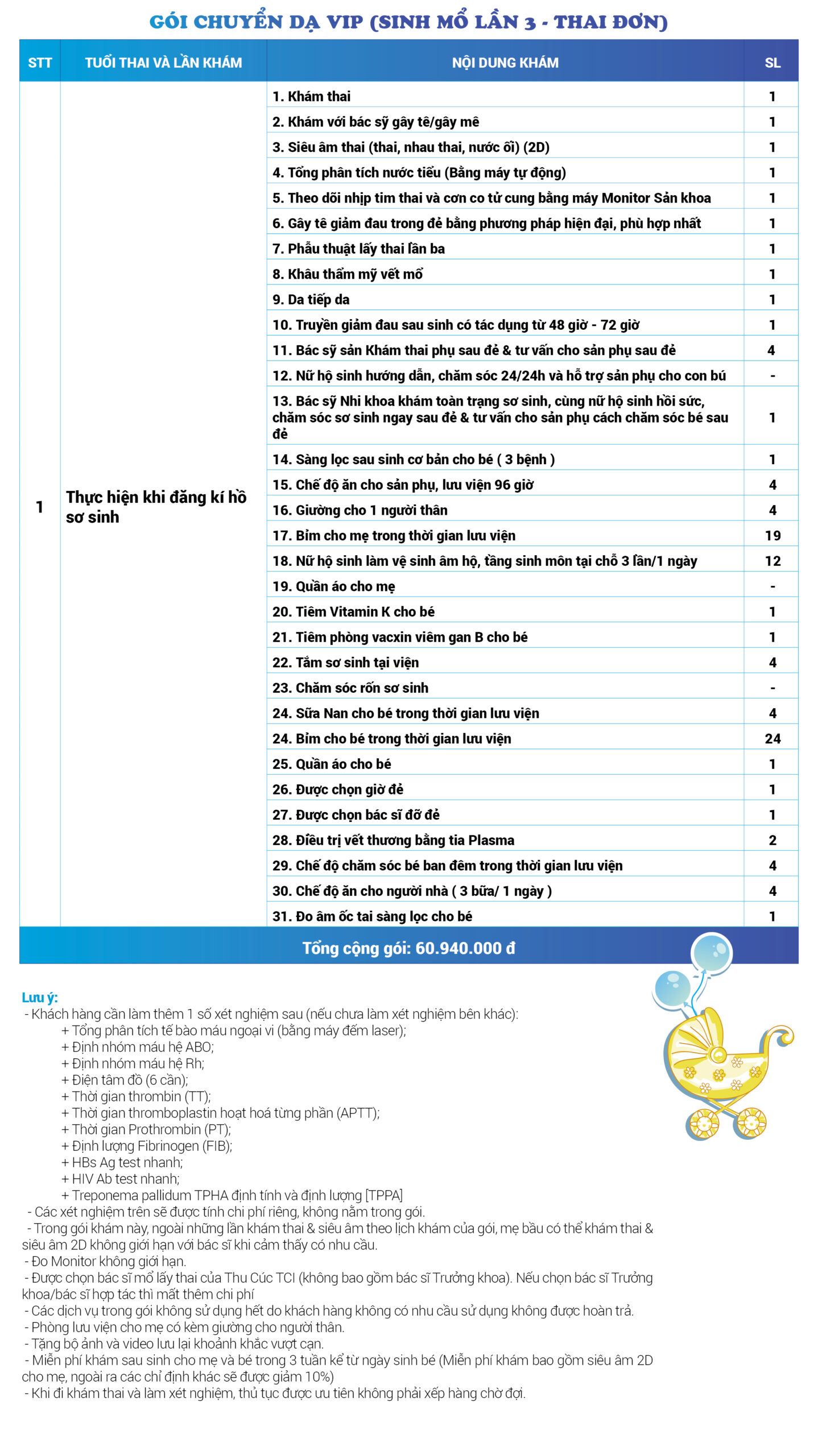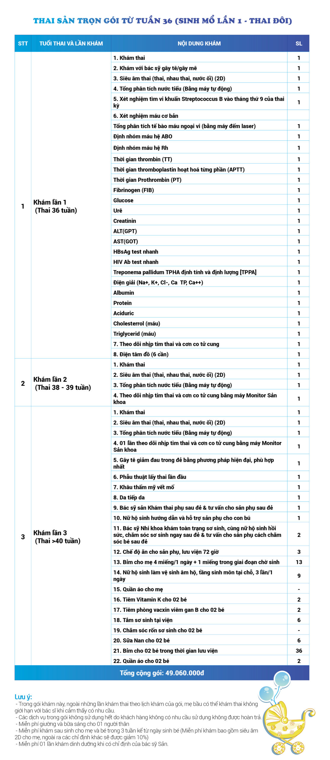 | 34 | Gói Thai sản trọn gói từ tuần 16 (Sinh mổ) - Lần 3 - Thai đôi - Gói Vip | 73.480.000 | 0 |
