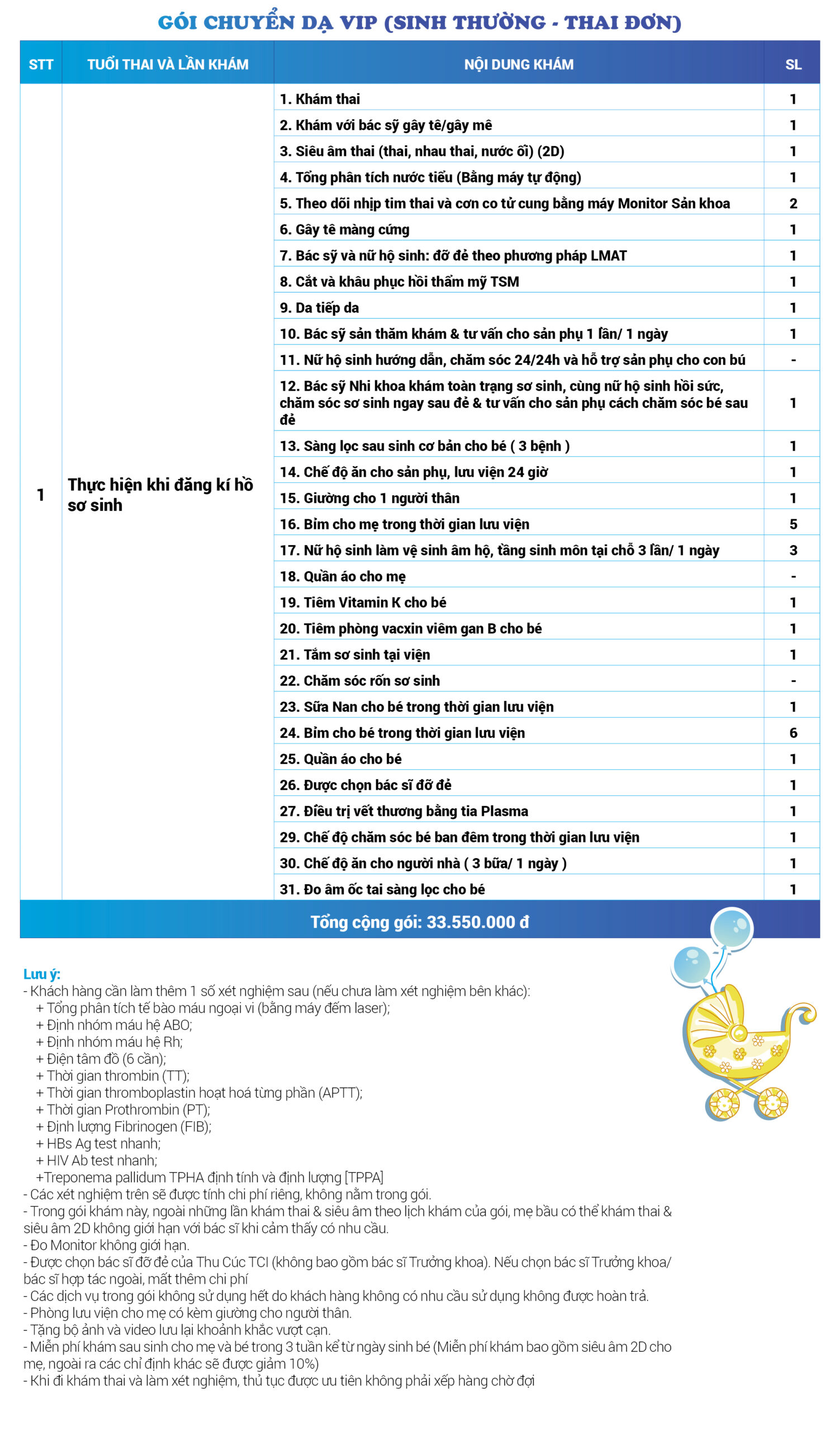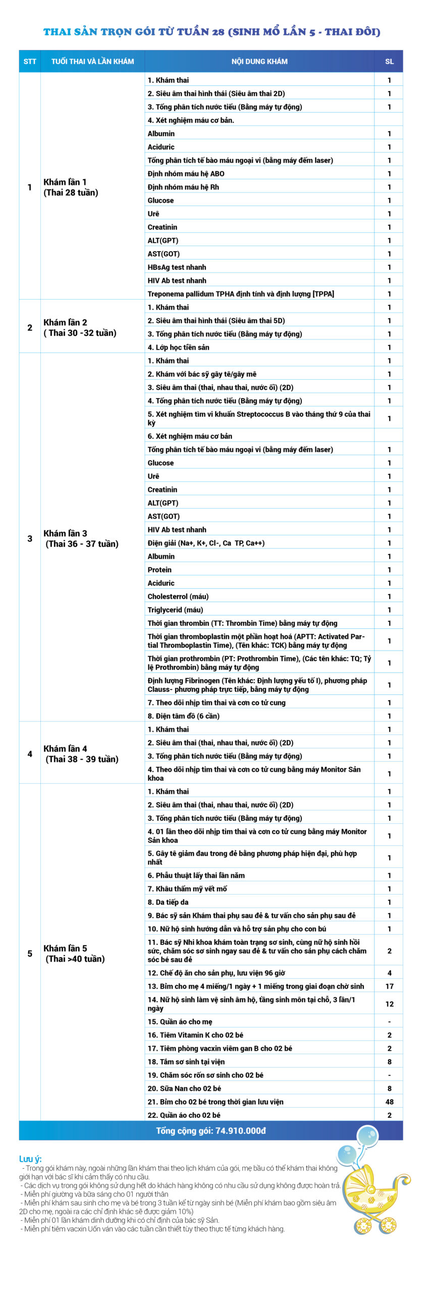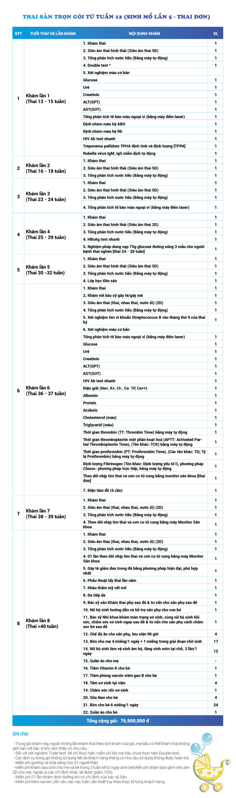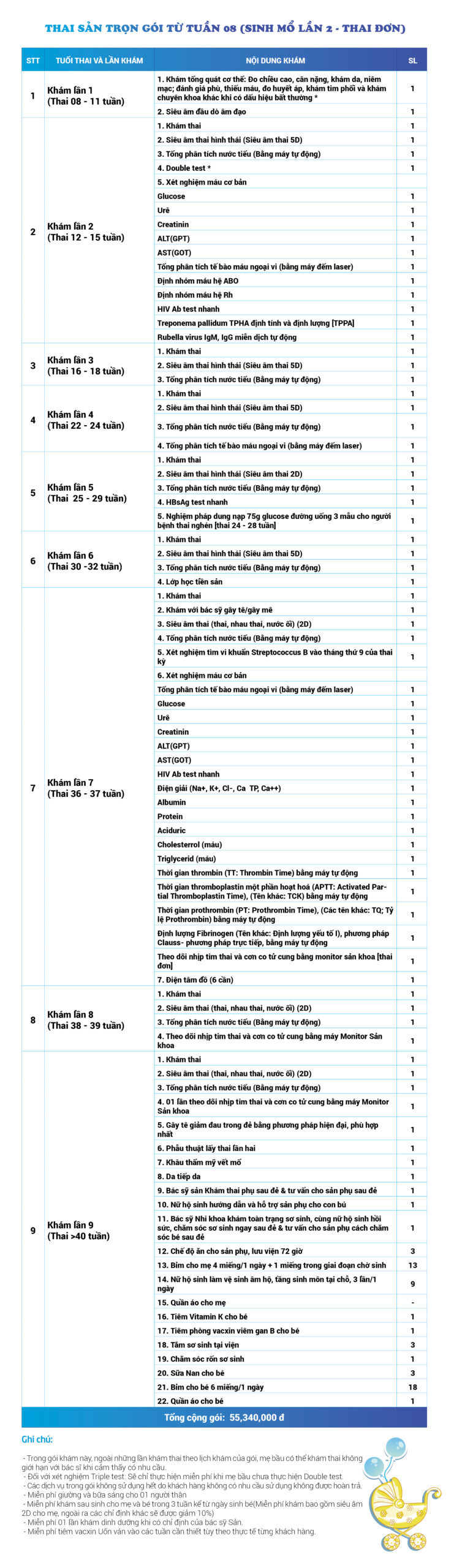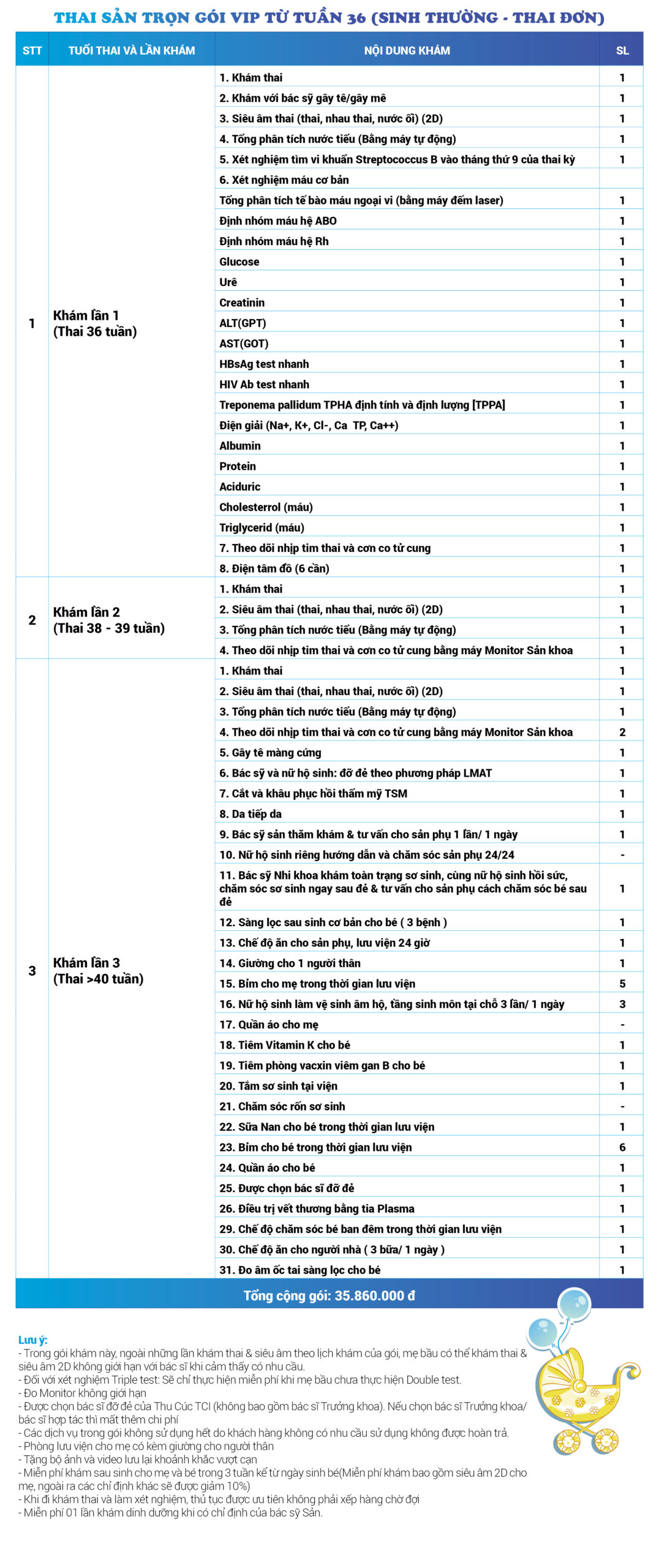 | 34 | Gói Thai sản trọn gói từ tuần 16 (Sinh mổ) - Lần 3 - Thai đôi - Gói Vip | 73.480.000 | 0 |