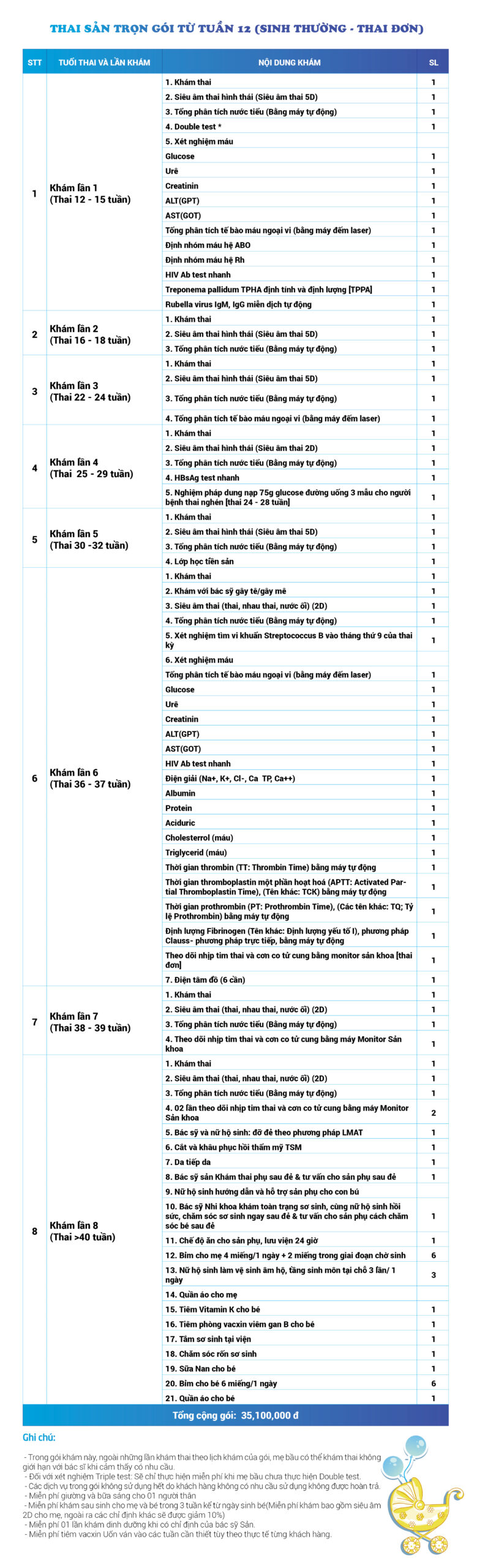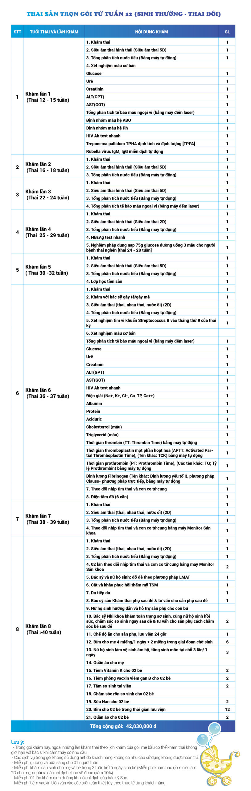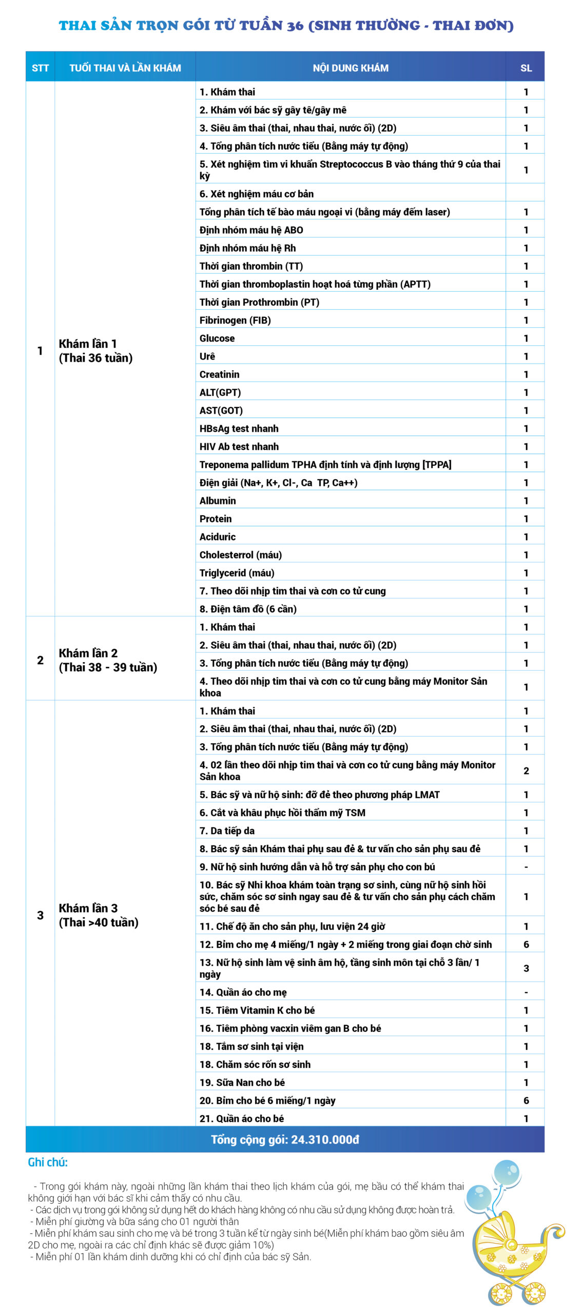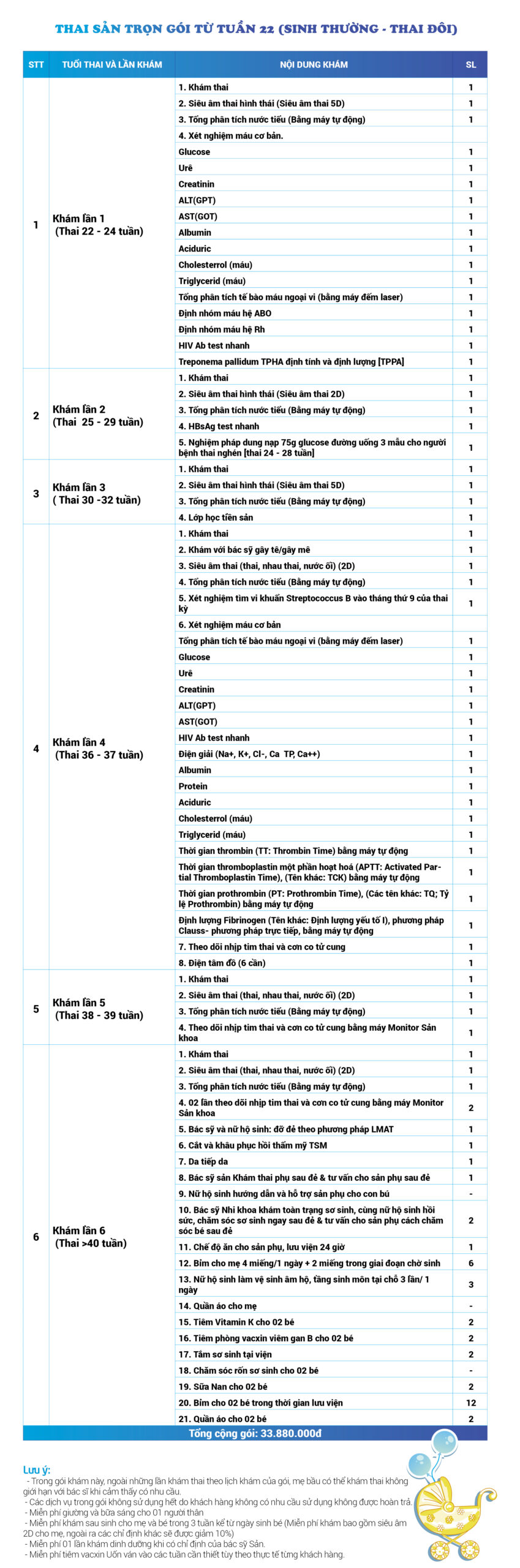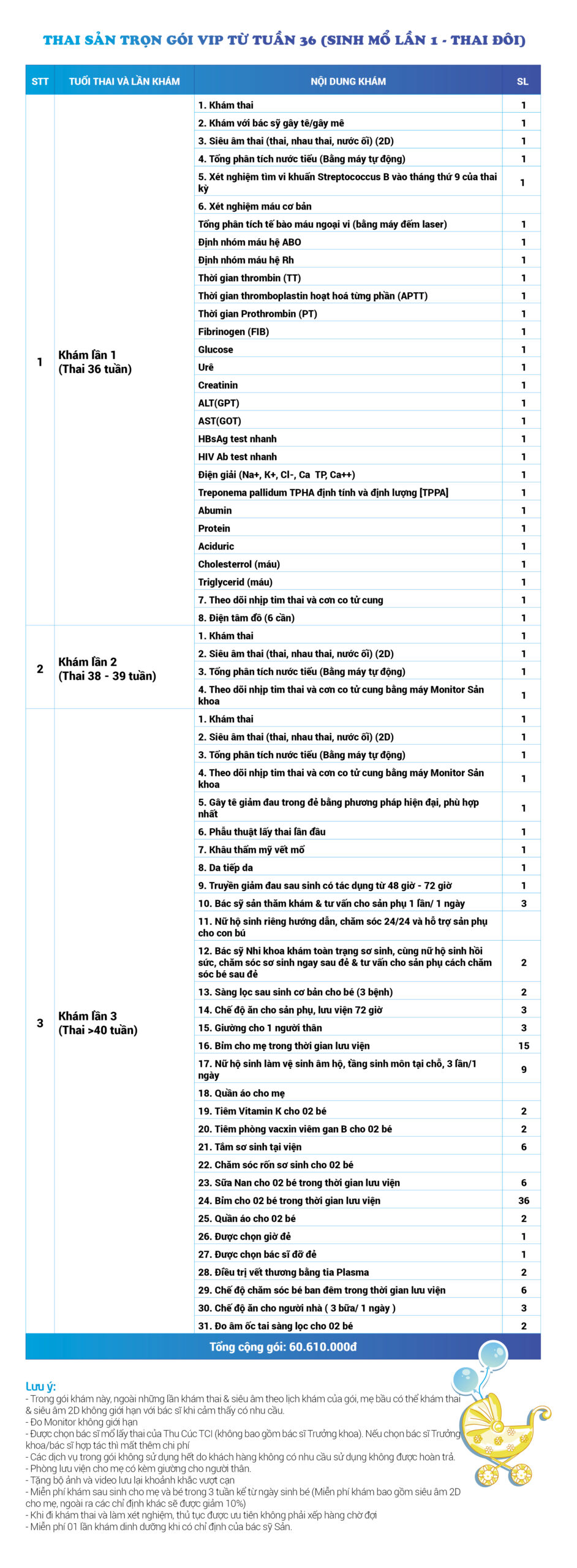 | 34 | Gói Thai sản trọn gói từ tuần 16 (Sinh mổ) - Lần 3 - Thai đôi - Gói Vip | 73.480.000 | 0 |