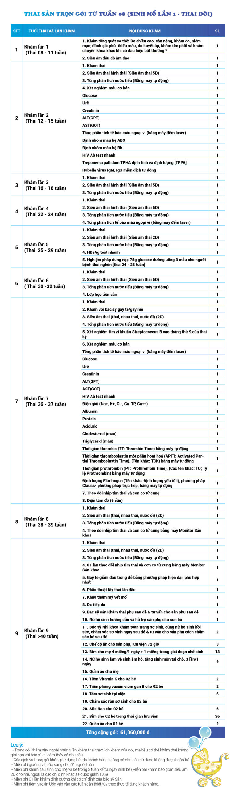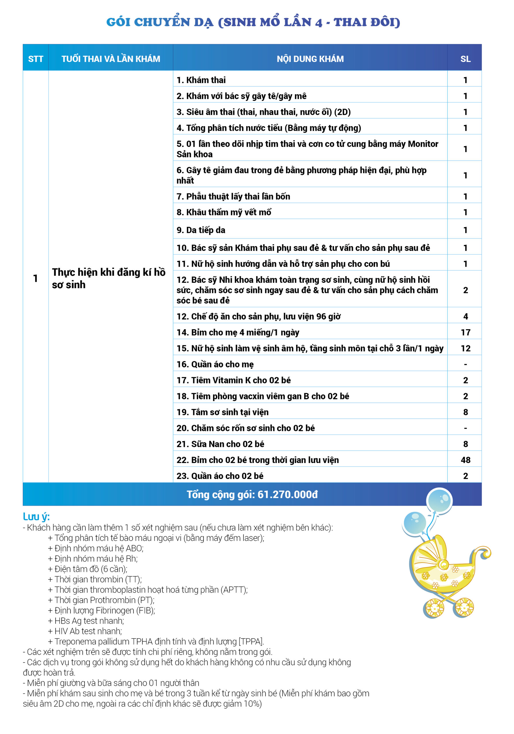 | 95 | Gói Thai sản chuyển dạ (Sinh mổ) - Lần 4 - Thai đôi - Gói Thường | 61.270.000 | 0 |