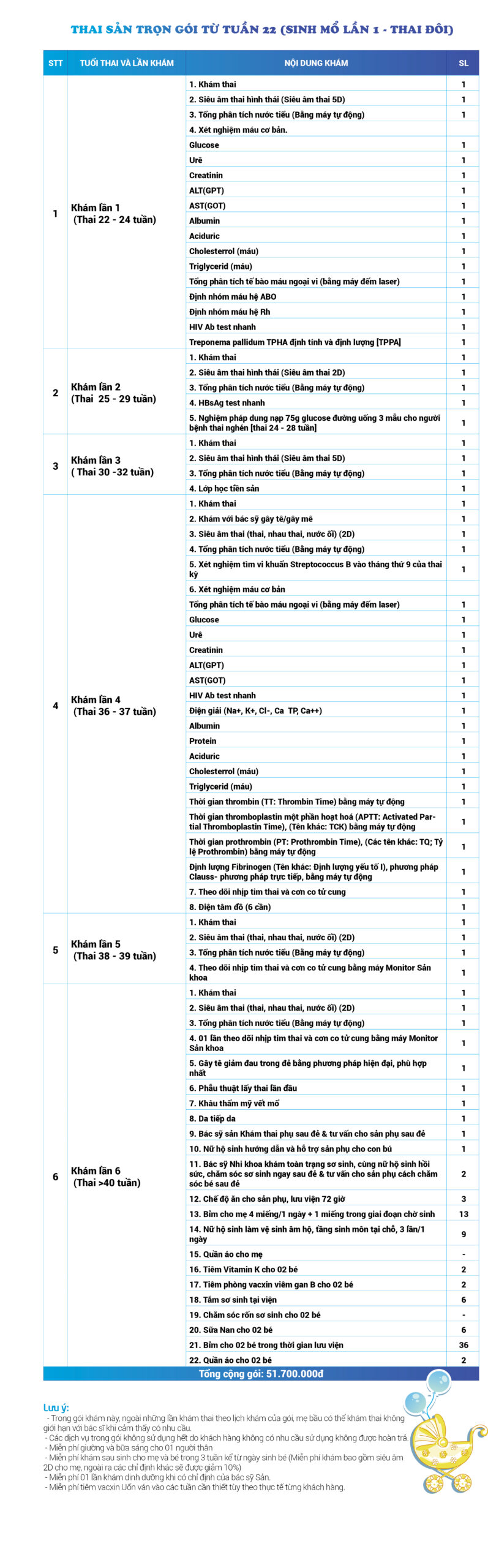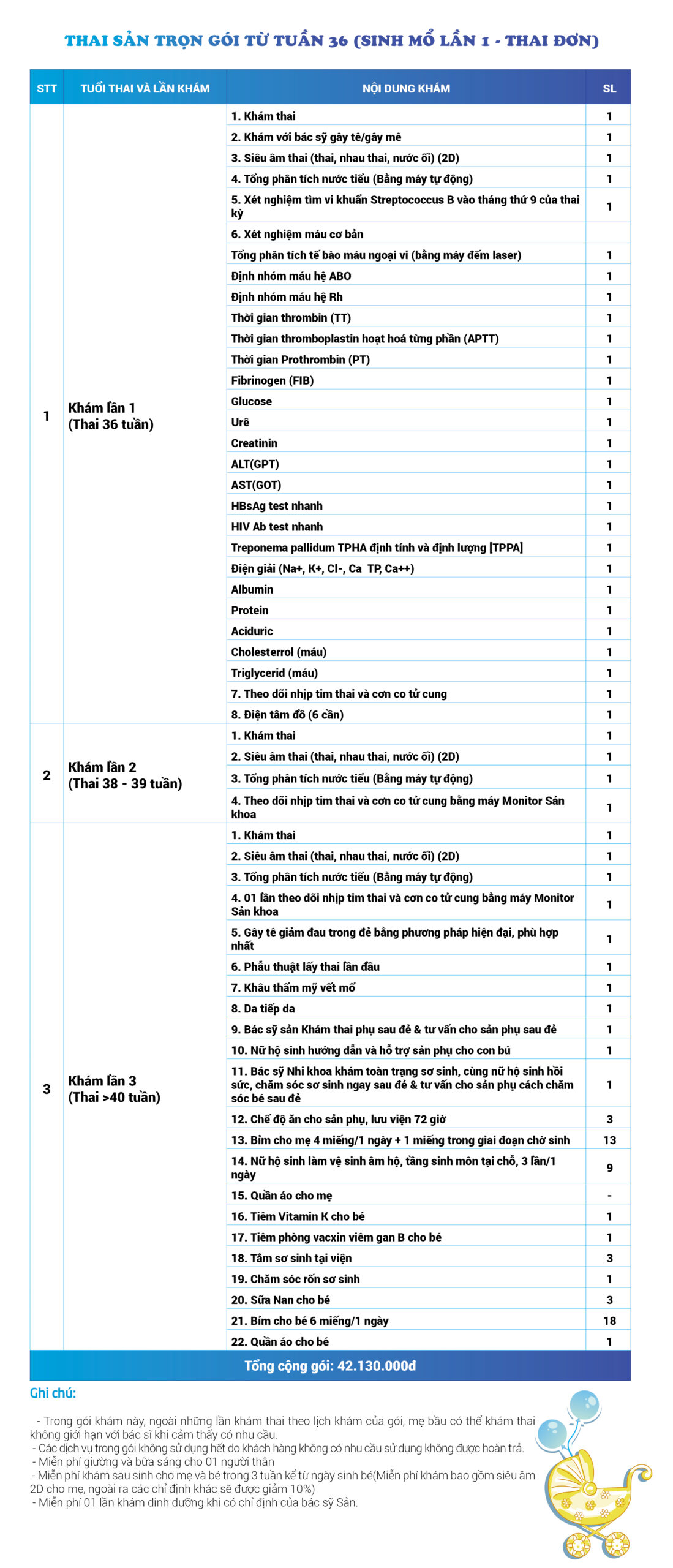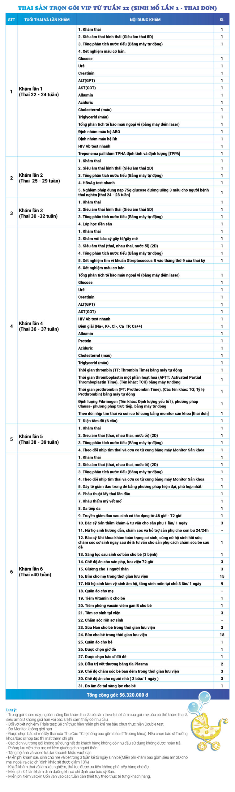 | 38 | Gói Thai sản trọn gói từ tuần 22 (Sinh mổ) - Lần 1 - Thai đơn - Gói Vip | 56.320.000 | 0 |