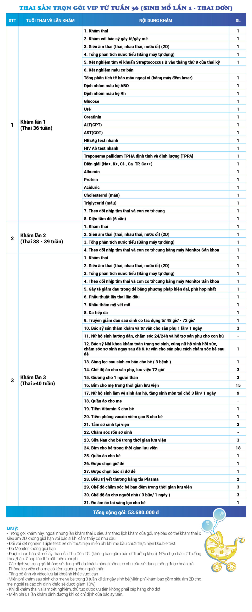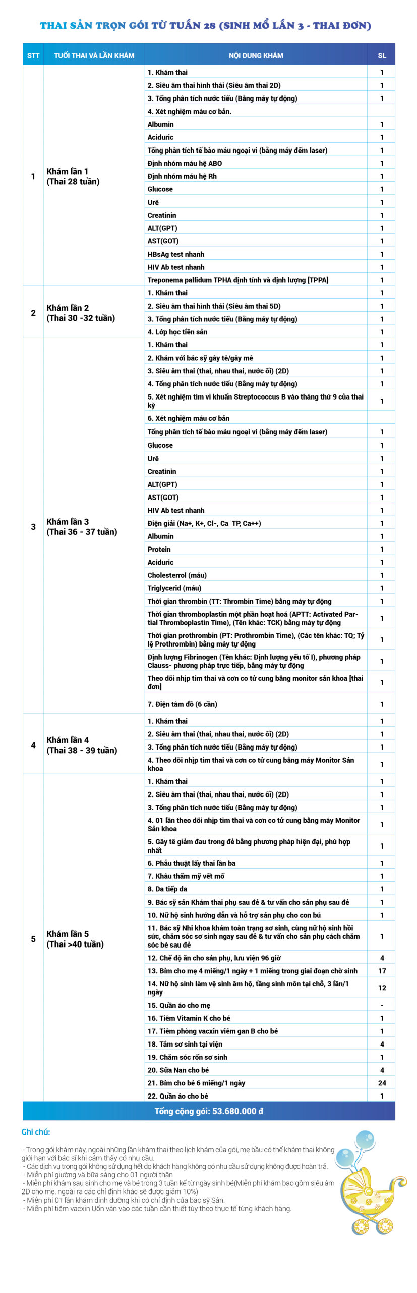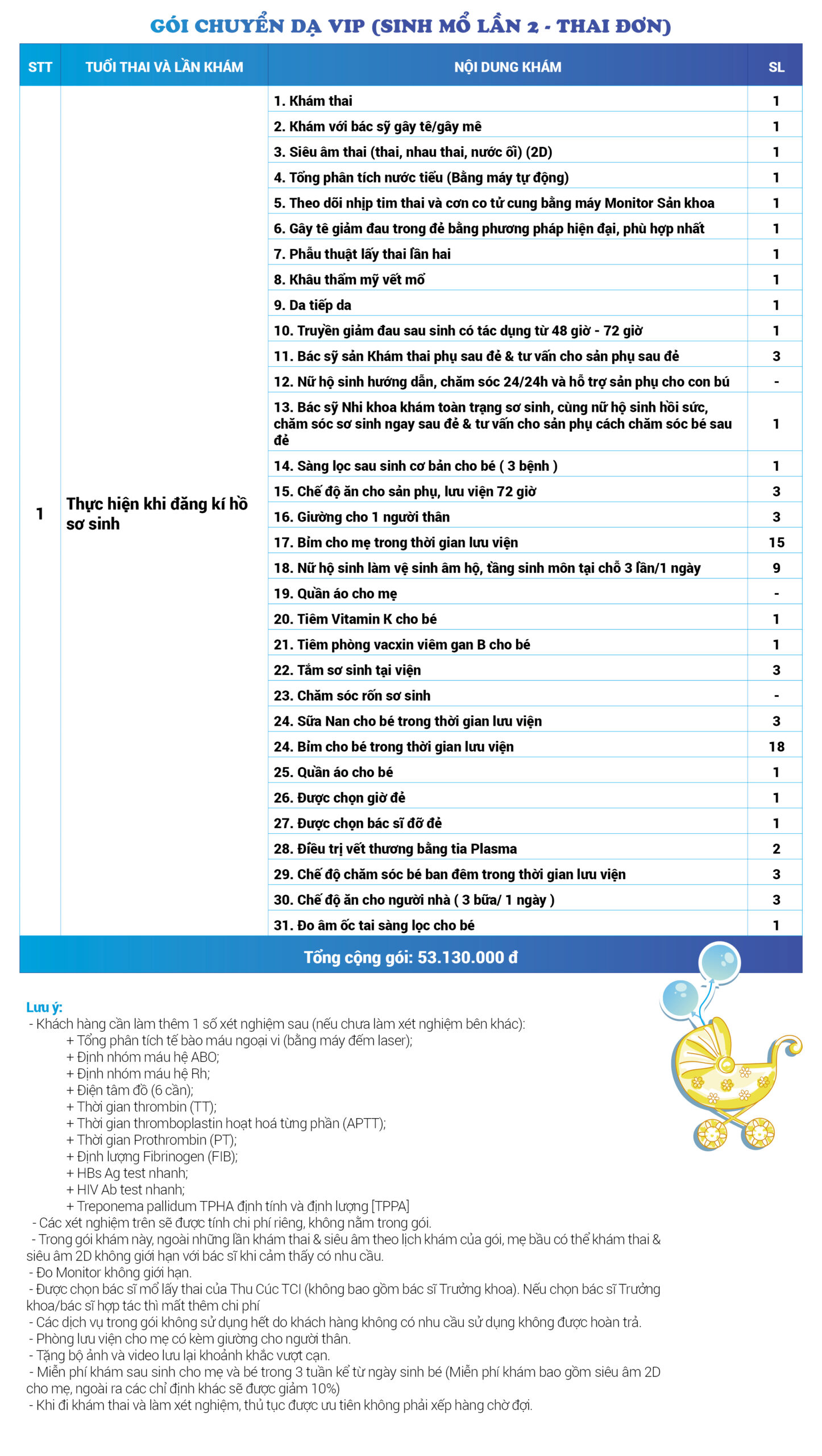 | 53 | Gói Thai sản trọn gói từ tuần 28 (Sinh mổ) - Lần 4 - Thai đơn - Gói Vip | 70.730.000 | 0 |