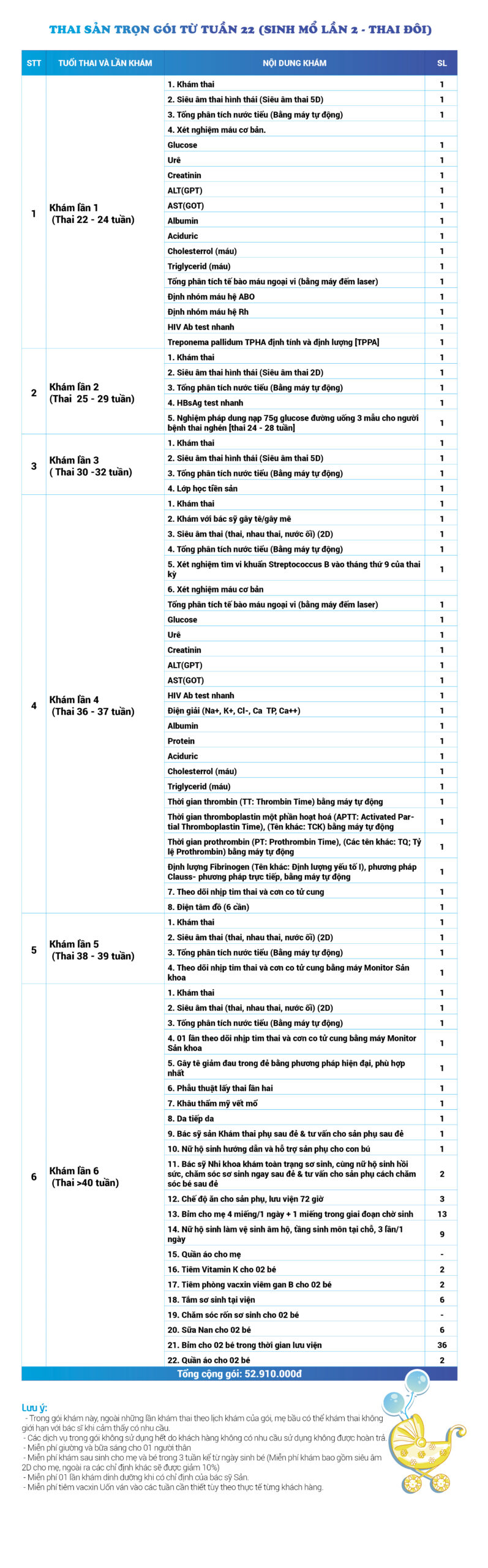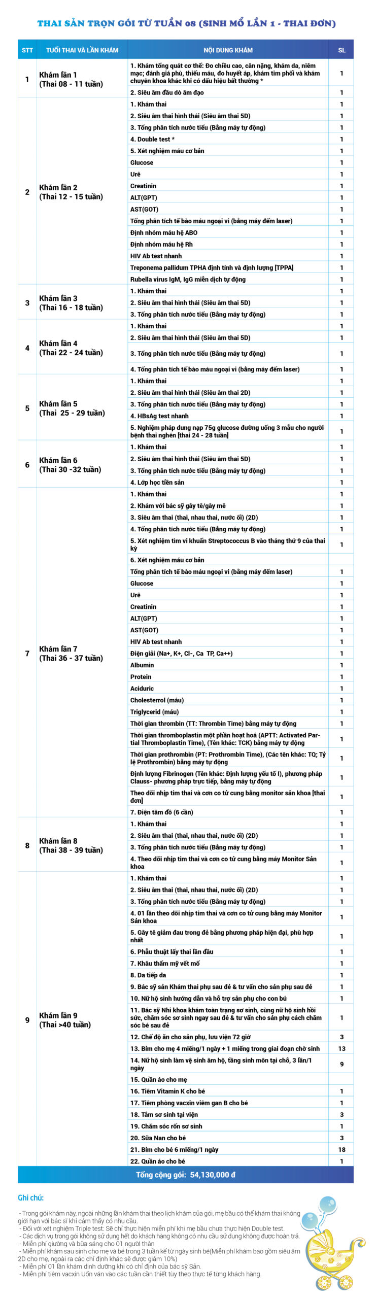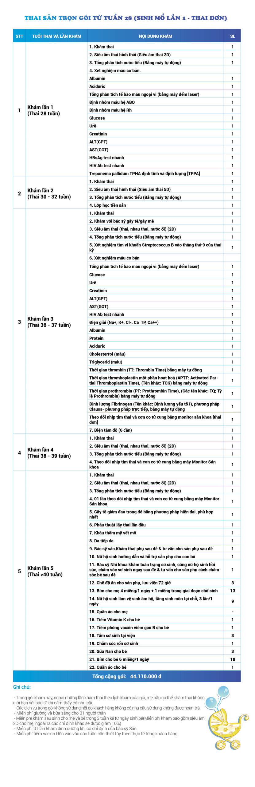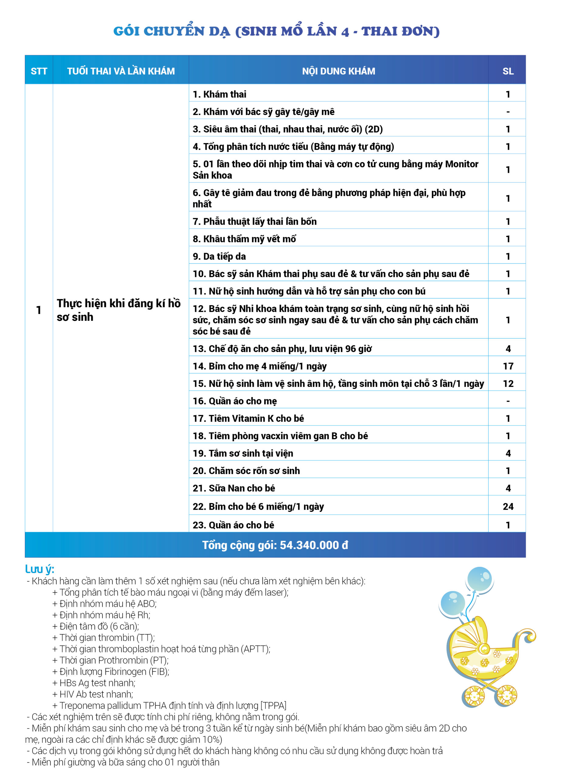| 53 | Gói Thai sản trọn gói từ tuần 28 (Sinh mổ) - Lần 4 - Thai đơn - Gói Vip | 70.730.000 | 0 |