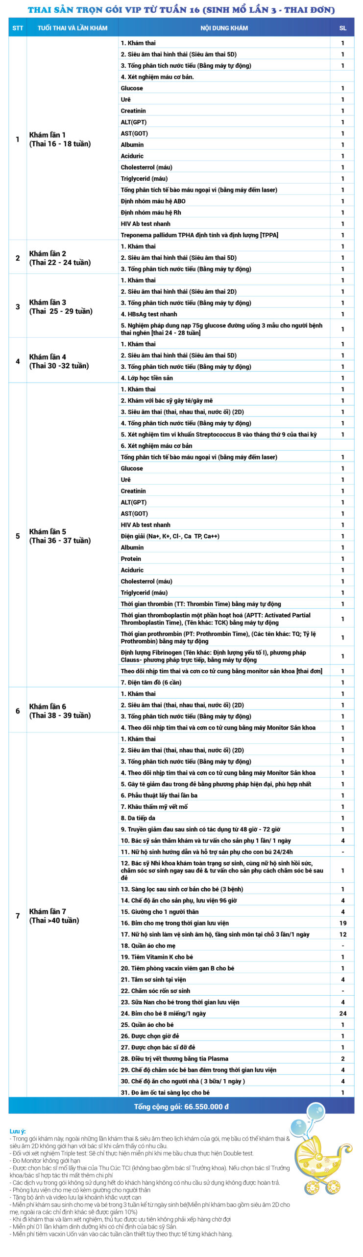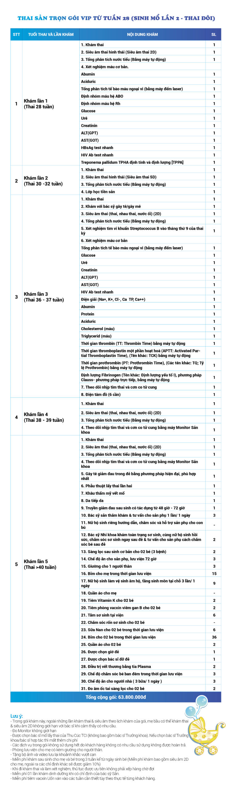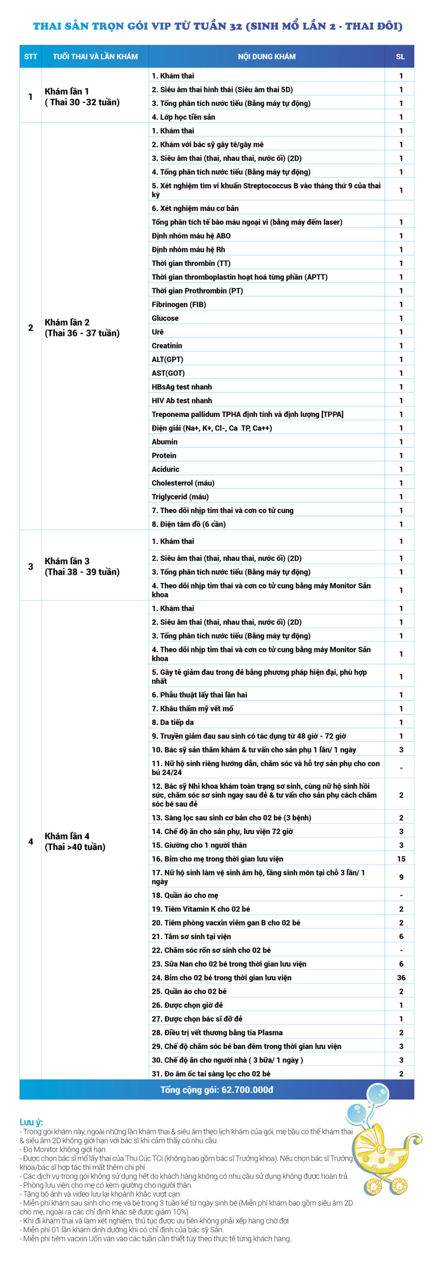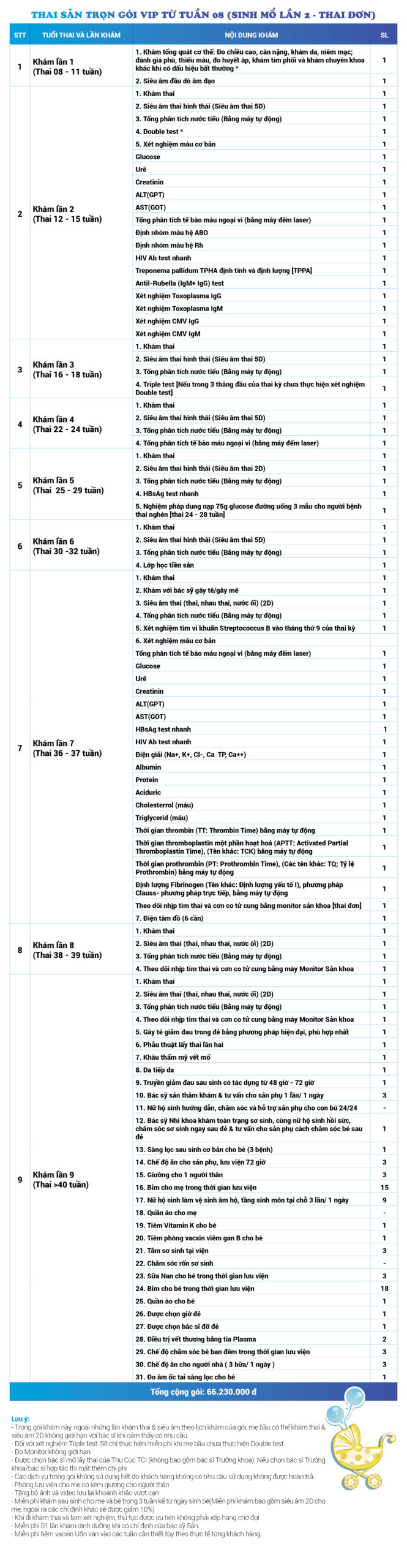 | 32 | Gói Thai sản trọn gói từ tuần 16 (Sinh mổ) - Lần 1 - Thai đôi - Gói Vip | 63.910.000 | 0 |