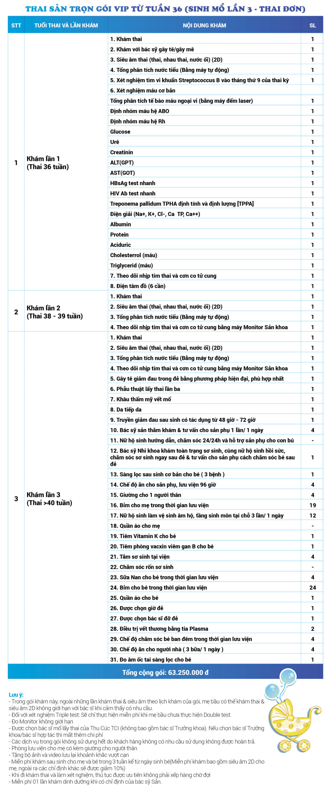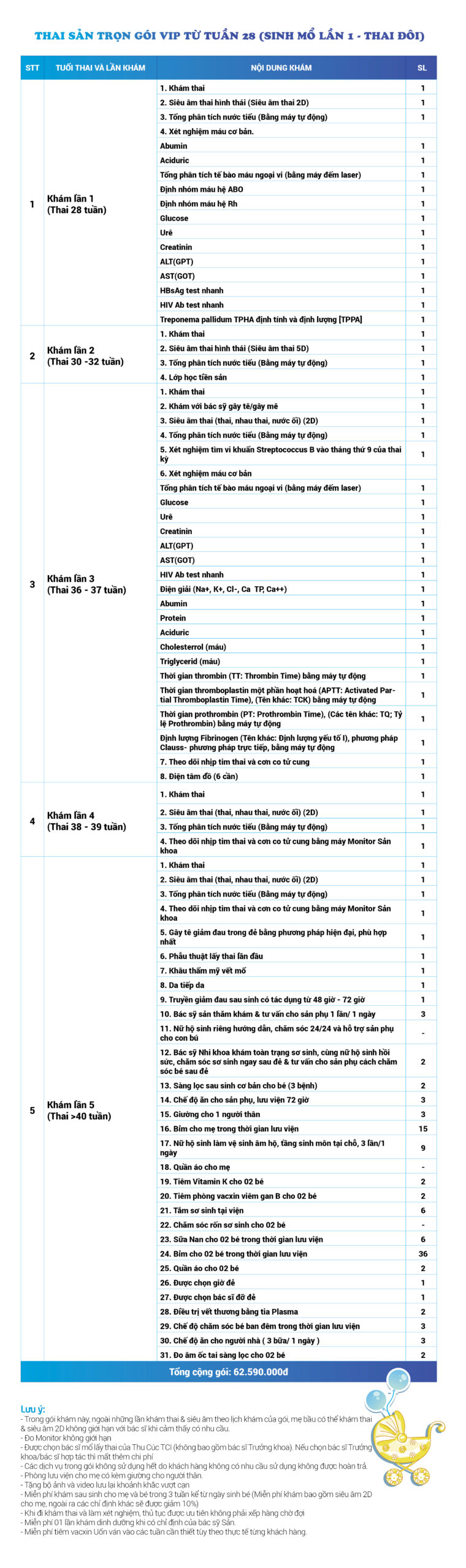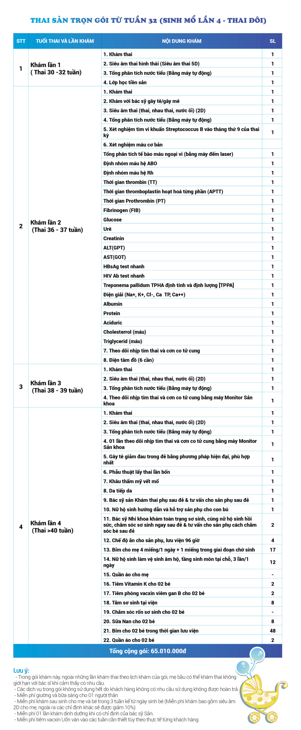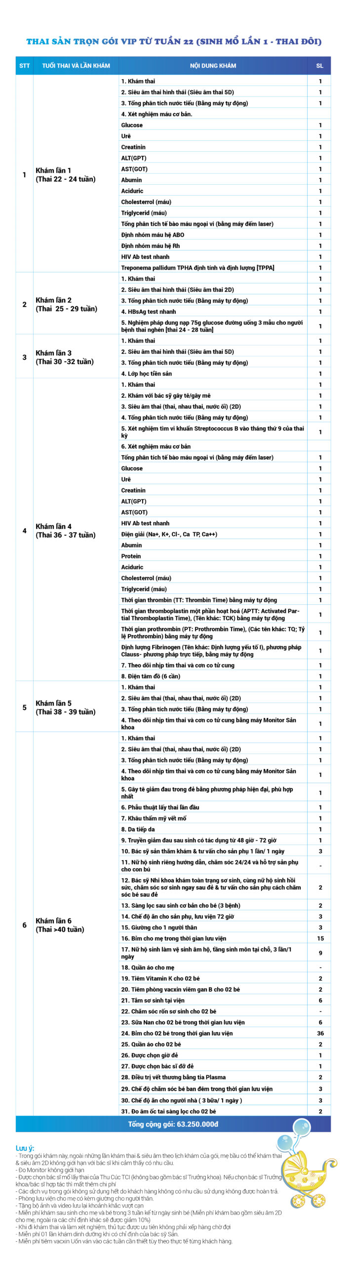 | 32 | Gói Thai sản trọn gói từ tuần 16 (Sinh mổ) - Lần 1 - Thai đôi - Gói Vip | 63.910.000 | 0 |