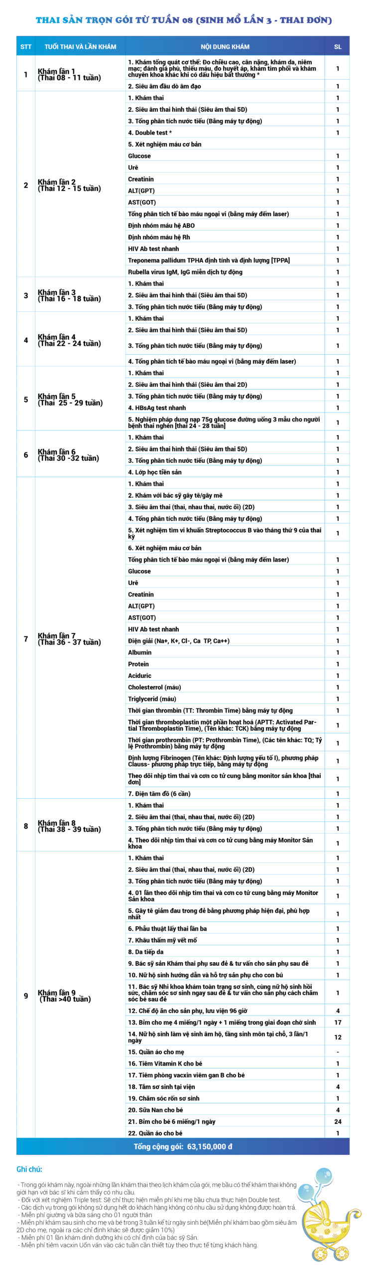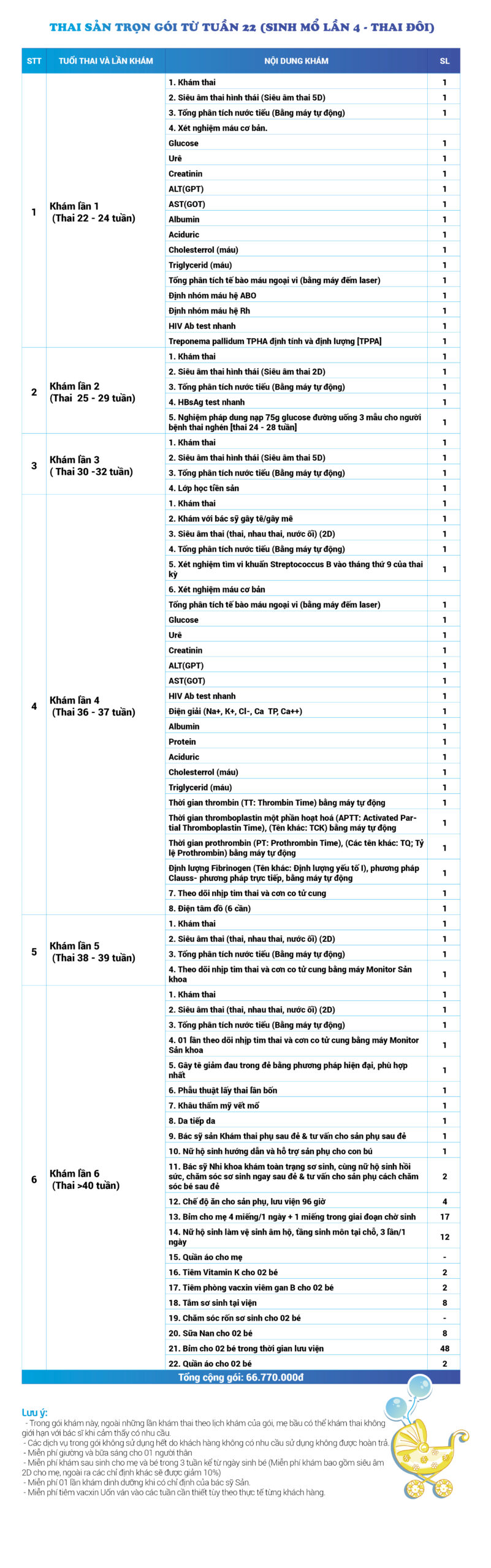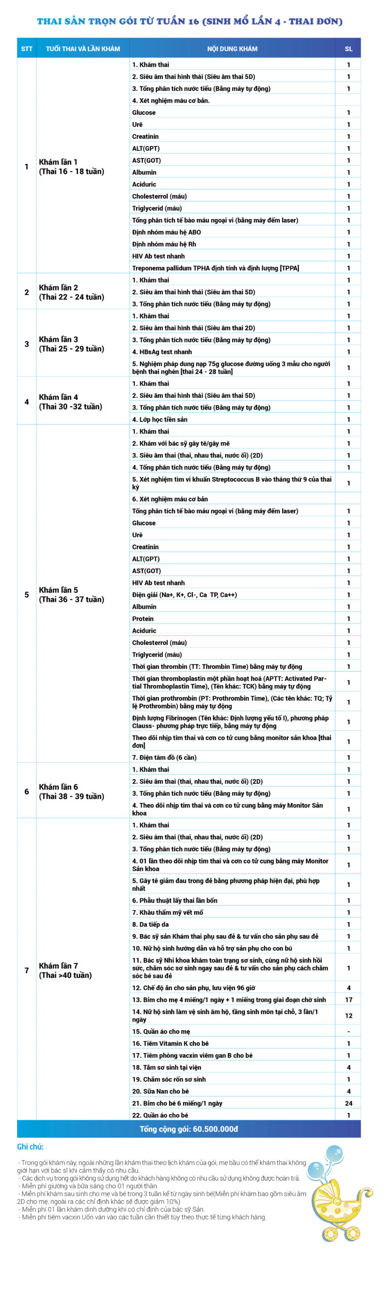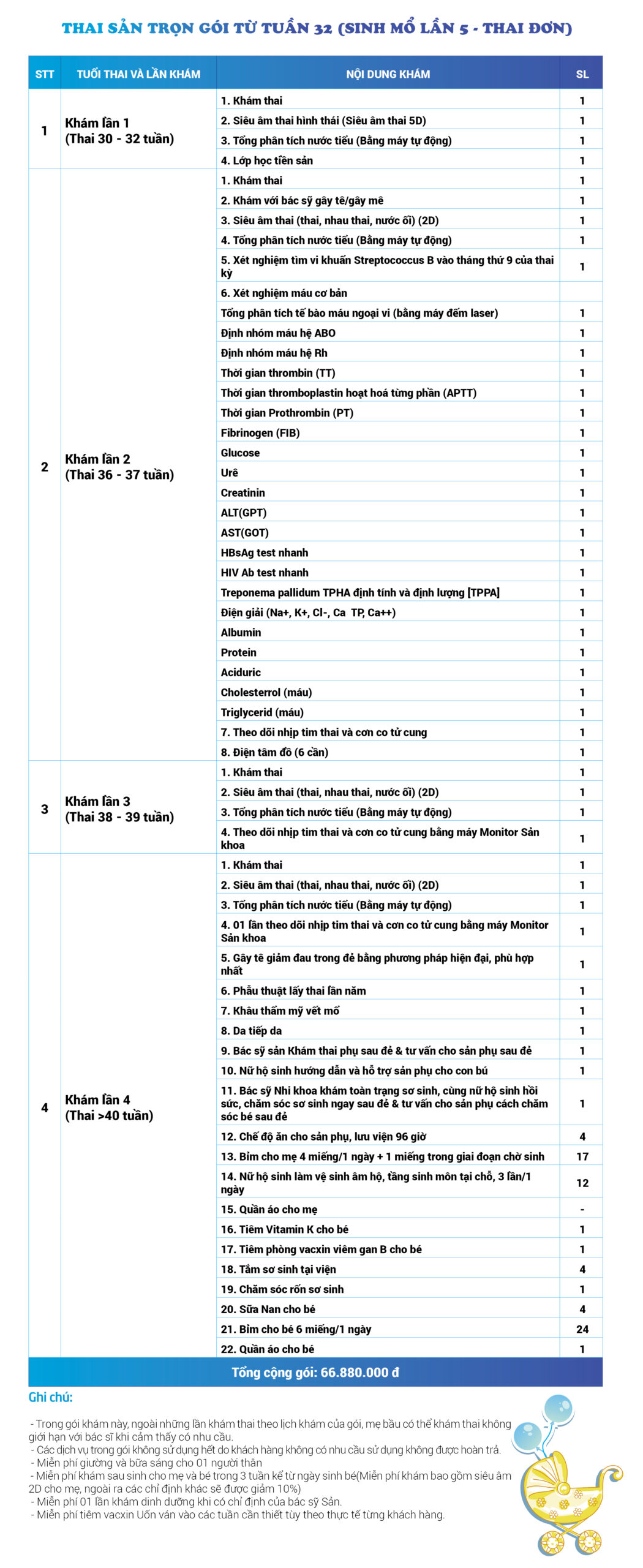 | 32 | Gói Thai sản trọn gói từ tuần 16 (Sinh mổ) - Lần 1 - Thai đôi - Gói Vip | 63.910.000 | 0 |