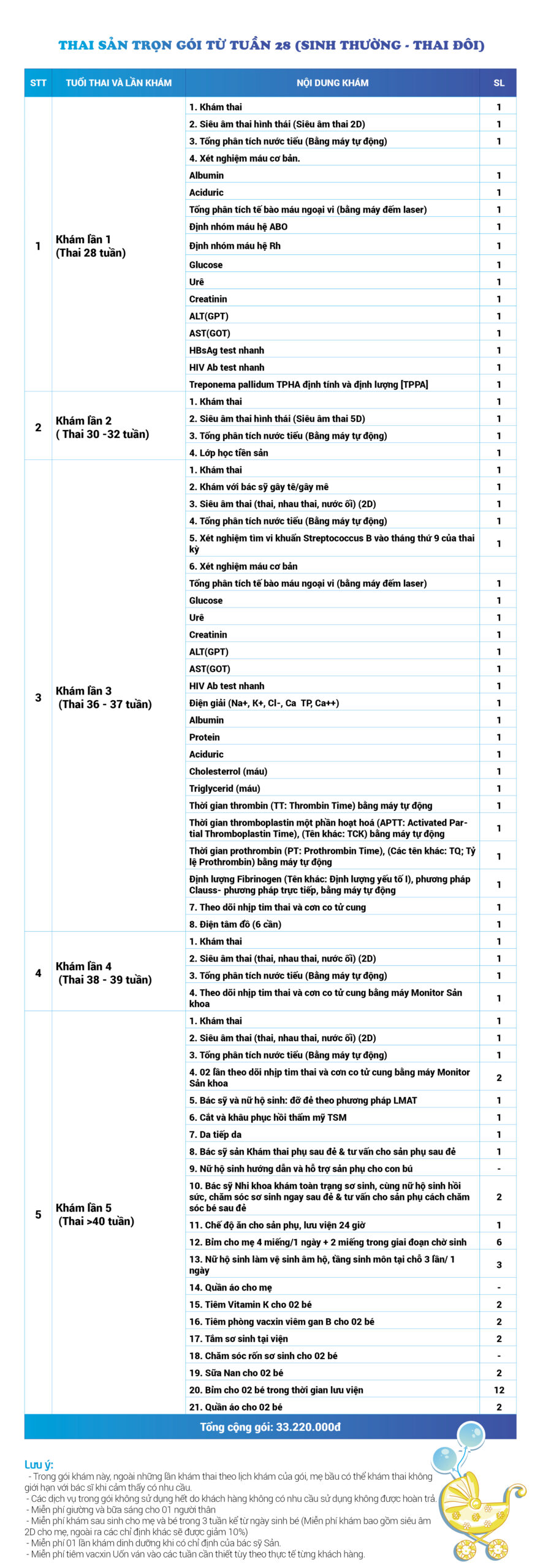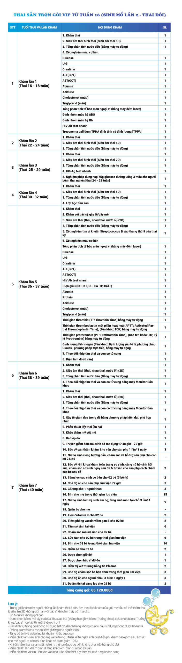 | 33 | Gói Thai sản trọn gói từ tuần 16 (Sinh mổ) - Lần 2 - Thai đôi - Gói Vip | 65.120.000 | 0 |