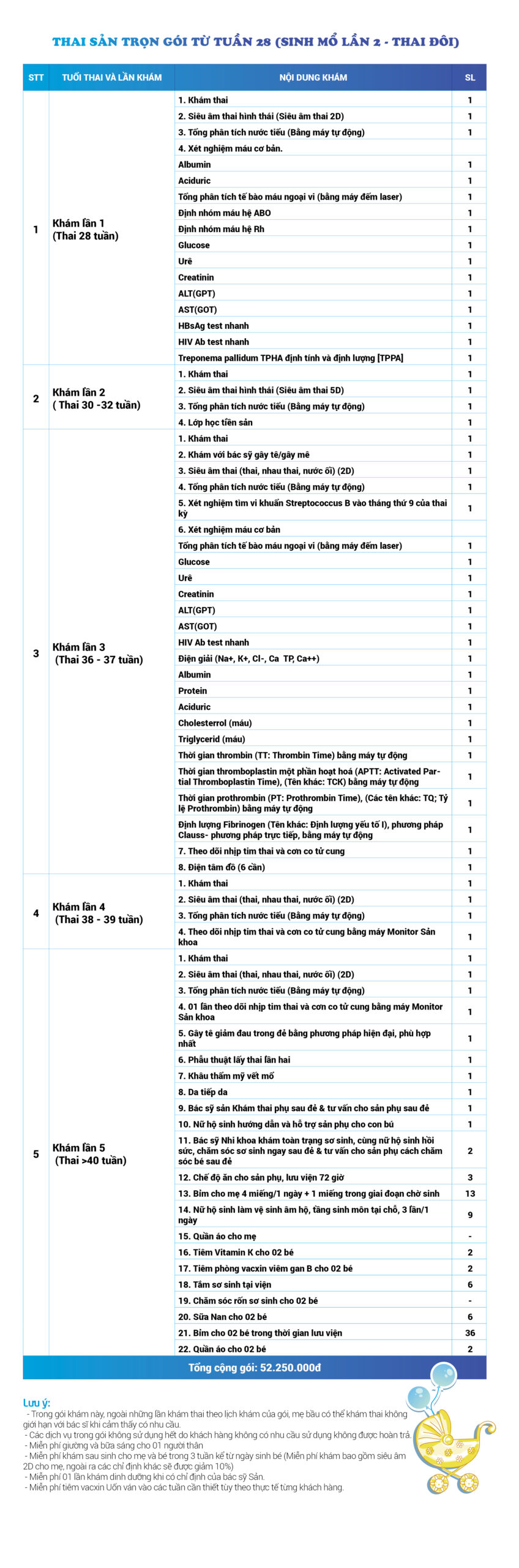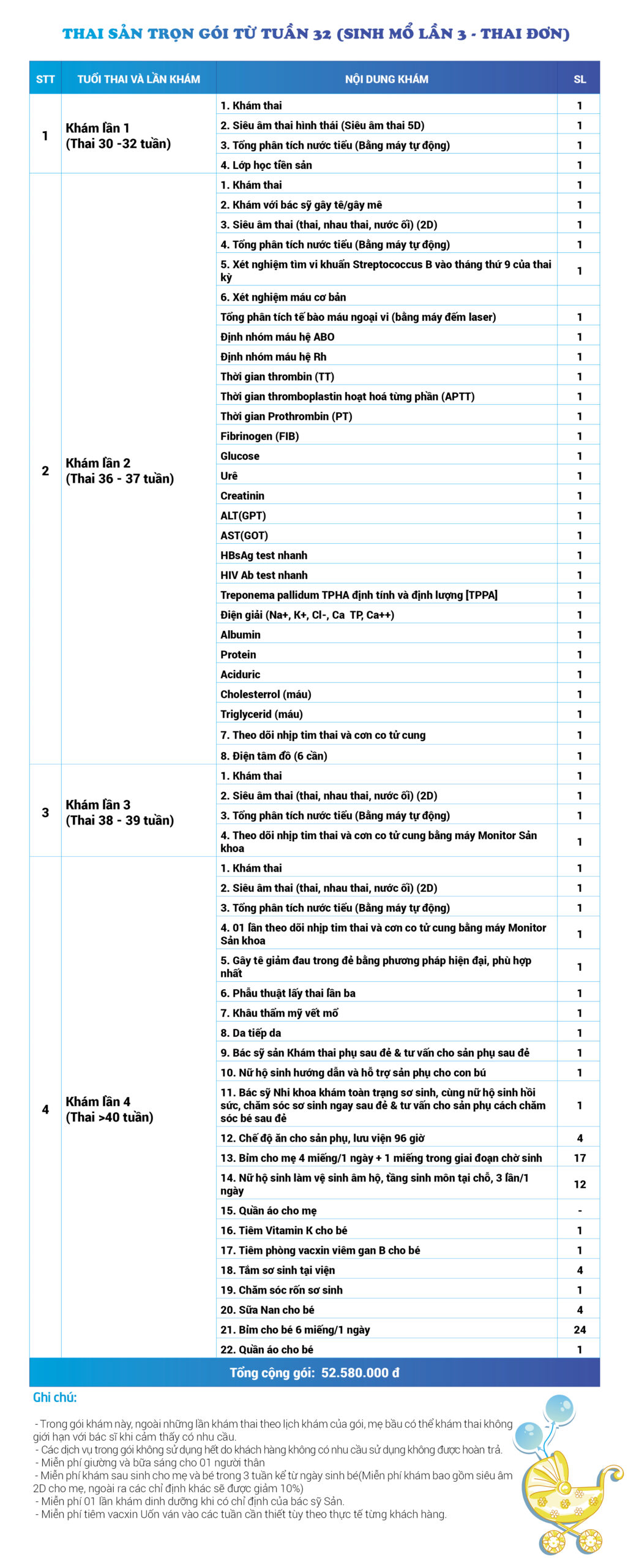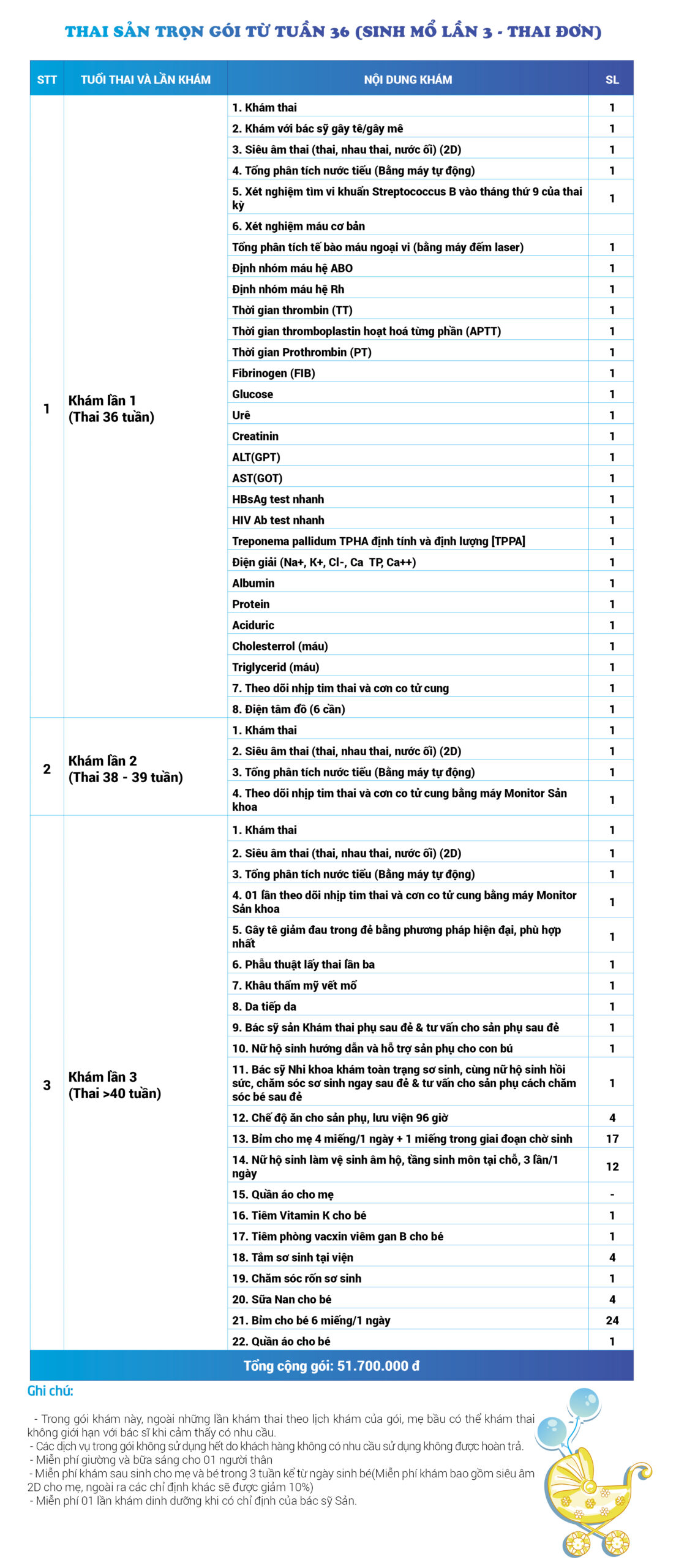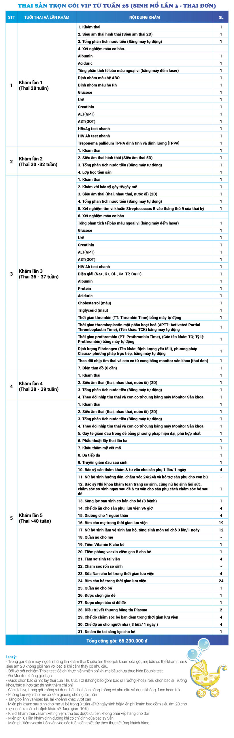 | 52 | Gói Thai sản trọn gói từ tuần 28 (Sinh mổ) - Lần 3 - Thai đơn - Gói Vip | 65.230.000 | 0 |