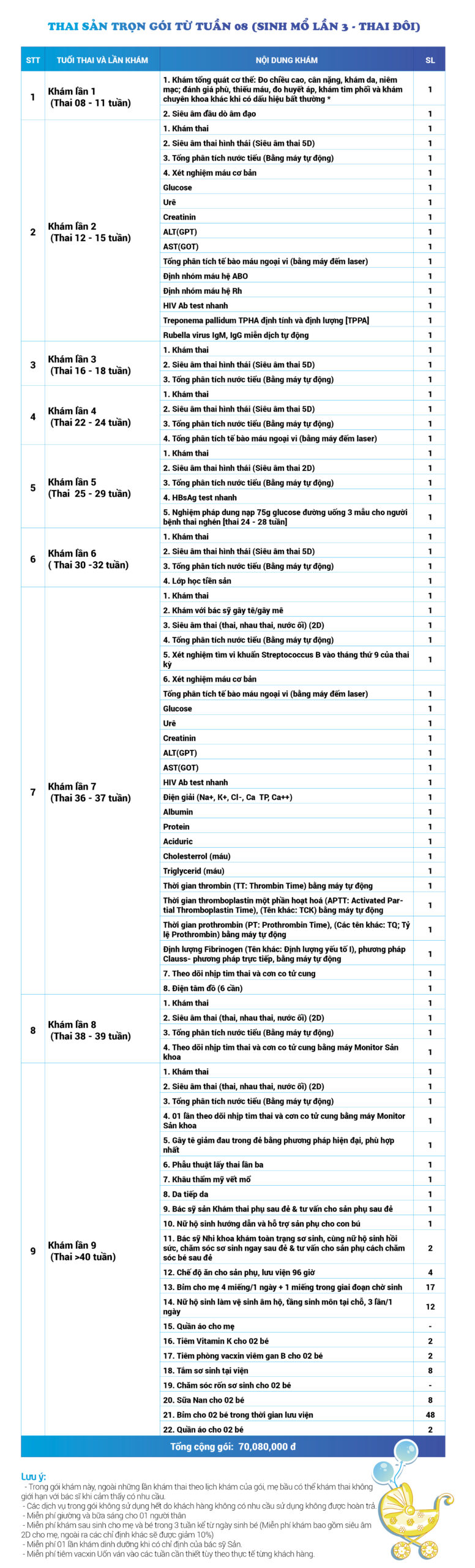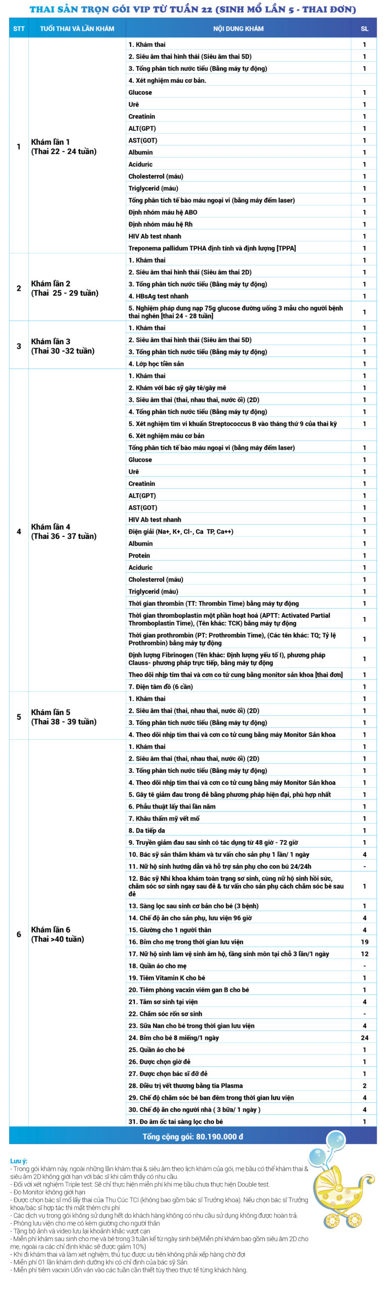 | 22 | Gói Thai sản trọn gói từ tuần 12 (Sinh mổ) - Lần 3 - Thai đôi - Gói Vip | 80.420.000 | 0 |