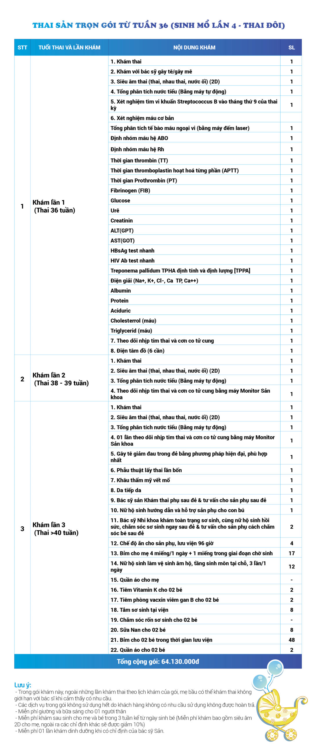 | 64 | Gói Thai sản trọn gói từ tuần 32 (Sinh mổ) - Lần 3 - Thai đơn - Gói Vip | 64.130.000 | 0 |