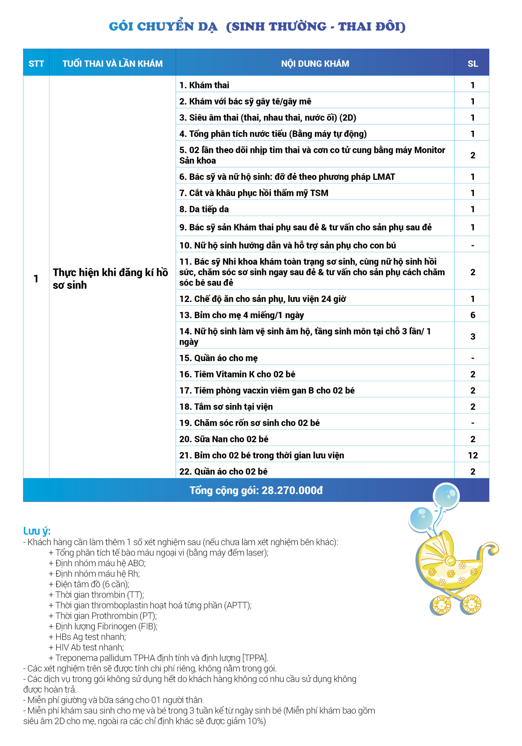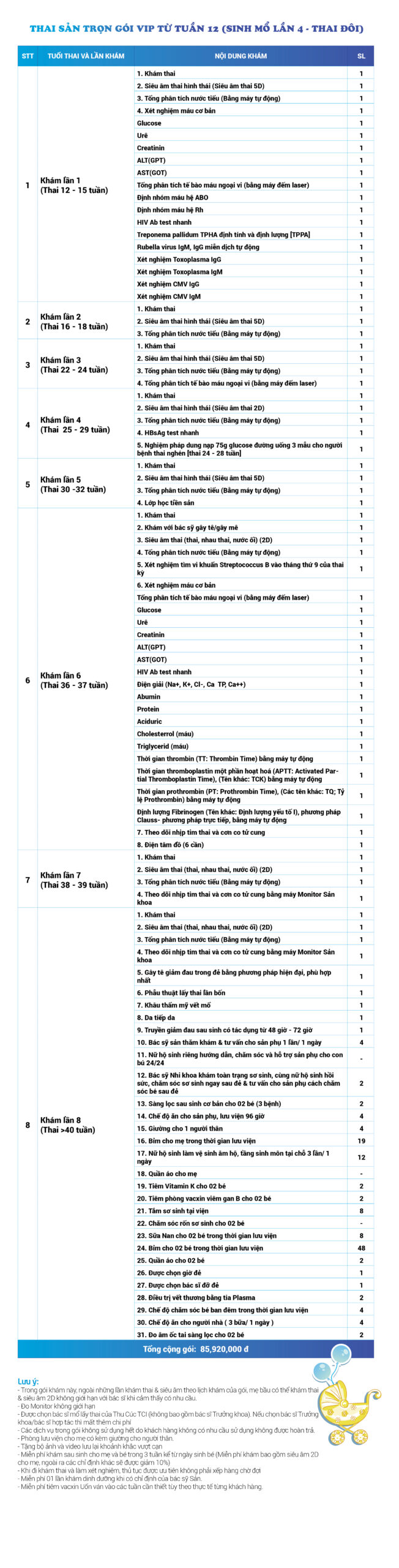 | 23 | Gói Thai sản trọn gói từ tuần 12 (Sinh mổ) - Lần 4 - Thai đôi - Gói Vip | 85.920.000 | 0 |