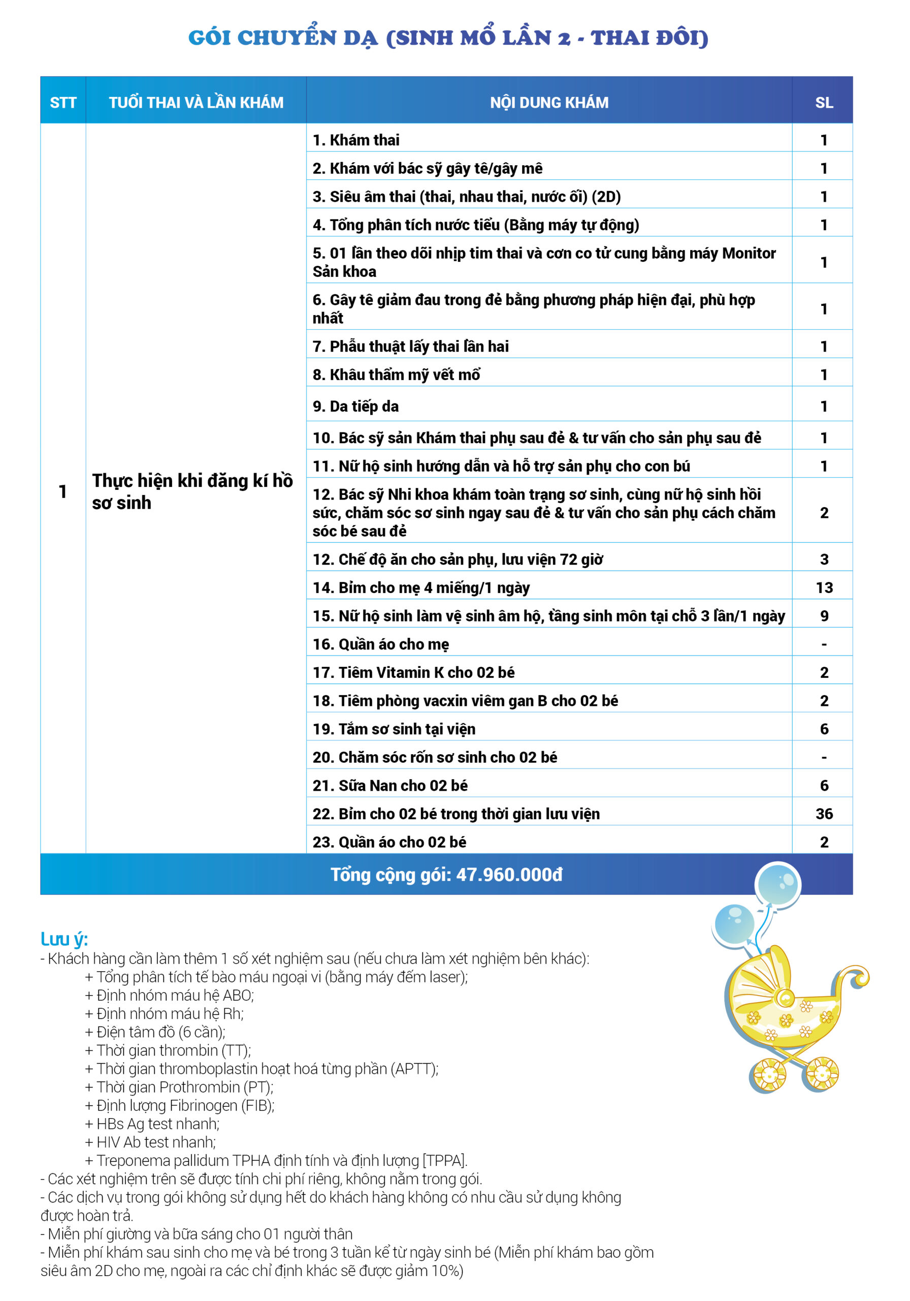 | 47 | Gói Thai sản trọn gói từ tuần 22 (Sinh mổ) - Lần 4 - Thai đôi - Gói Vip | 78.320.000 | 0 |