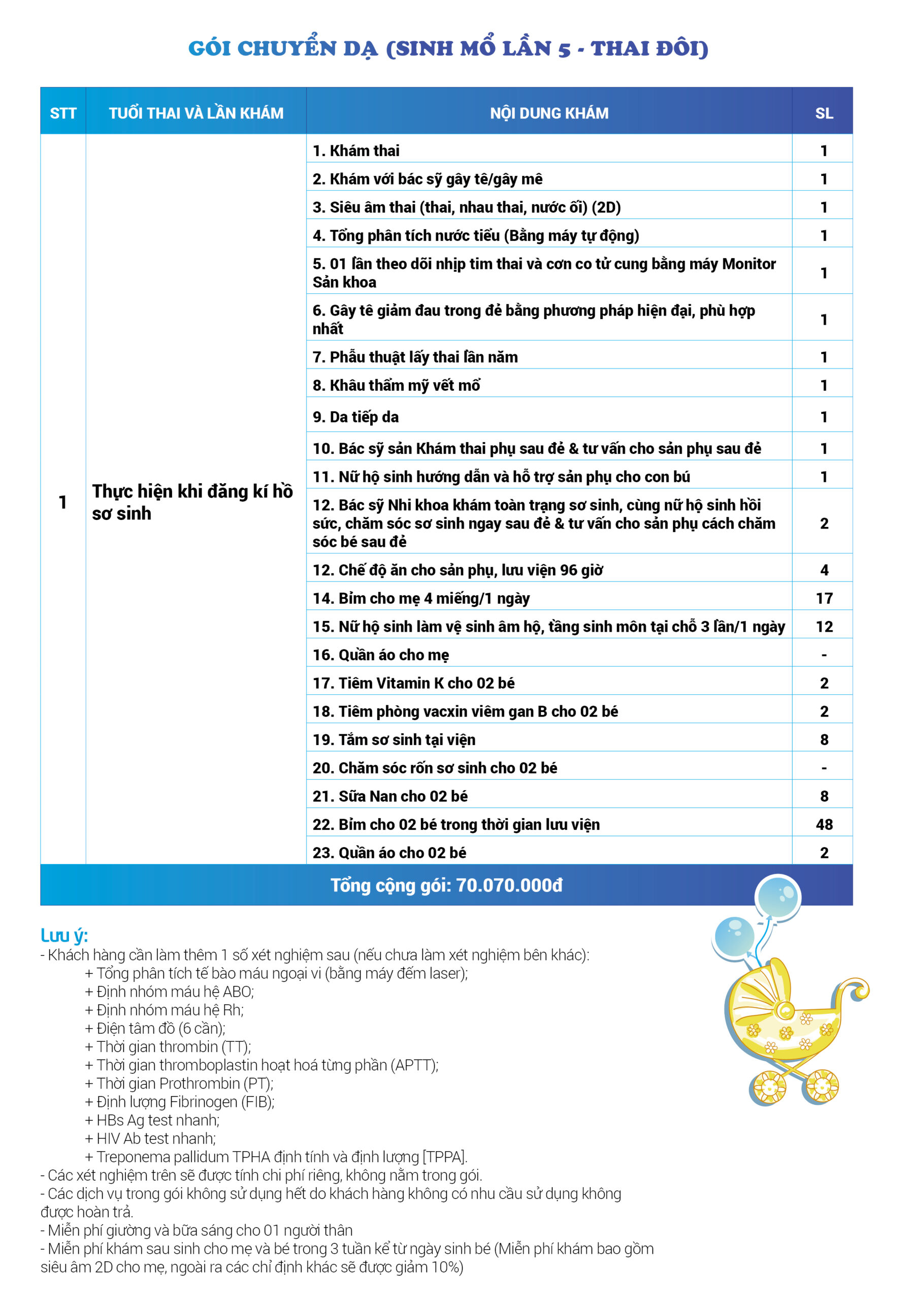 | 96 | Gói Thai sản chuyển dạ (Sinh mổ) - Lần 5 - Thai đôi - Gói Thường | 70.070.000 | 0 |
