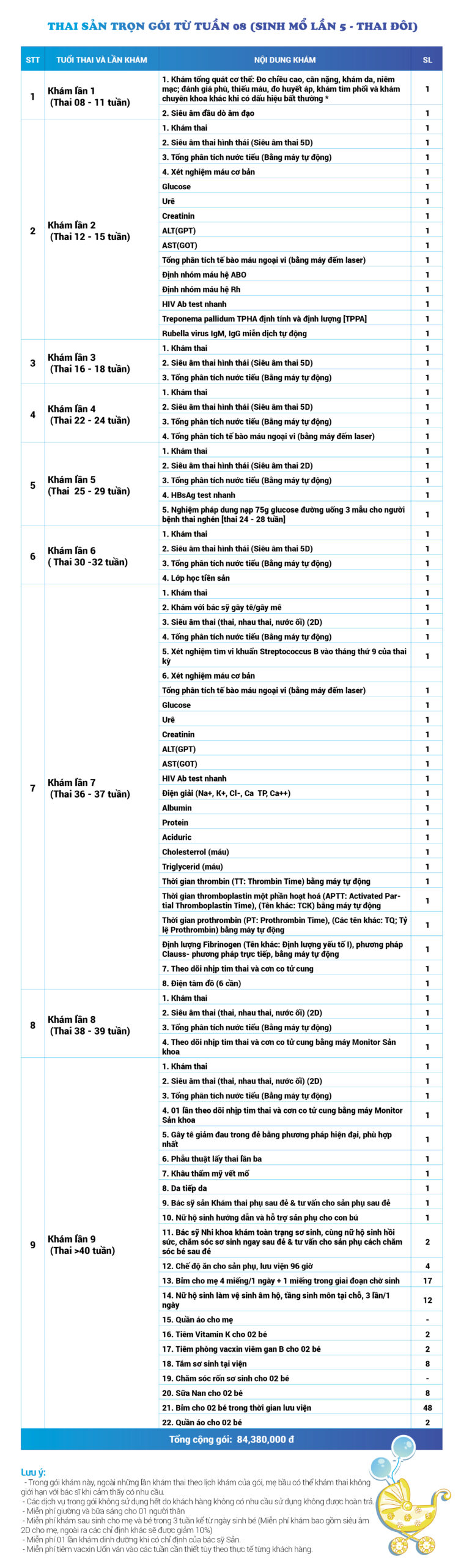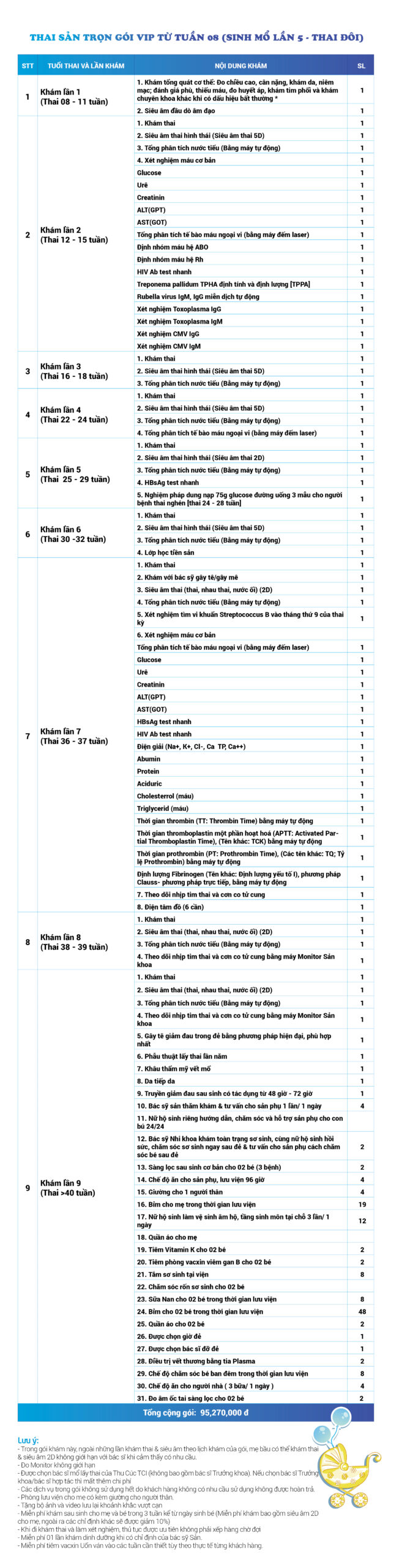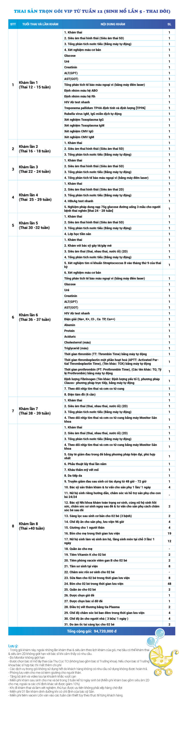 | 12 | Gói Thai sản trọn gói từ tuần 08 (Sinh mổ) - Lần 5 - Thai đôi - Gói Vip | 95.270.000 | 0 |