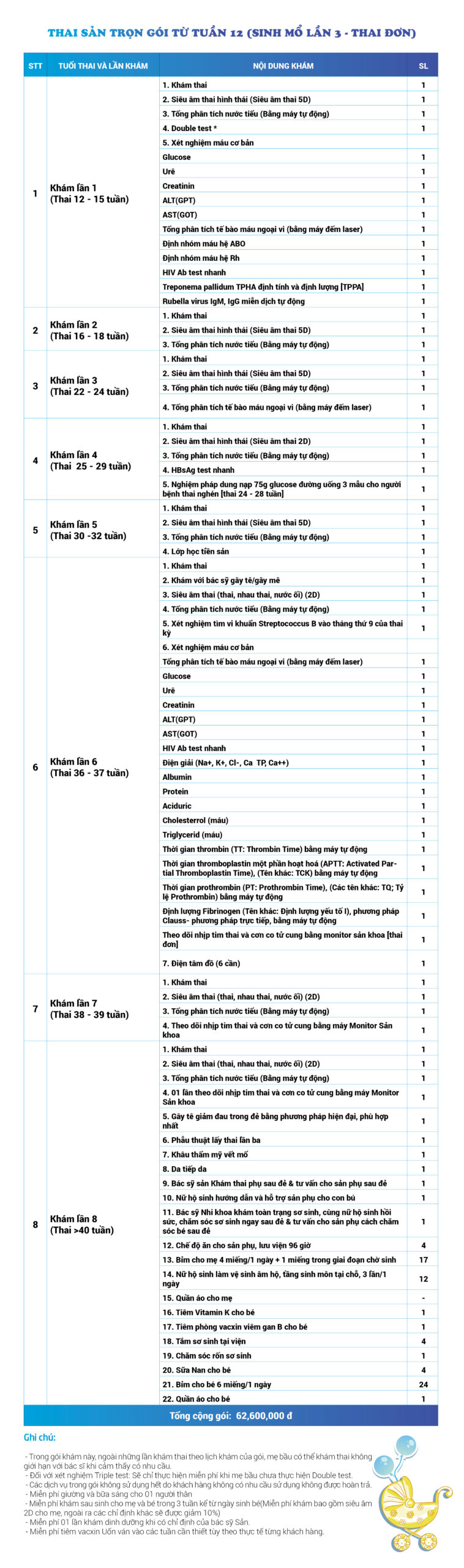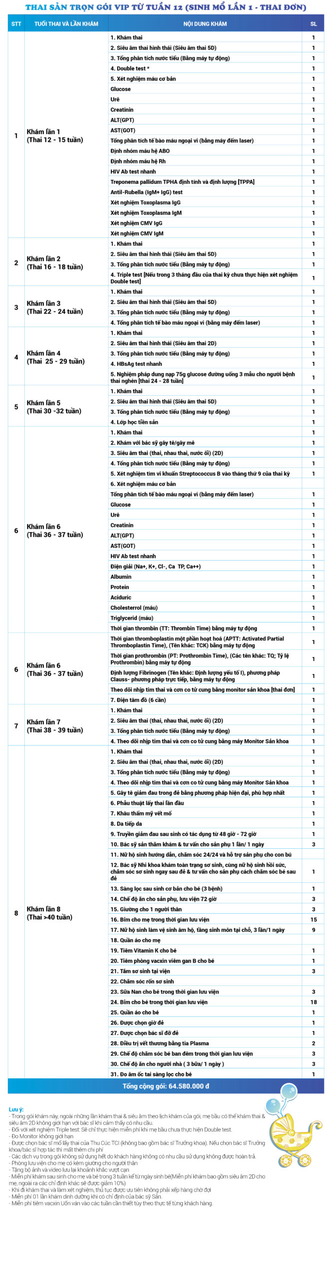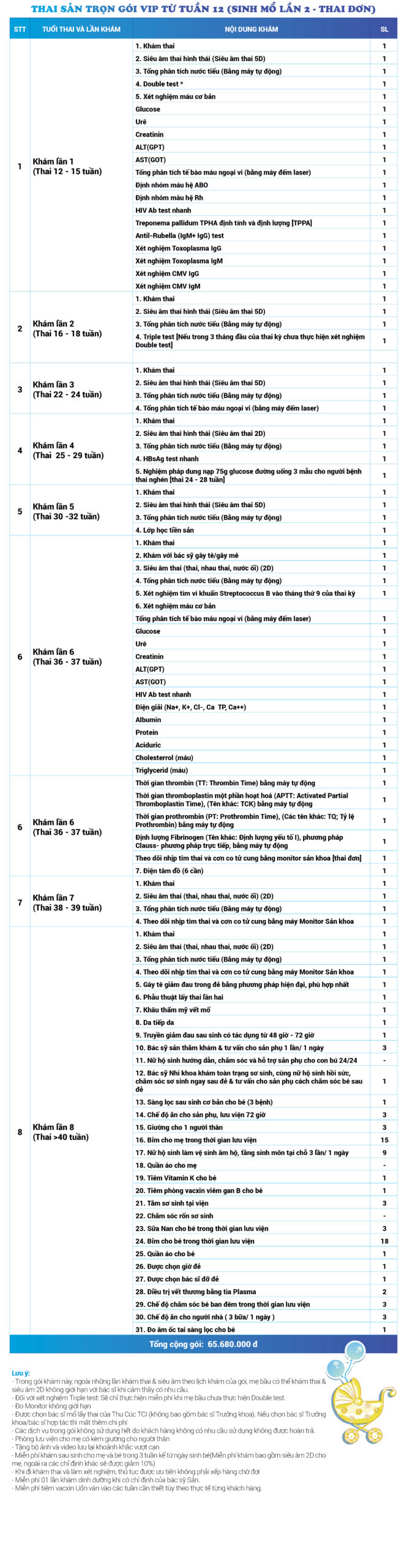 | 14 | Gói Thai sản trọn gói từ tuần 12 (Sinh mổ) - Lần 1 - Thai đơn - Gói Vip | 64.580.000 | 0 |
