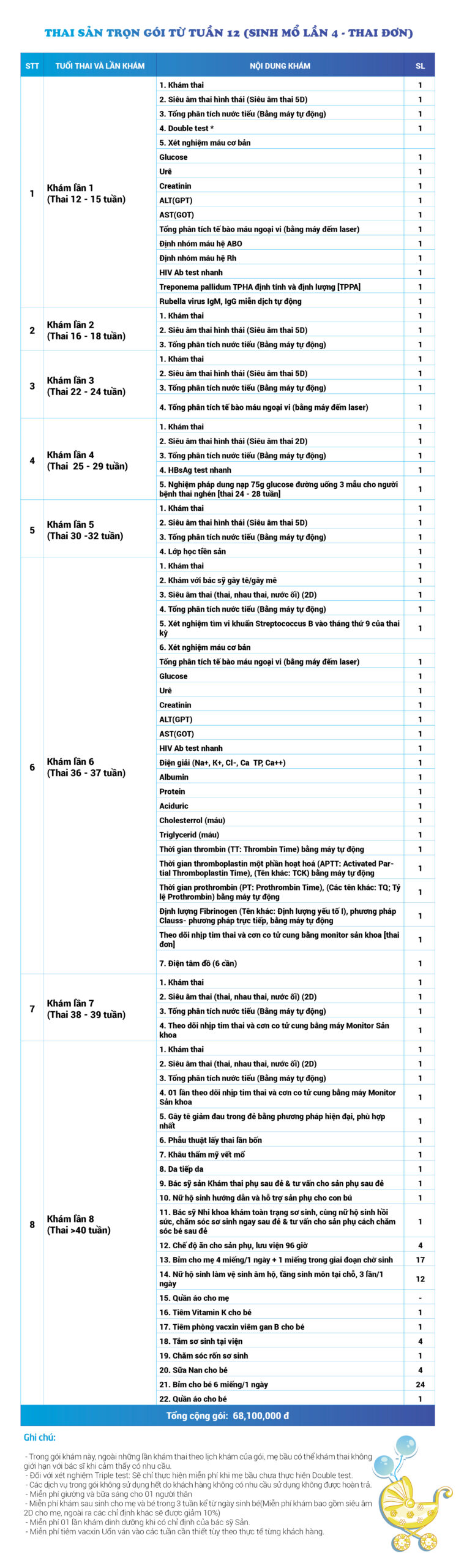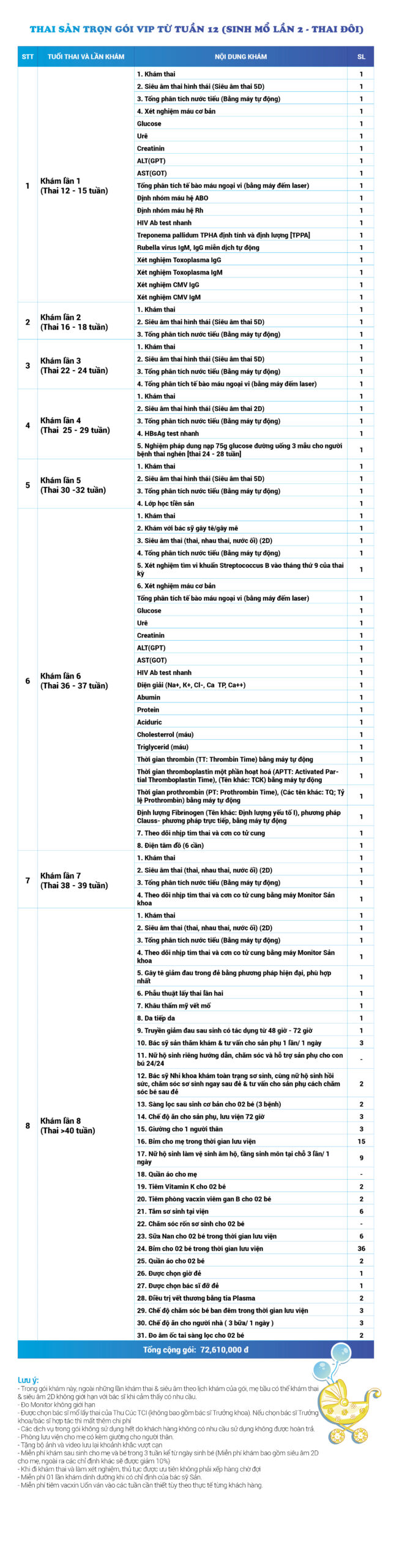 | 8 | Gói Thai sản trọn gói từ tuần 08 (Sinh mổ) - Lần 1 - Thai đôi - Gói Vip | 72.060.000 | 0 |