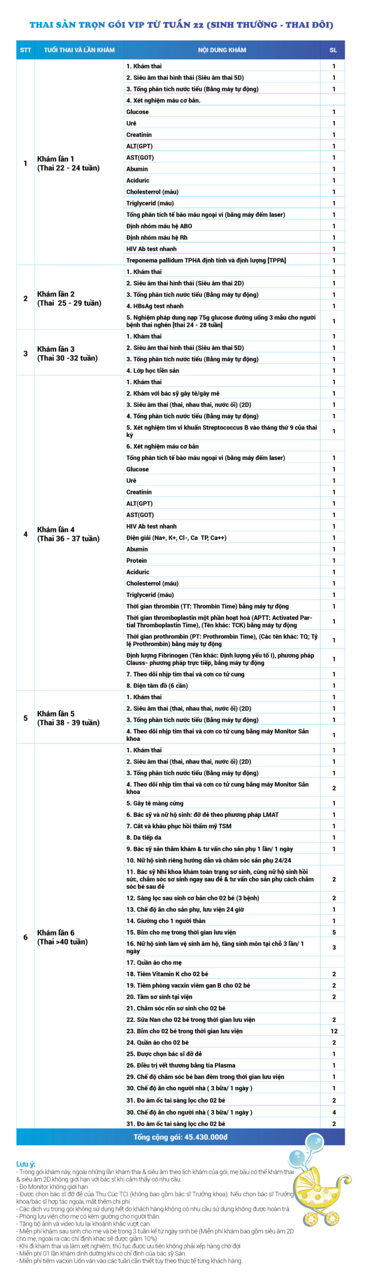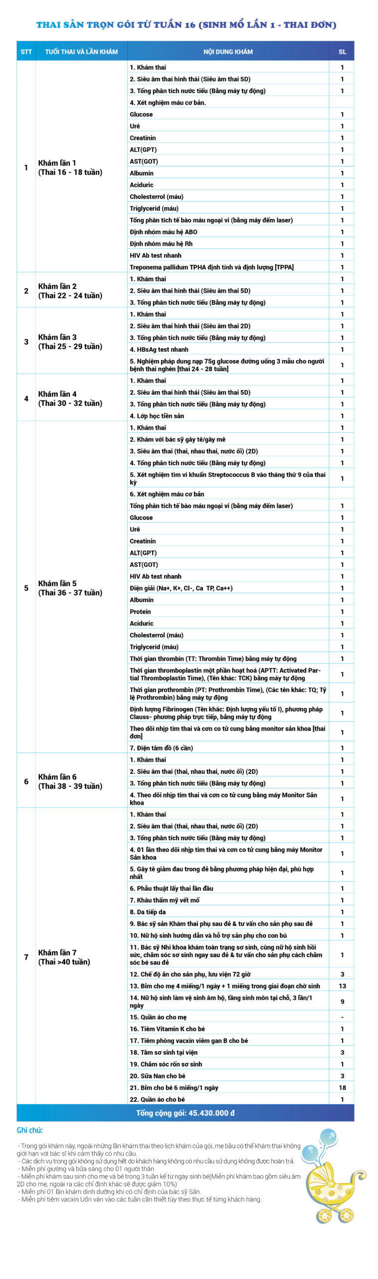 | 43 | Gói Thai sản trọn gói từ tuần 22 (Sinh thường) - Thai đôi - Gói Vip | 45.430.000 | 0 |