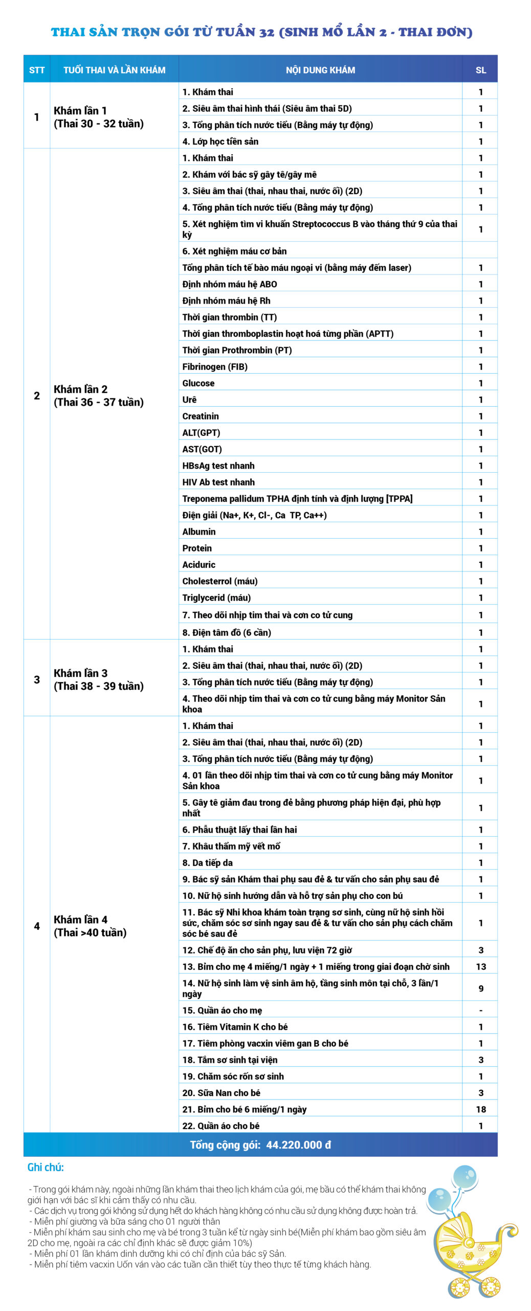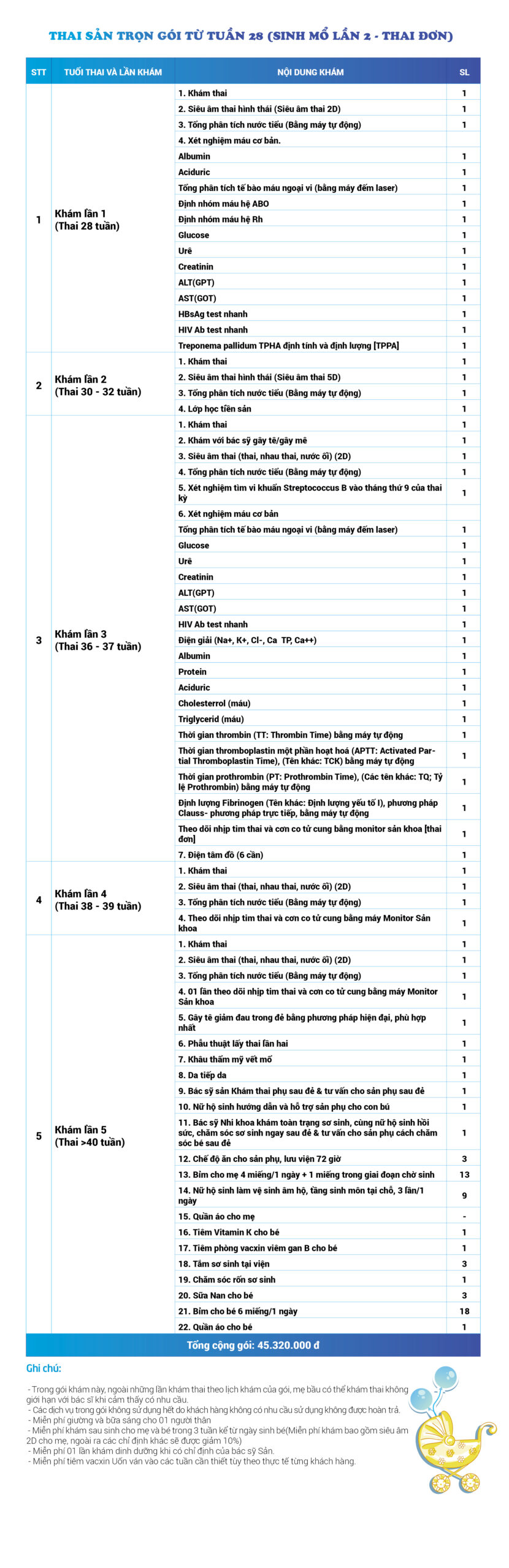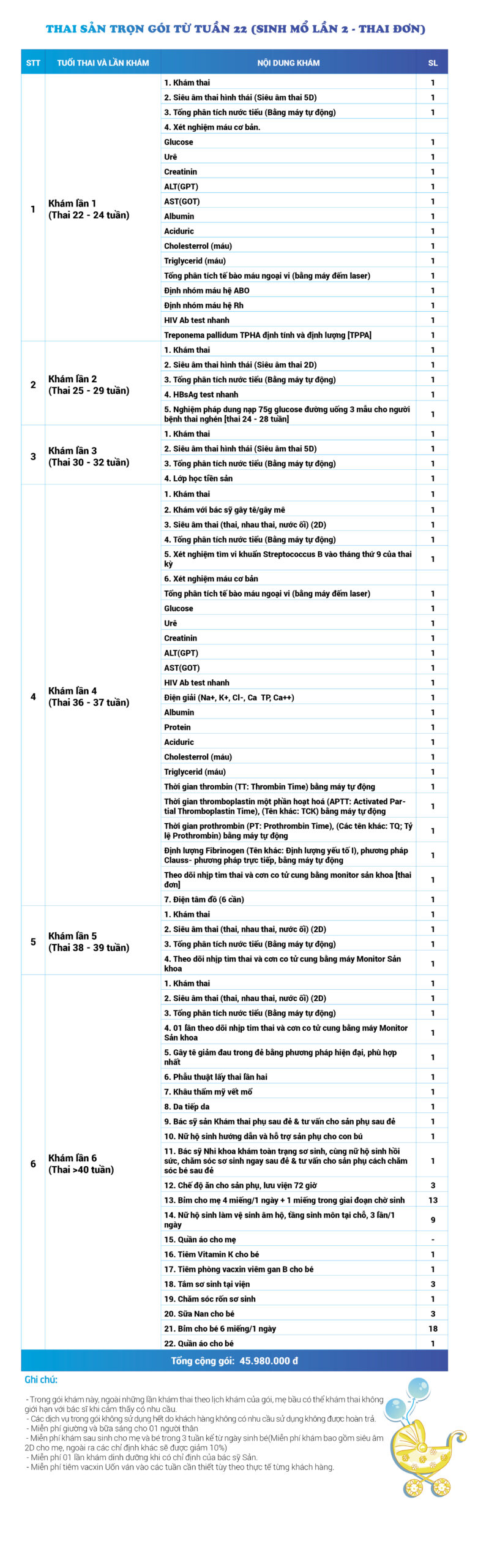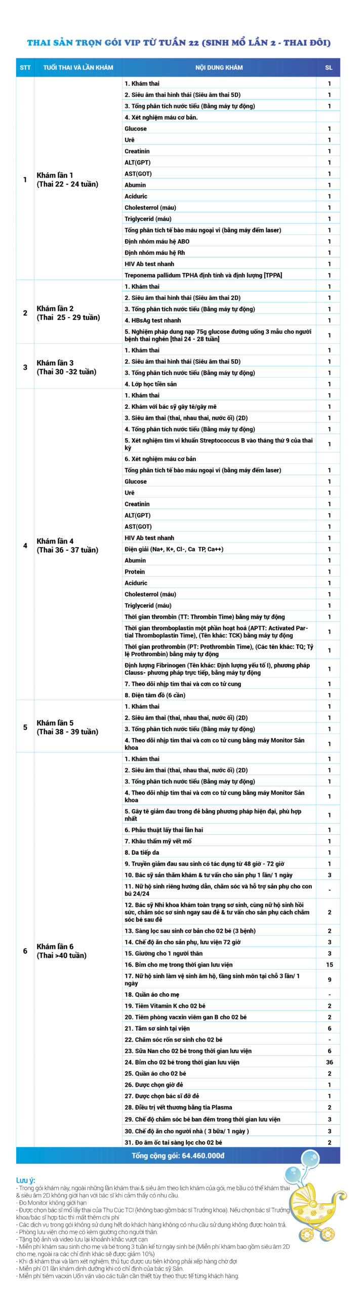| 45 | Gói Thai sản trọn gói từ tuần 22 (Sinh mổ) - Lần 2 - Thai đôi - Gói Vip | 64.460.000 | 0 |