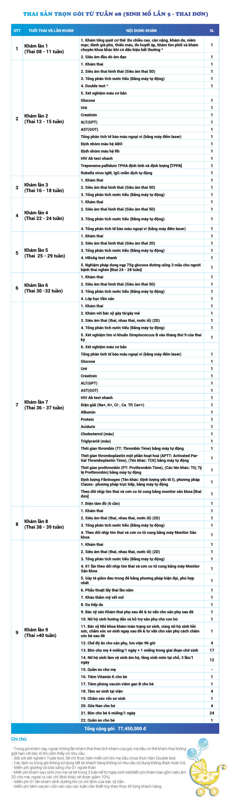 | 78 | Gói Thai sản trọn gói từ tuần 36 (Sinh mổ) - Lần 5 - Thai đơn - Gói Vip | 77.550.000 | 0 |