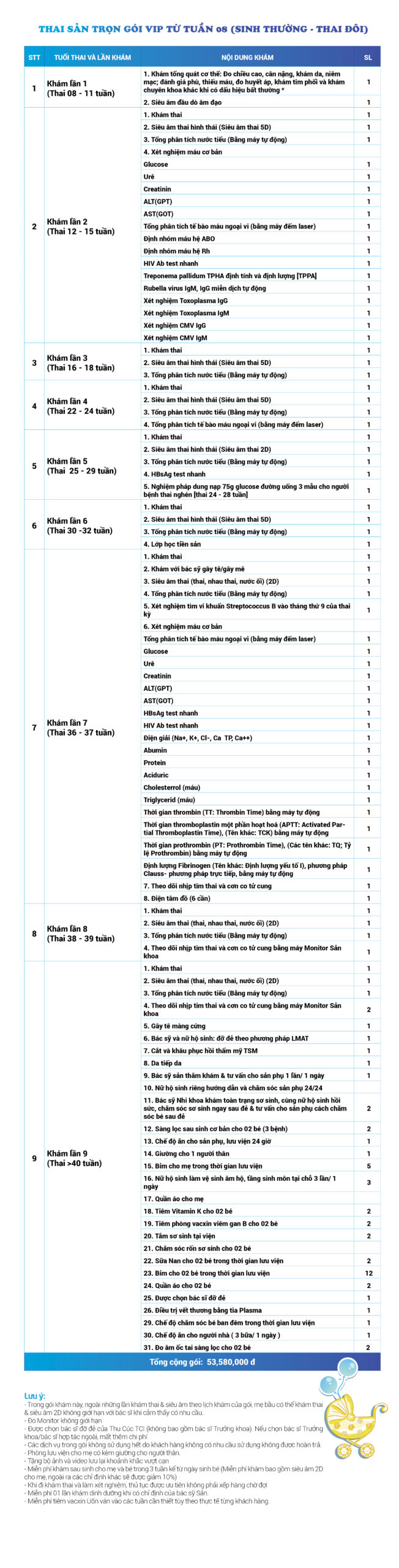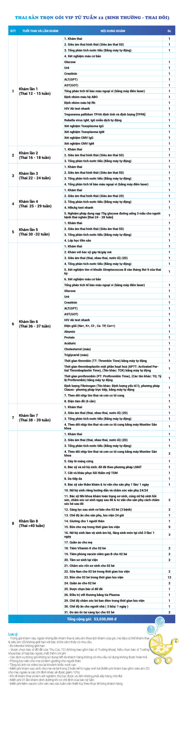 | 7 | Gói Thai sản trọn gói từ tuần 08 (Sinh thường) - Thai đôi - Gói Vip | 53.580.000 | 0 |