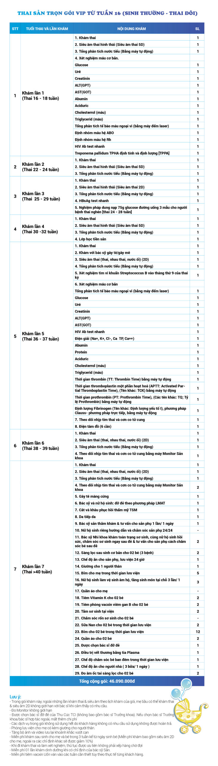 | 31 | Gói Thai sản trọn gói từ tuần 16 (Sinh thường) - Thai đôi - Gói Vip | 46.090.000 | 0 |