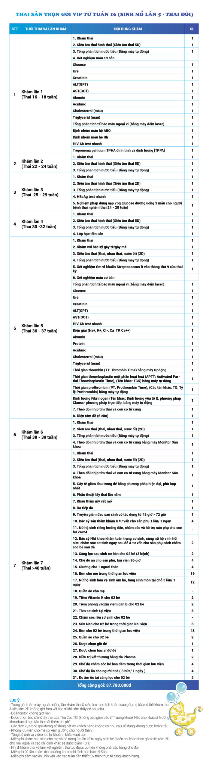 | 36 | Gói Thai sản trọn gói từ tuần 16 (Sinh mổ) - Lần 5 - Thai đôi - Gói Vip | 87.780.000 | 0 |