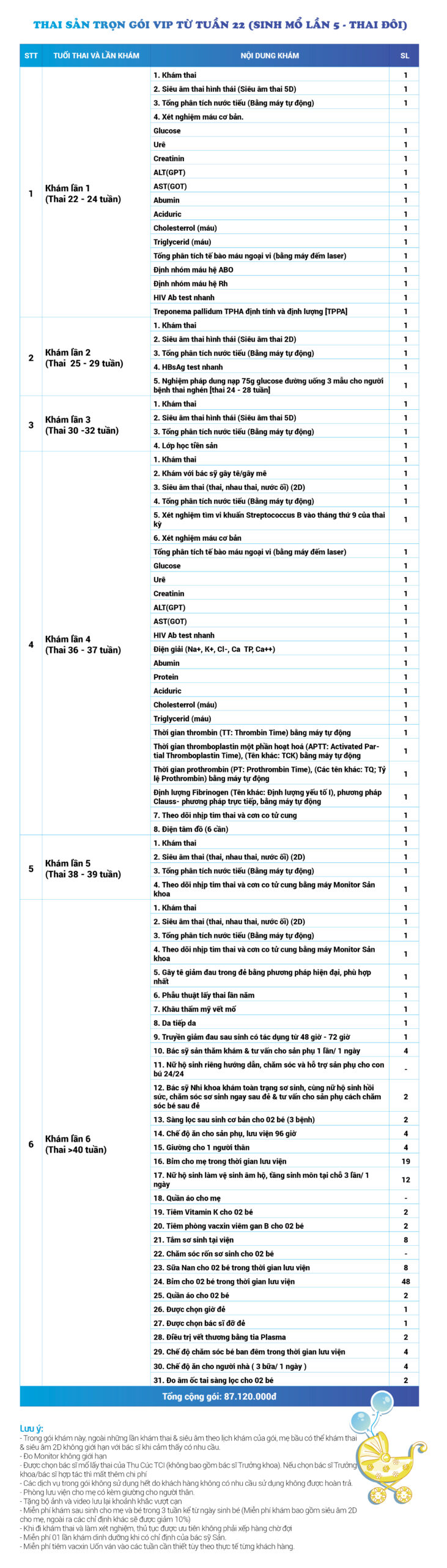 | 48 | Gói Thai sản trọn gói từ tuần 22 (Sinh mổ) - Lần 5 - Thai đôi - Gói Vip | 87.120.000 | 0 |