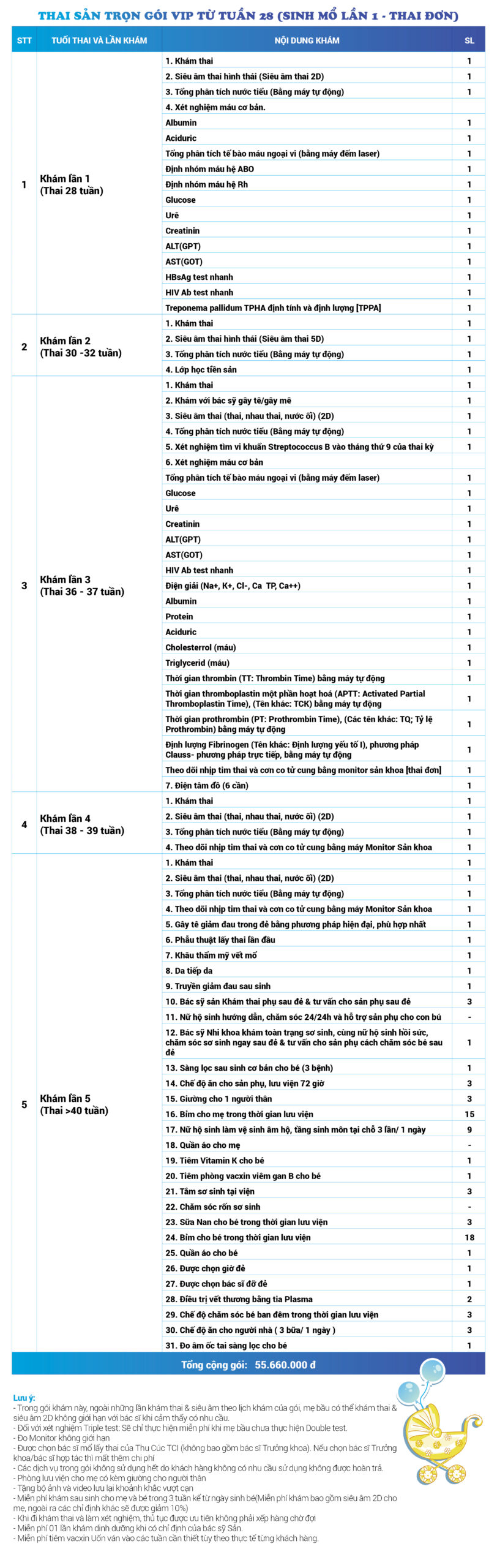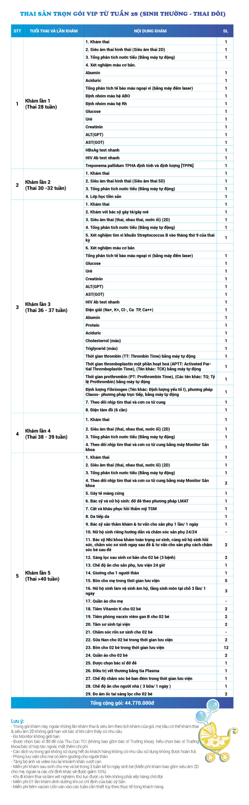 | 55 | Gói Thai sản trọn gói từ tuần 28 (Sinh thường) - Thai đôi - Gói Vip | 44.770.000 | 0 |