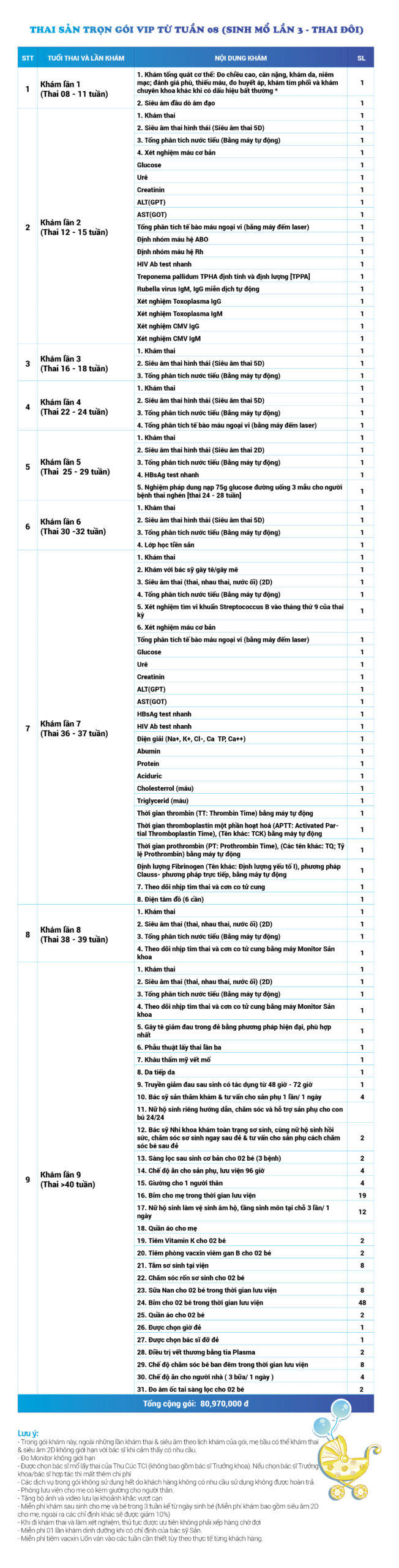 | 10 | Gói Thai sản trọn gói từ tuần 08 (Sinh mổ) - Lần 3 - Thai đôi - Gói Vip | 80.970.000 | 0 |