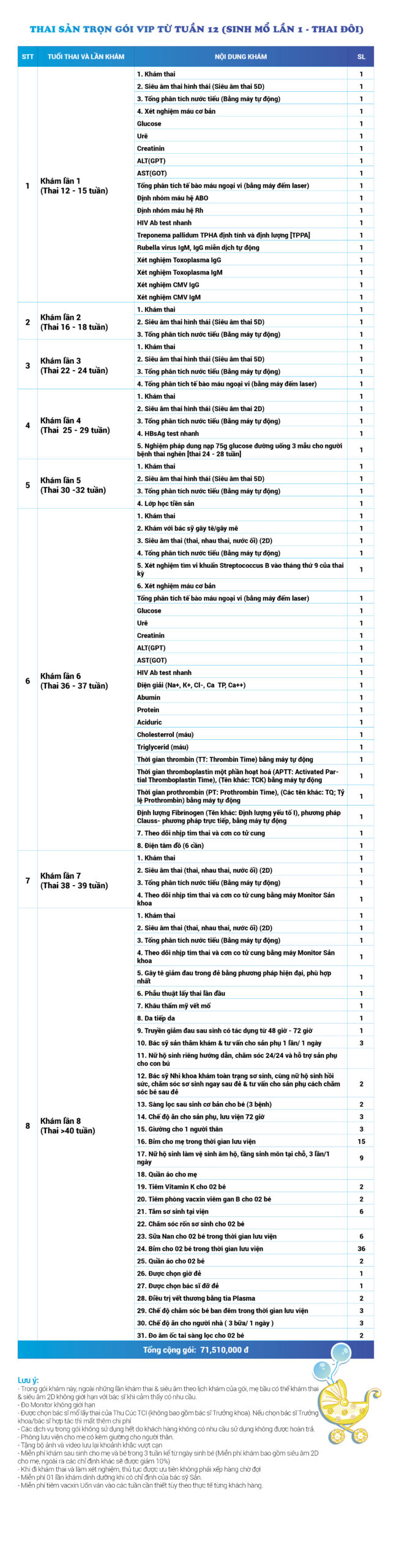 | 20 | Gói Thai sản trọn gói từ tuần 12 (Sinh mổ) - Lần 1 - Thai đôi - Gói Vip | 71.510.000 | 0 |