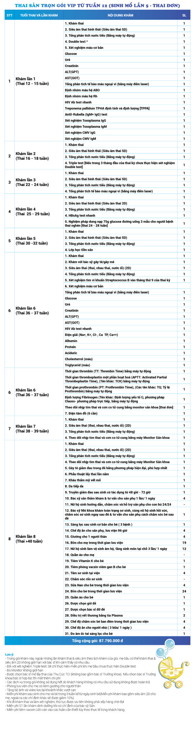 | 18 | Gói Thai sản trọn gói từ tuần 12 (Sinh mổ) - Lần 5 - Thai đơn - Gói Vip | 87.790.000 | 0 |