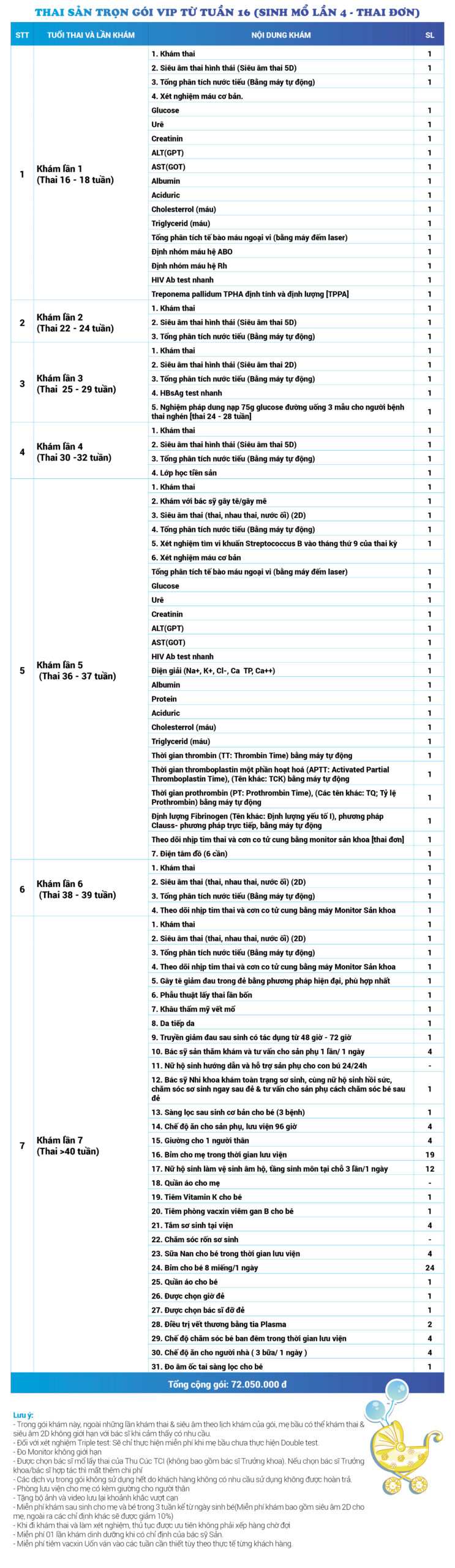 | 29 | Gói Thai sản trọn gói từ tuần 16 (Sinh mổ) - Lần 4 - Thai đơn - Gói Vip | 72.050.000 | 0 |