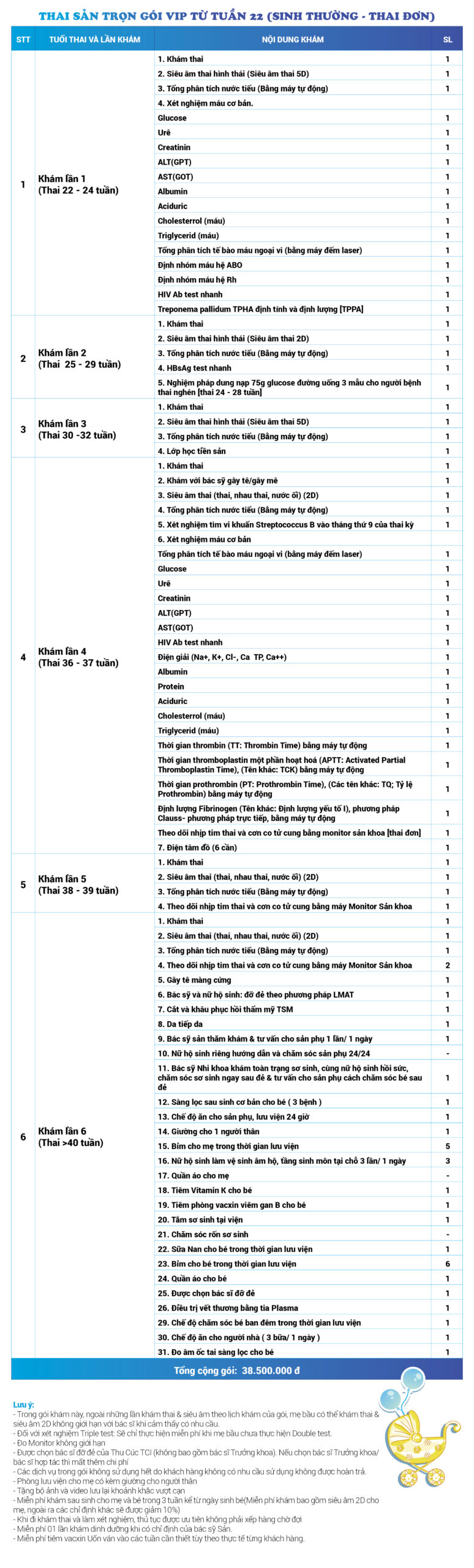 | 37 | Gói Thai sản trọn gói từ tuần 22 (Sinh thường) - Thai đơn - Gói Vip | 38.500.000 | 0 |