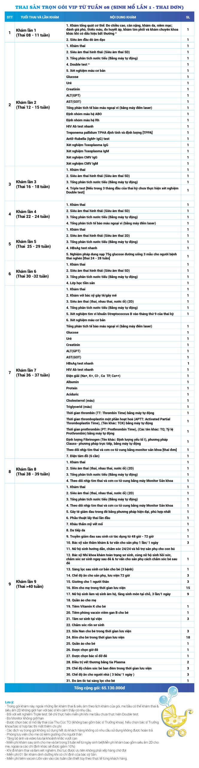 | 2 | Gói Thai sản trọn gói từ tuần 08 (Sinh mổ) - Lần 1 - Thai đơn - Gói Vip | 65.130.000 | 0 |