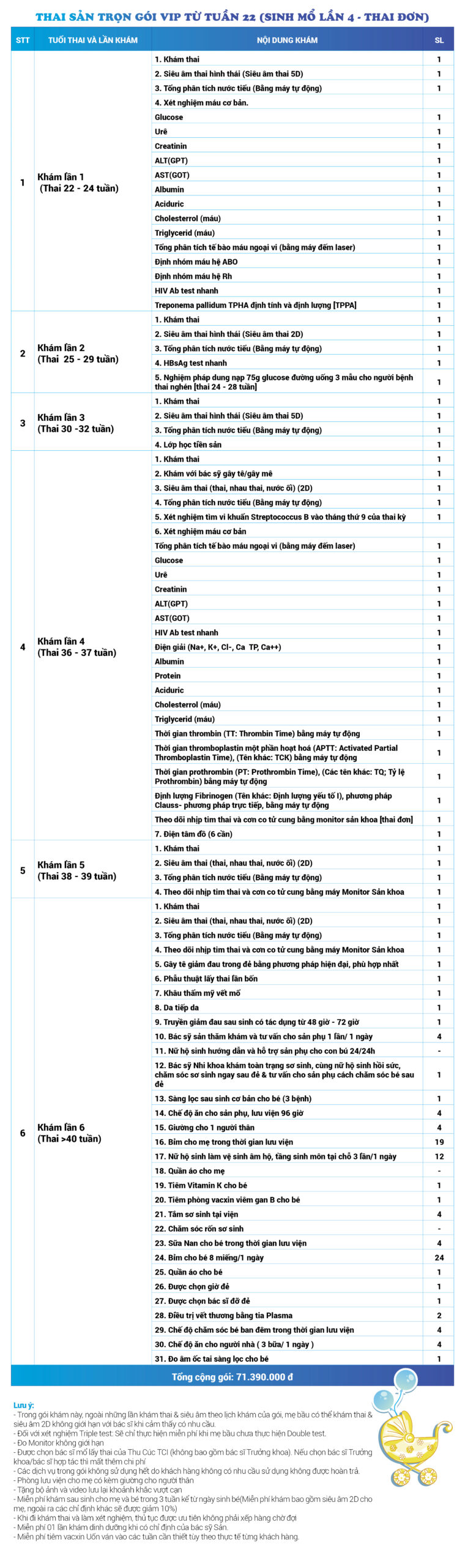 | 41 | Gói Thai sản trọn gói từ tuần 22 (Sinh mổ) - Lần 4 - Thai đơn - Gói Vip | 71.390.000 | 0 |