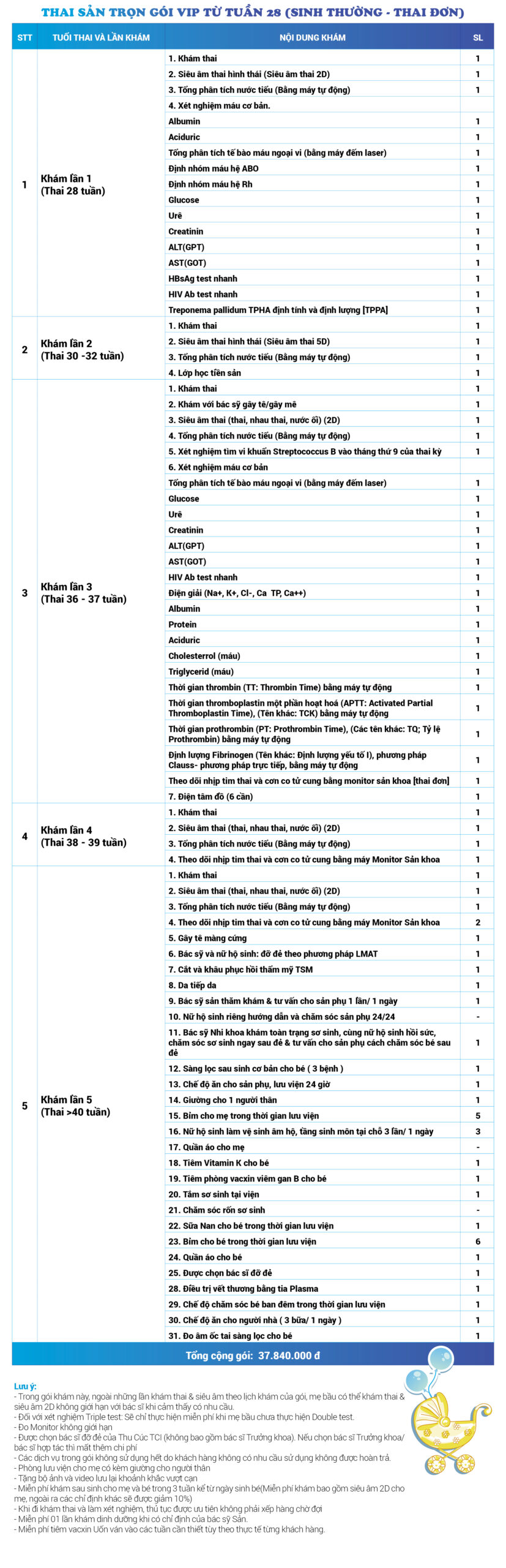 | 49 | Gói Thai sản trọn gói từ tuần 28 (Sinh thường) - Thai đơn - Gói Vip | 37.840.000 | 0 |