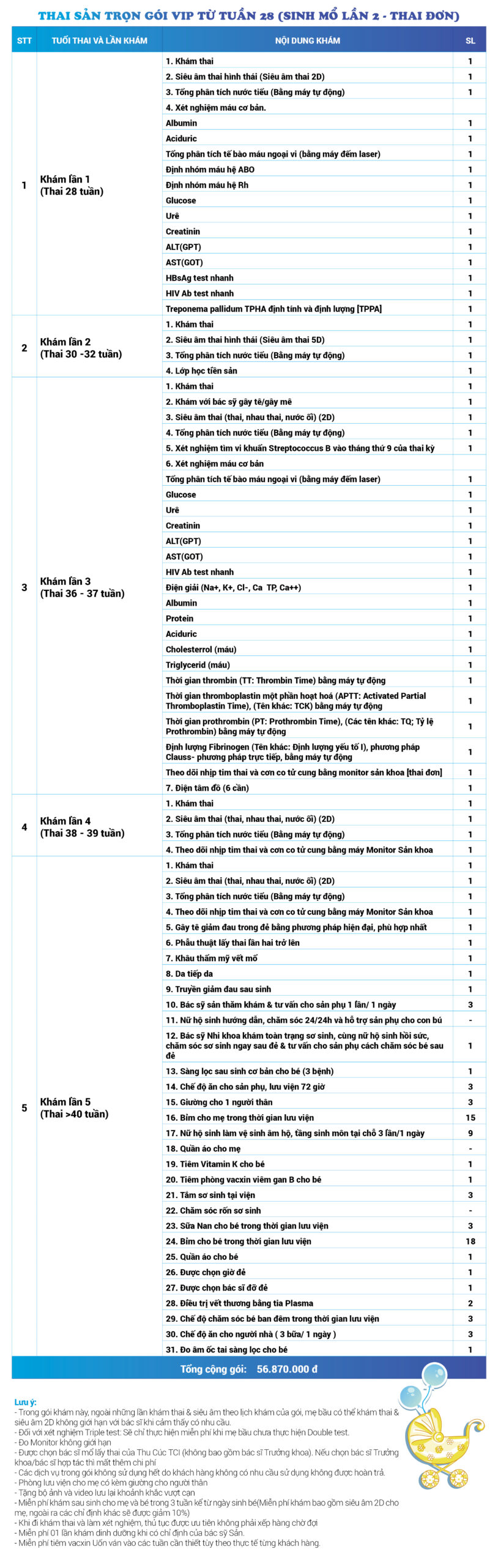 | 51 | Gói Thai sản trọn gói từ tuần 28 (Sinh mổ) - Lần 2 - Thai đơn - Gói Vip | 56.870.000 | 0 |