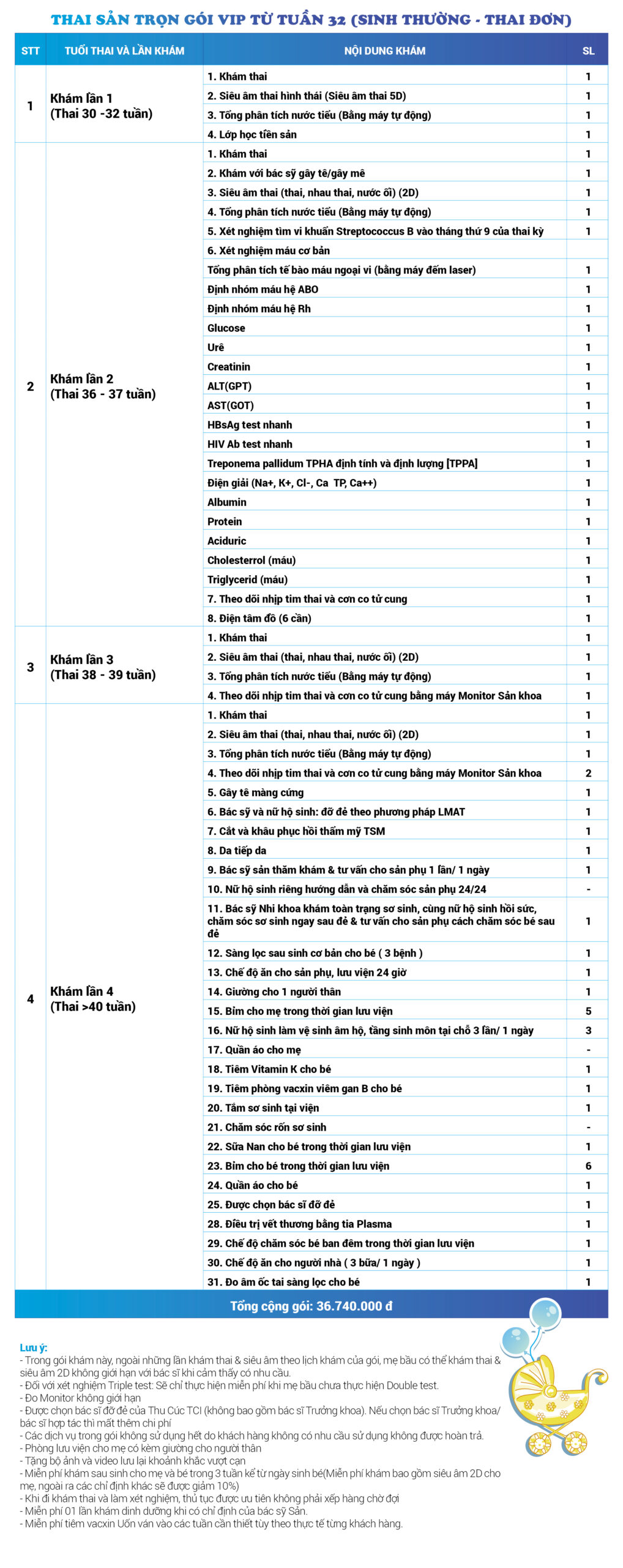| 61 | Gói Thai sản trọn gói từ tuần 32 (Sinh thường) - Thai đơn - Gói Vip | 36.740.000 | 0 |