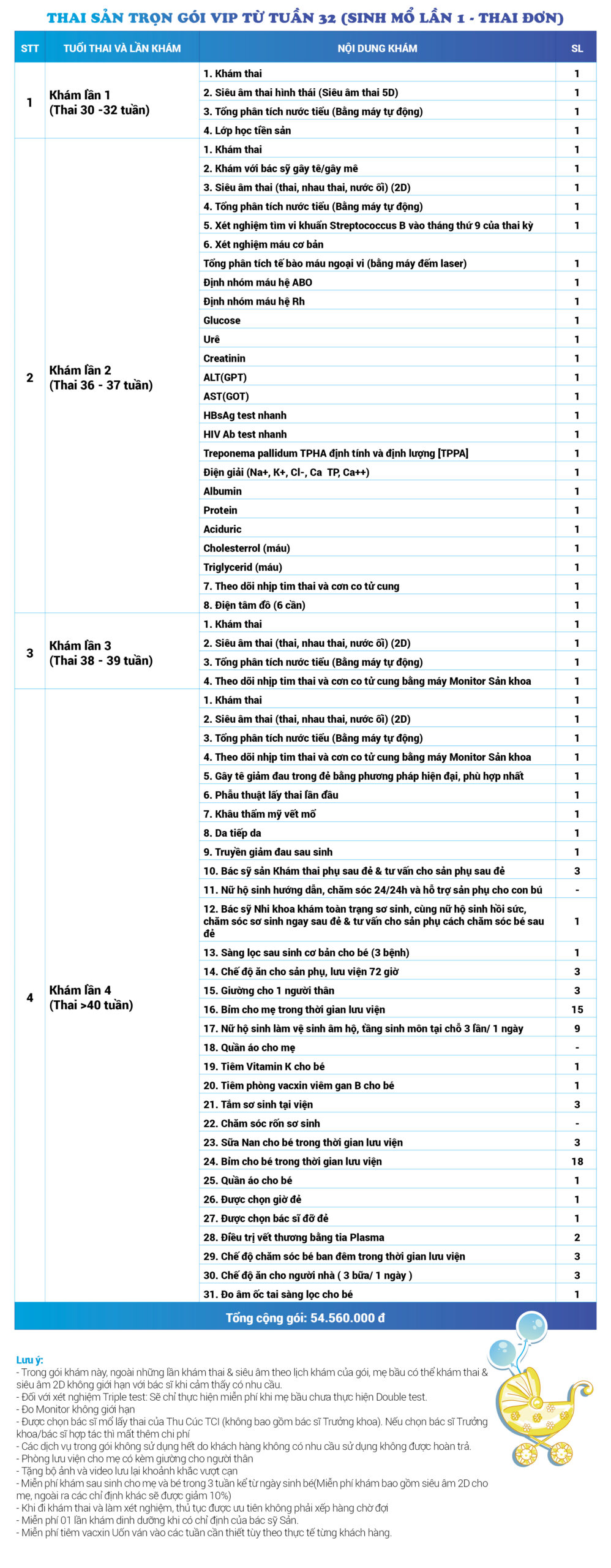 | 62 | Gói Thai sản trọn gói từ tuần 32 (Sinh mổ) - Lần 1 - Thai đơn - Gói Vip | 54.560.000 | 0 |