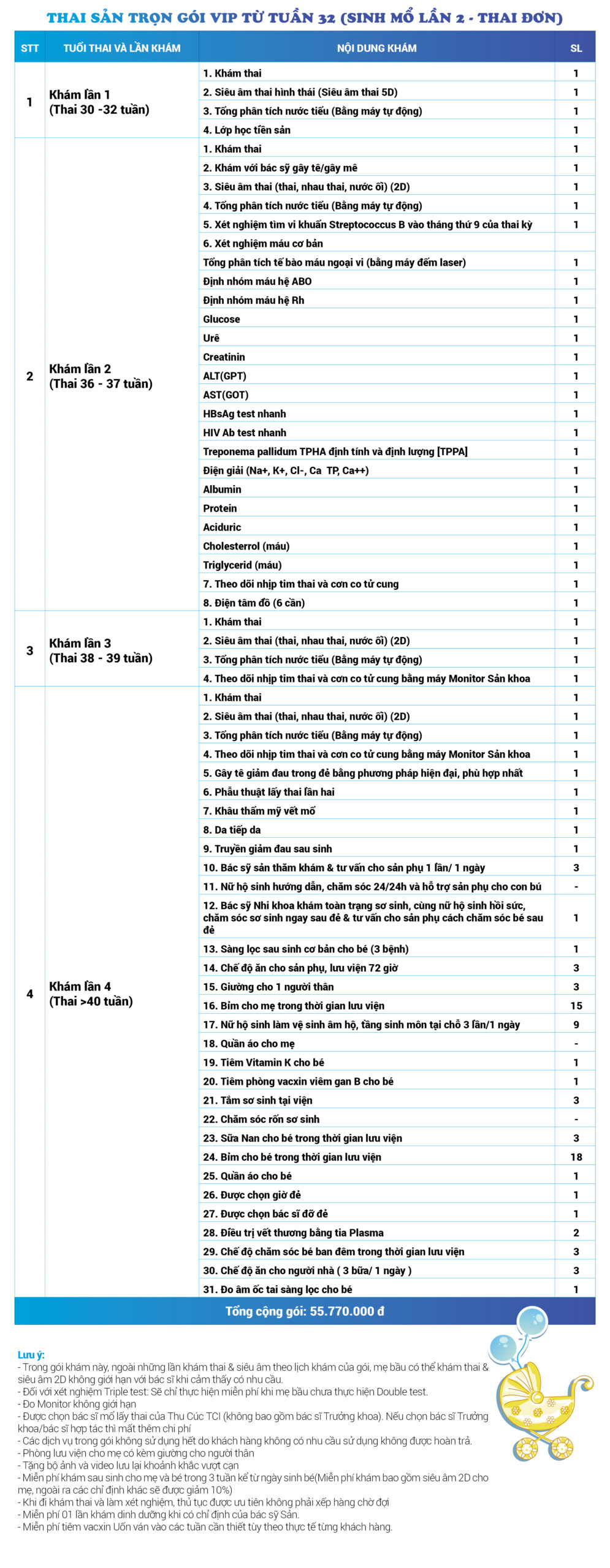 | 63 | Gói Thai sản trọn gói từ tuần 32 (Sinh mổ) - Lần 2 - Thai đơn - Gói Vip | 55.770.000 | 0 |