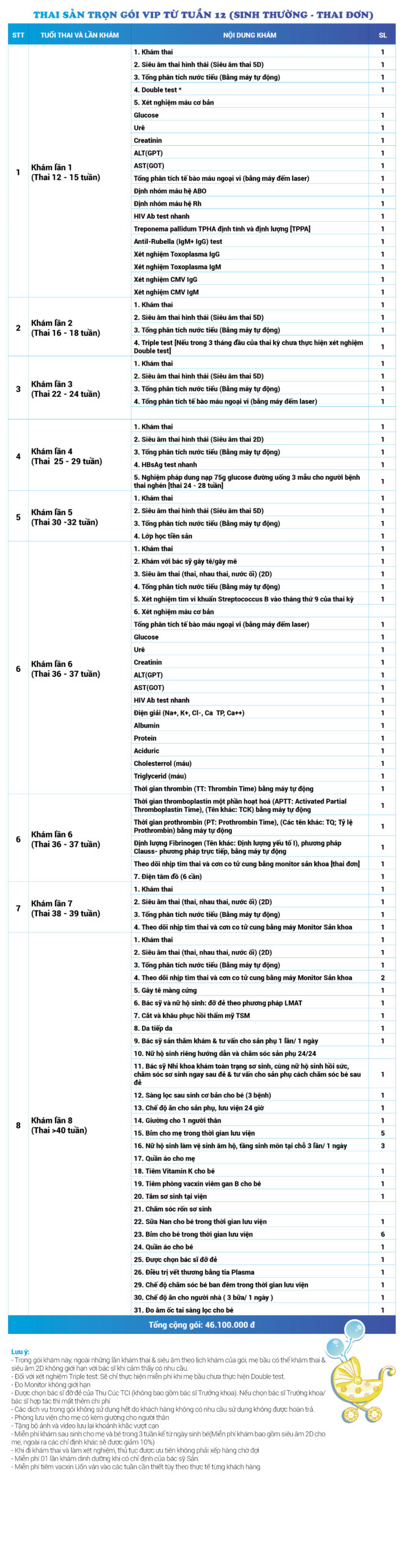 | 13 | Gói Thai sản trọn gói từ tuần 12 (Sinh thường) - Thai đơn - Gói Vip | 46.100.000 | 0 |