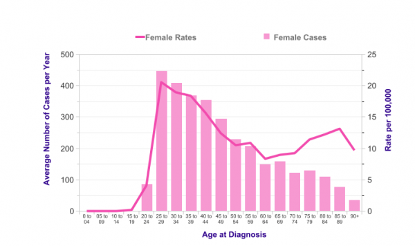 Tại Việt Nam, chưa có thông kê cụ thể về độ tuổi mắc ung thư cổ tử cung, tuy nhiên chúng ta có thể nhìn vào biểu đồ thống kê tại Anh năm 2012-2014.